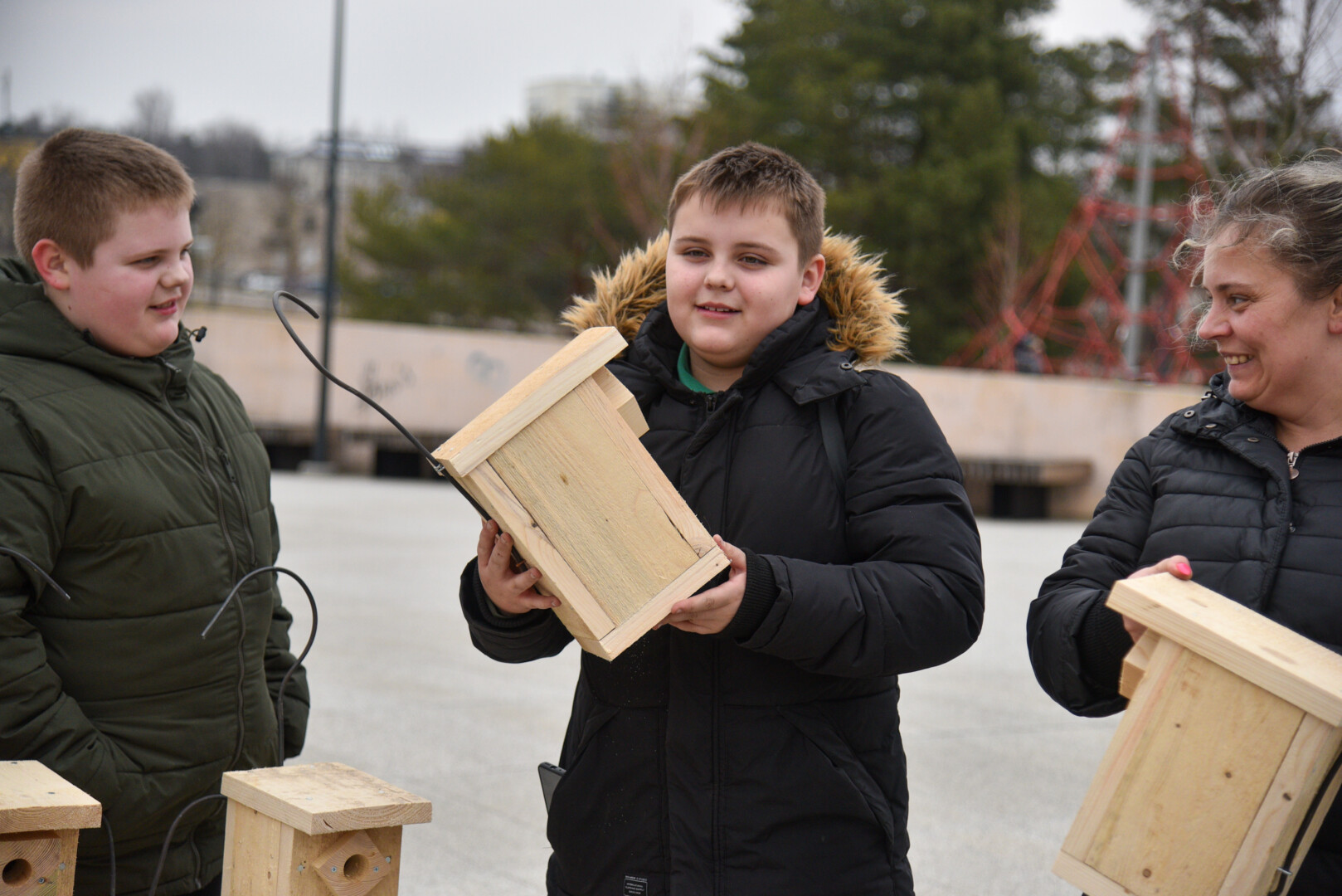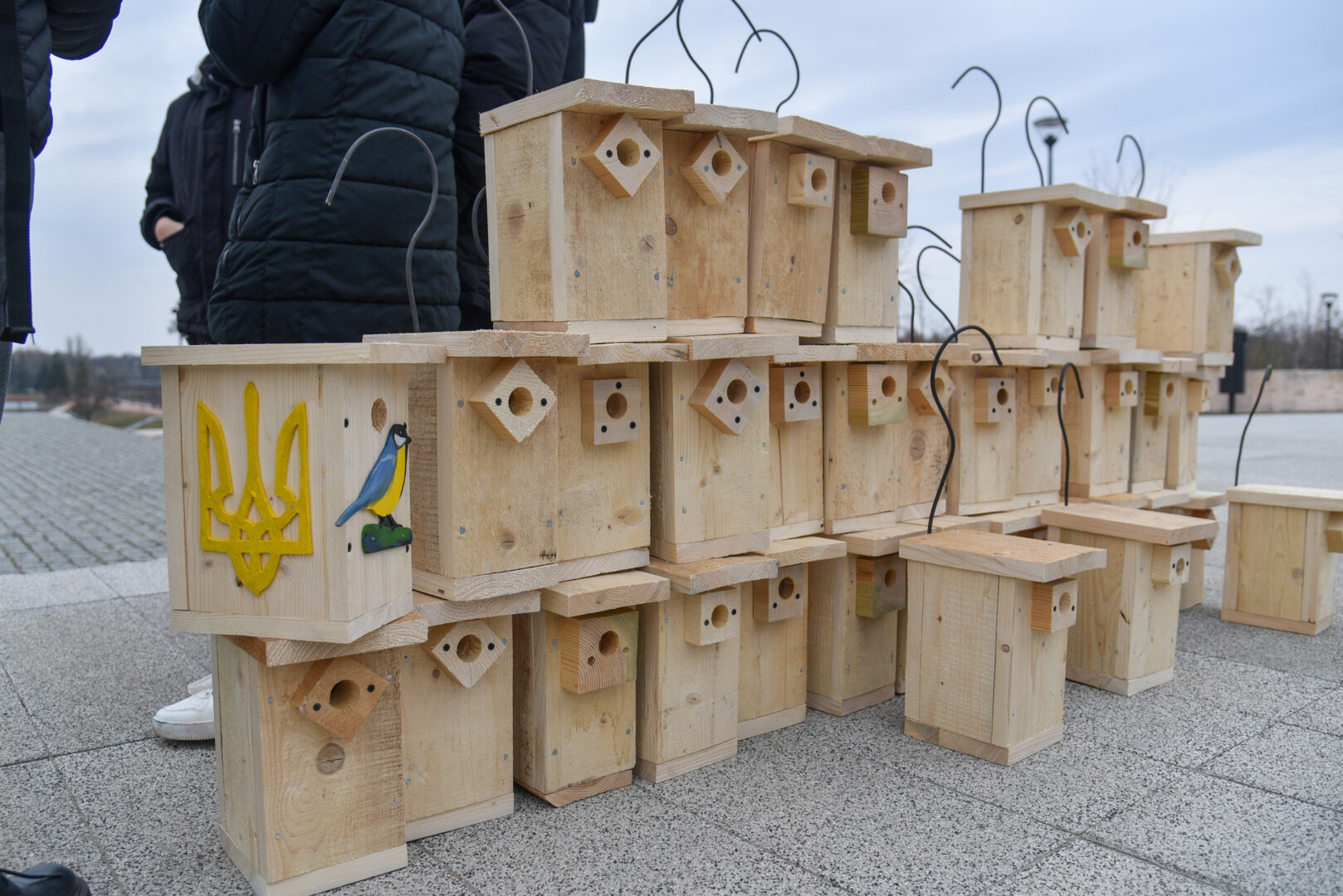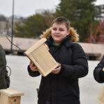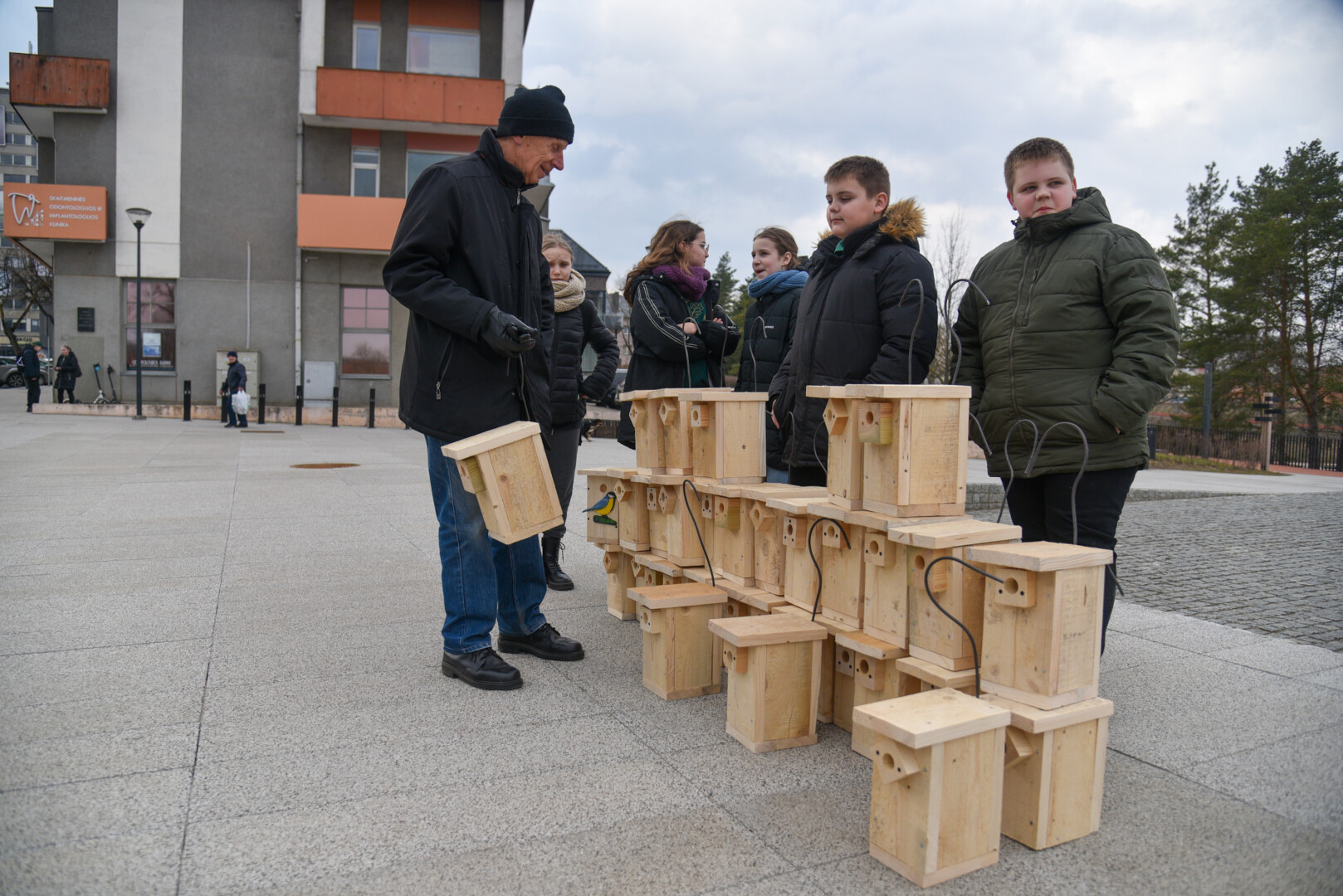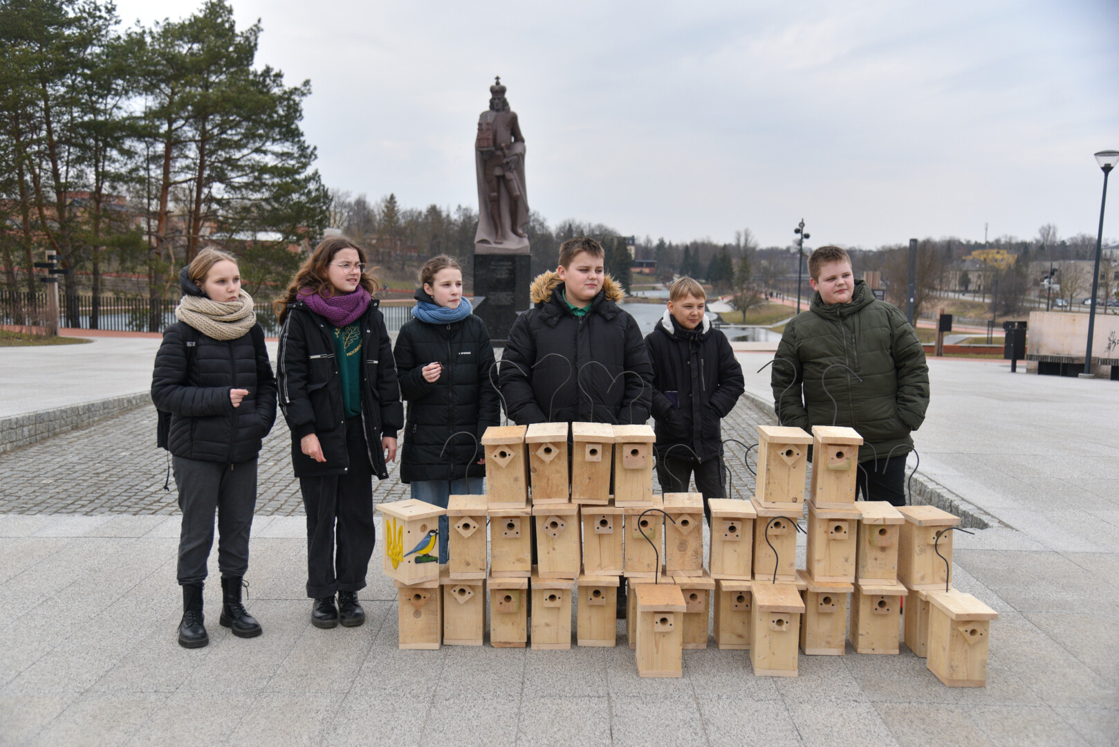 Panevėžio „Ąžuolo“ progimnazijos mokiniai Laisvės aikštėje, prie Aleksandro paminklo, panevėžiečiams atvežė sukalę keturias dešimtis inkilų sparnuočiams.
