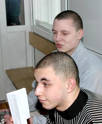 S.Kašino nuotr. Stikliniame teisiamųjų narve bylos nagrinėjimo laukiantys egzekucijos dalyviai: V.Fetingis (šviesiu treningu) ir M.Razma (dryžuotu megztiniu) veidų nuo fotoobjektyvų nedangstė.