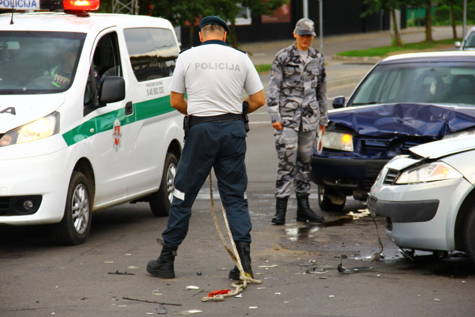 Netrukus policijos pareigūnai buvo iškviesti į Klaipėdos ir Nemuno gatvių sankryžą, kur susidūrė automobiliai „Renault“ ir „Volkswagen“. Pirminiais duomenimis, „Renault“ vairavusi moteris sankryžoje ketino sukti į kairę, bet tik pradėjusi manevrą trenkėsi į dideliu greičiu pagrindiniu keliu atskriejusį „Volkswagen“. Kadangi moteris savo kaltę pripažino, nukentėjusiųjų nebuvo, eismo dalyviai užsipildė eismo įvykio deklaraciją.