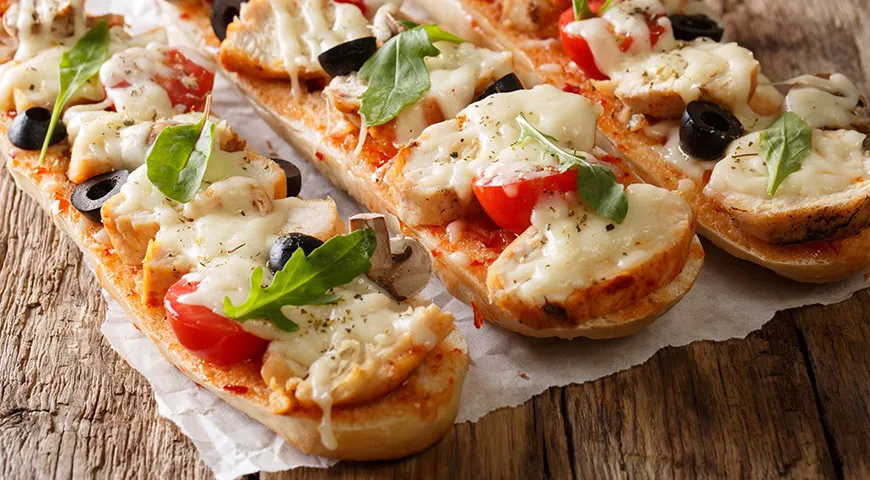 Reikės (4–6 porcijoms): 1 ilgo prancūziško batono, 2 viščiuko krūtinėlės filė, 200 g mocarelos, 4–5 vyšninių pomidorų, 4 nedidukų pievagrybių, juodųjų alyvuogių, pomidorų padažo arba pastos, alyvuogių aliejaus, raudonėlių, gražgarsčių, paprikos miltelių, druskos, šviežiai maltų juodųjų pipirų.