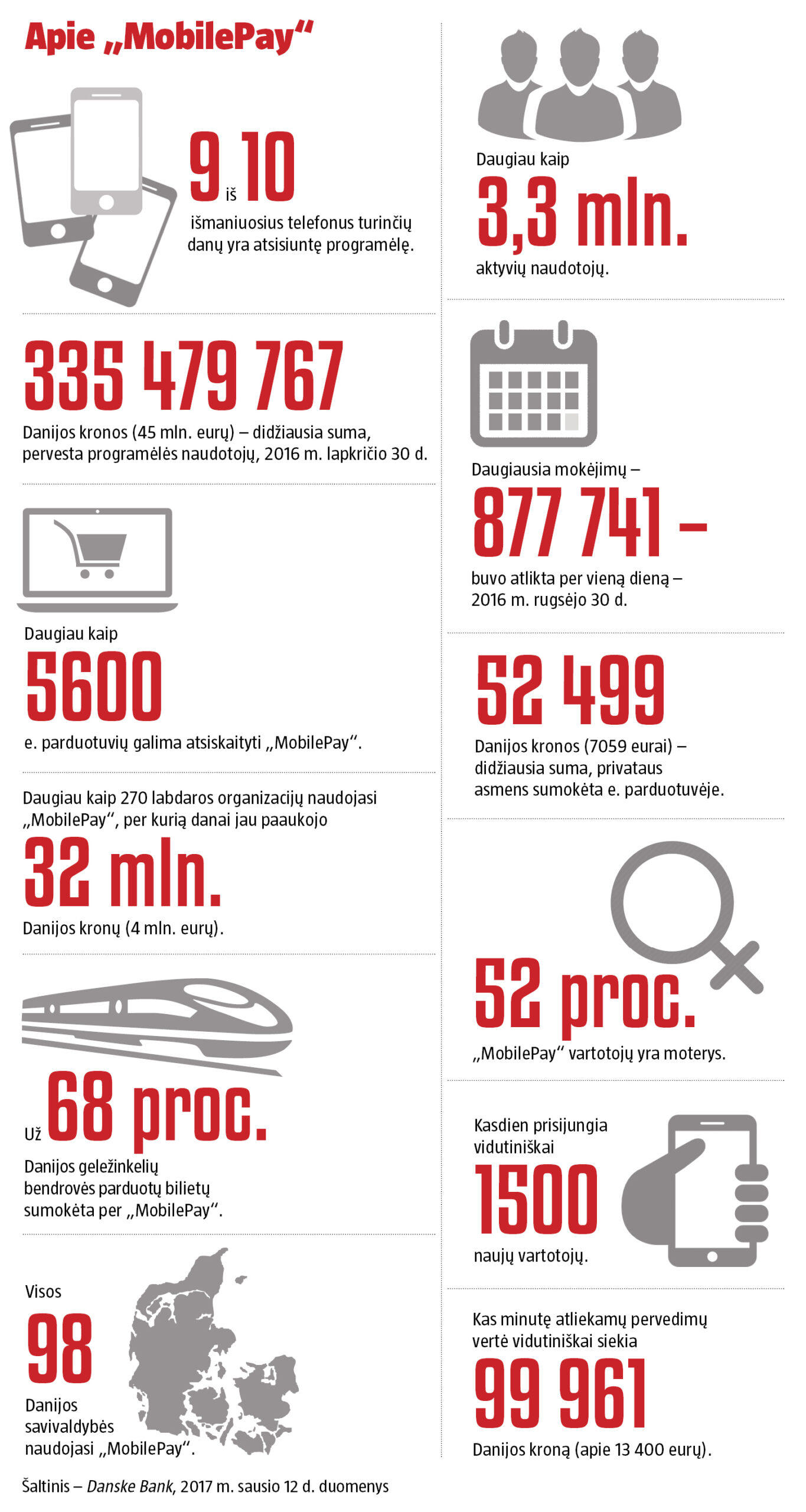 Tokią galimybę danams suteikė programėlė „MobilePay“, pirmą kartą pristatyta dar 2013-aisiais. Šiandien ja aktyviai naudojasi daugiau kaip 3,3 mln. gyventojų – ją yra atsisiuntę 9 iš 10-ies išmaniųjų telefonų savininkų ir per minutę jie vidutiniškai atlieka mokėjimų, kurių vertė siekia 99 961 Danijos kroną (apie 13 400 eurų).