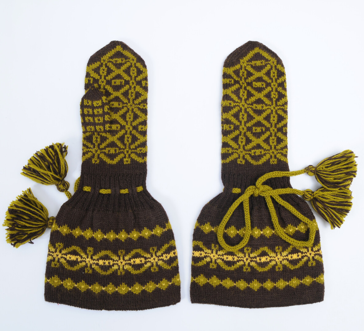 Tarp išsiskiriančių šios tautodailininkės darbų – ilgos pirštinės su raštuotu, ant palto rankovės uždedamu atvartu, puoštos kutais, virvele.