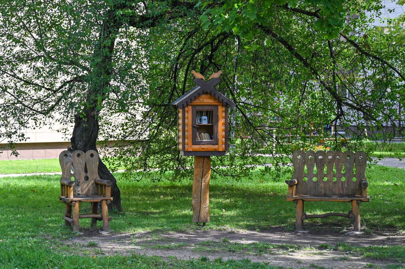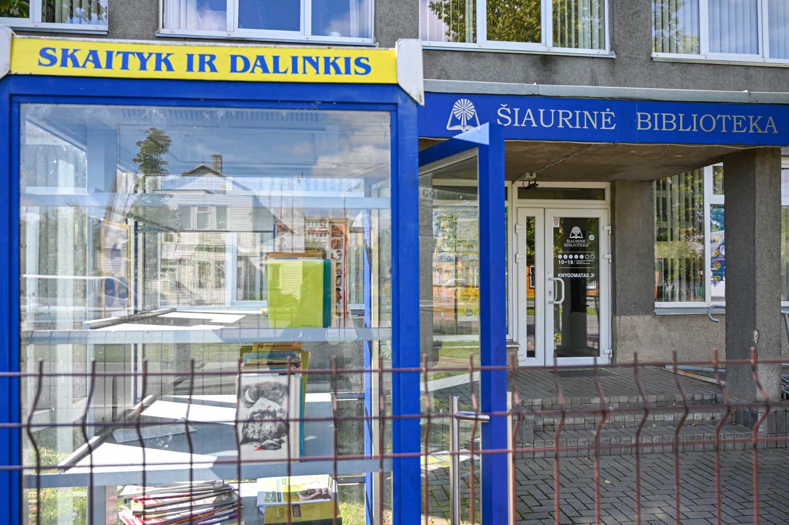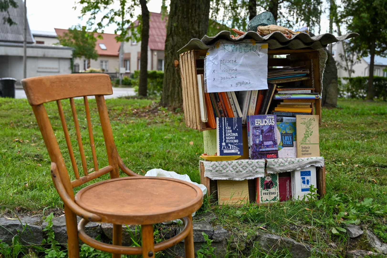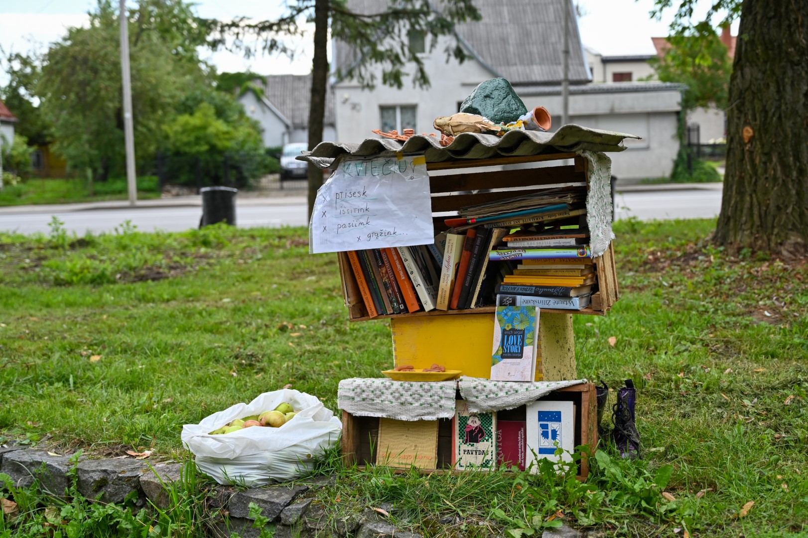 Visuotiniam skaitymui skirtos knygos surikiuotos dėžėse, apdengtose šiferio lakštais. Jų savininkė, A. Lipniūno progimnazijos lietuvių kalbos mokytoja, tikisi, kad atsiras norinčiųjų padovanoti solidesnių lauko lentynų ar net pagaminti knygų namelį.