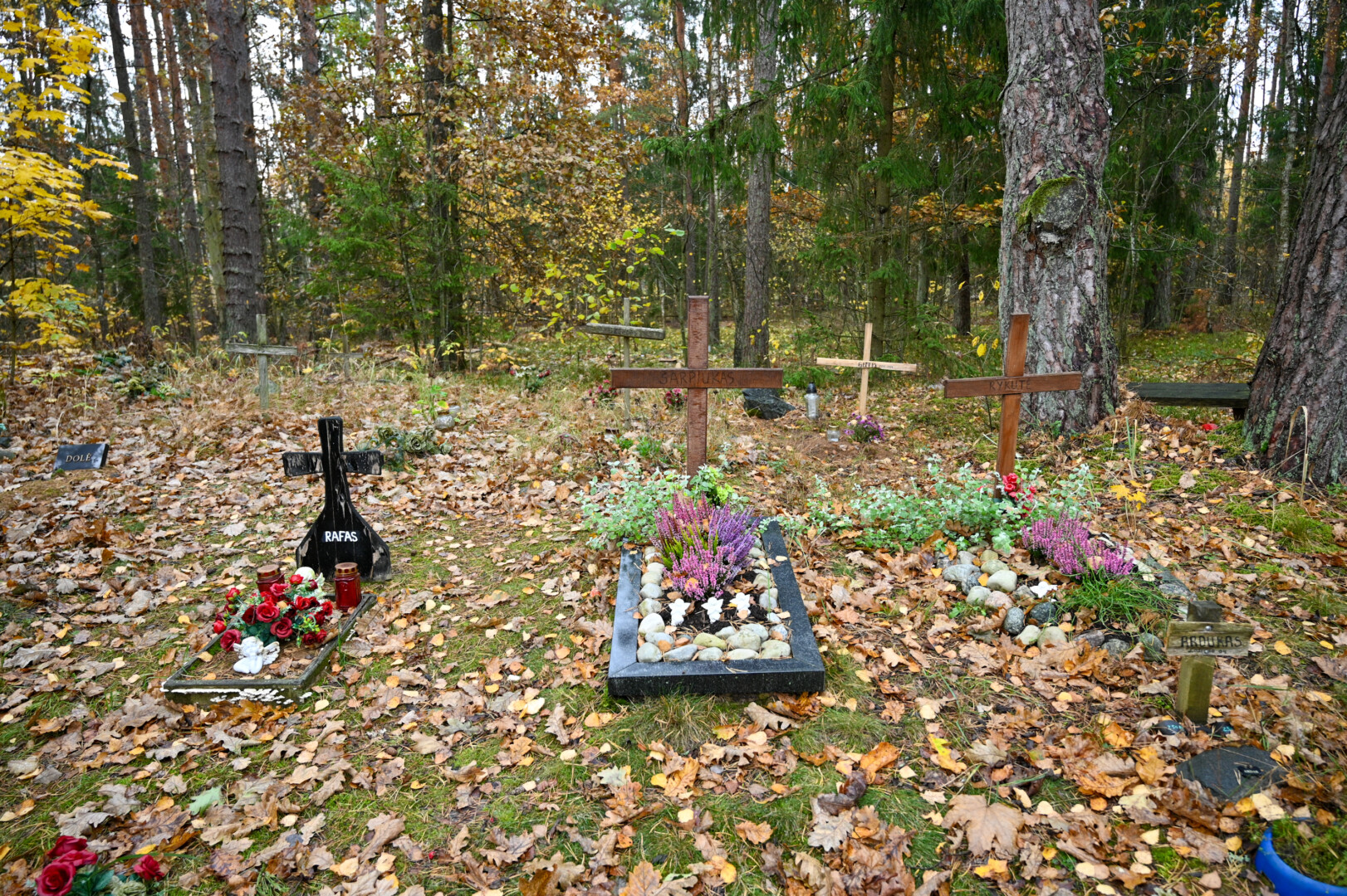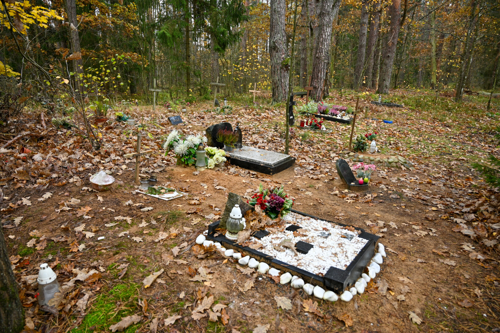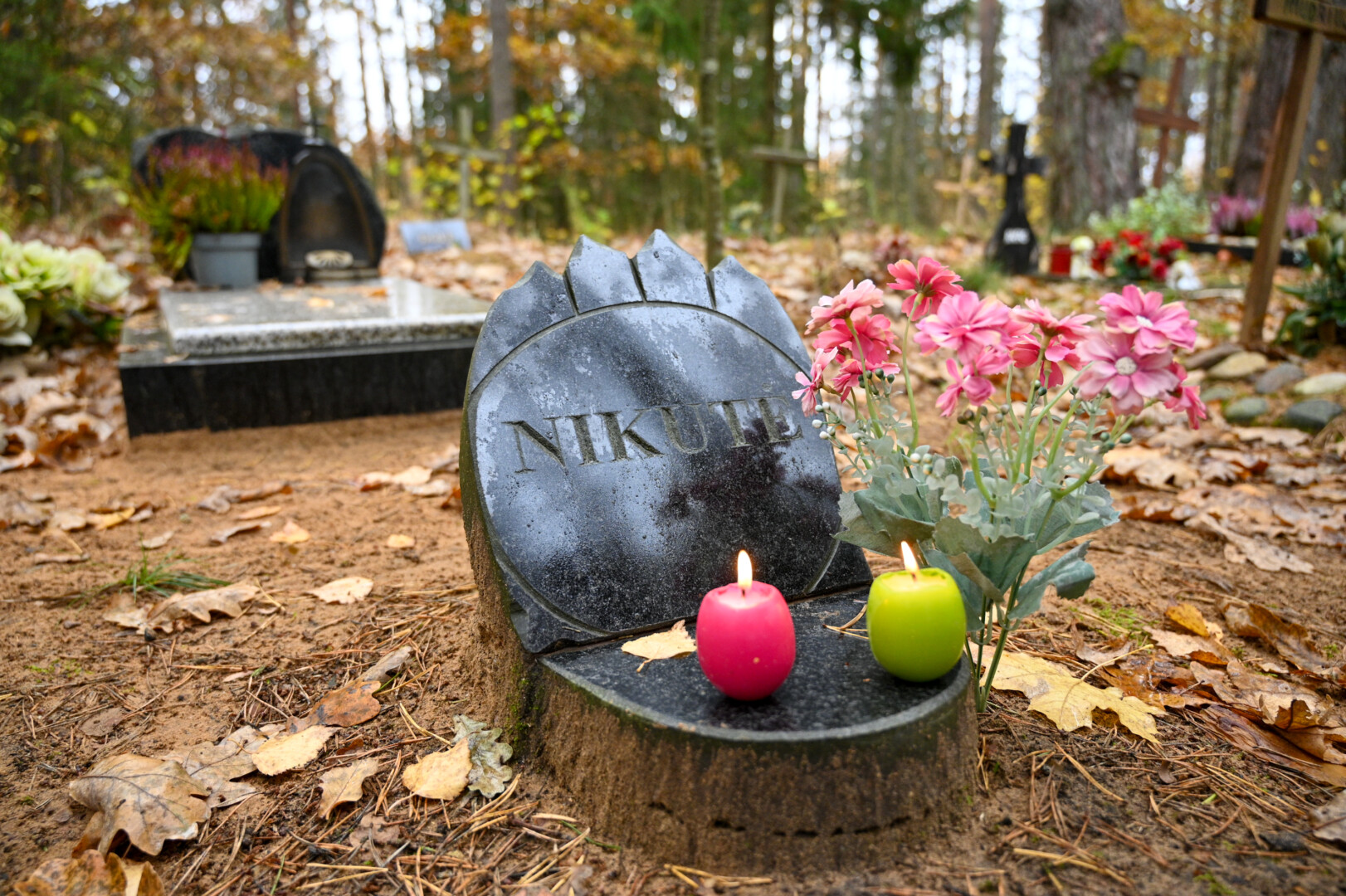 Nikutės vardas iškaltas akmenyje, ant jos kapelio plazda žvakių liepsnelės. Kiek tolėliau – akmeninis paminklas Linksmučiui Tiutikui, jo kapas dengtas antkapiu, pasodinta gėlių. Mudriaus kapelis gražiai išdėliotas akmenukais, papuoštas dirbtinių gėlių puokštė. O štai Dolės kapelis apleistas.