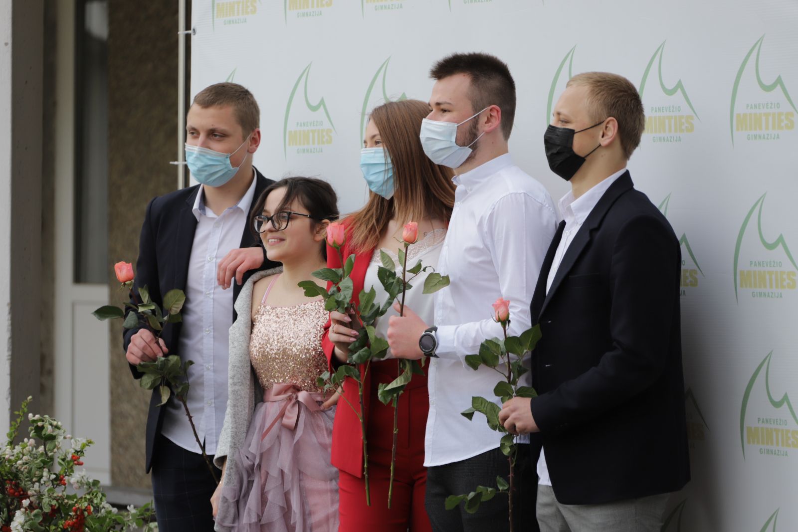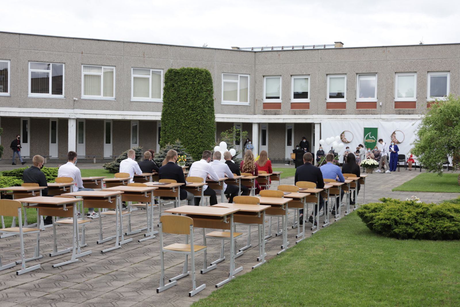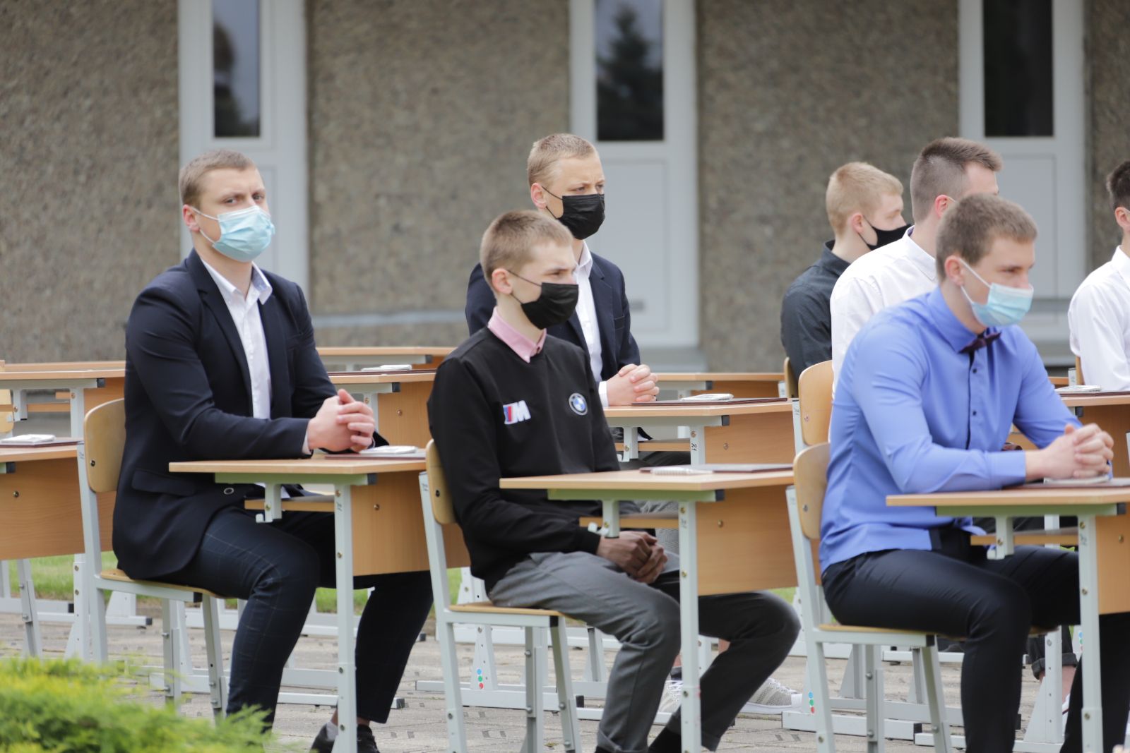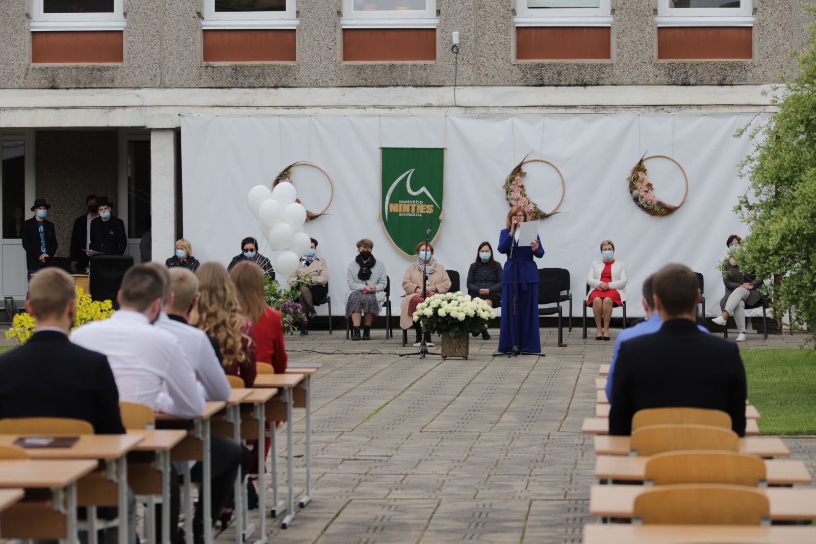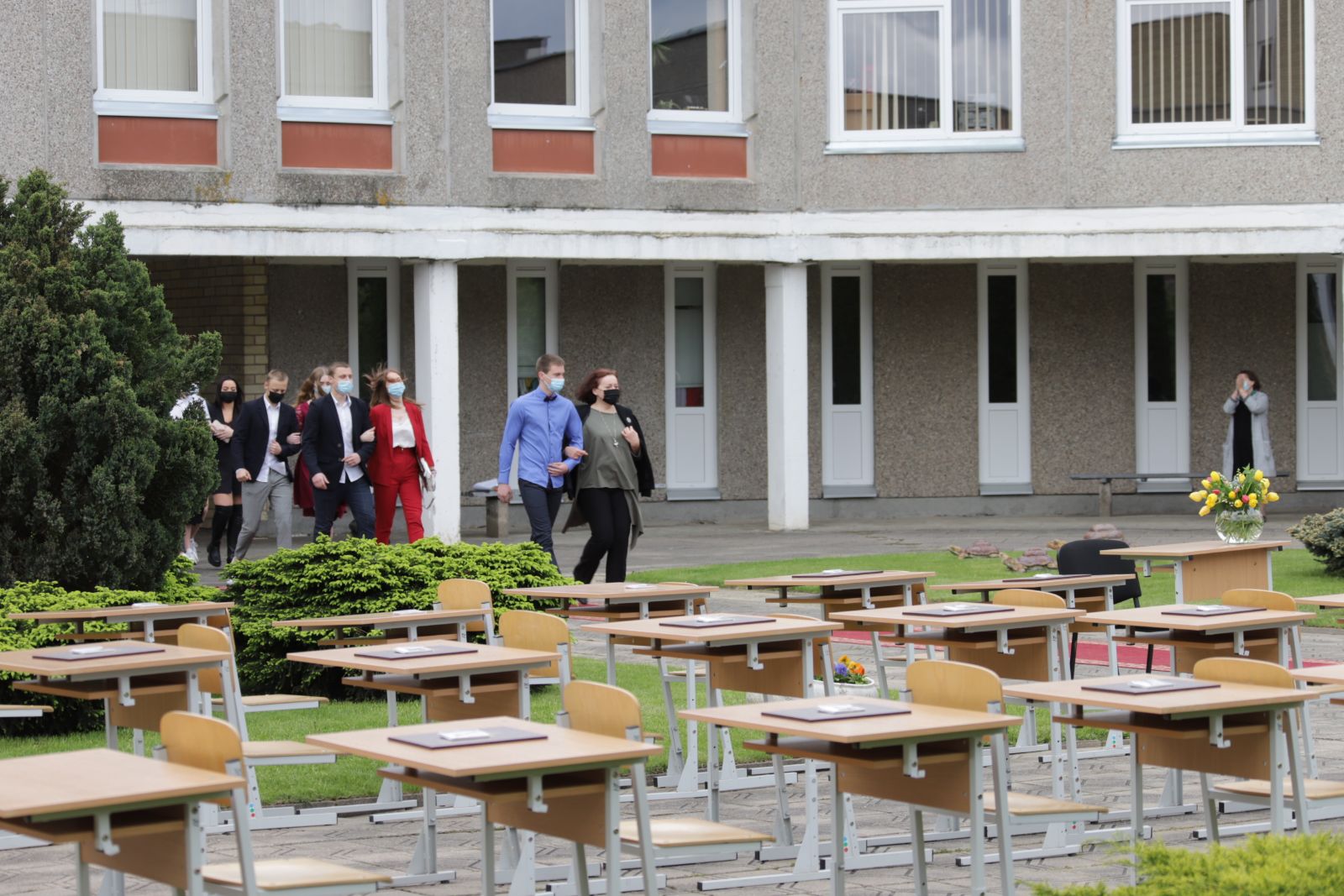 Panevėžio „Minties“ gimnazija šiemet išleidžia 80 abiturientų. Trys klasės kas valandą rinkosi į paskutinę pamoką. Ji, kaip ir pernai, vyko vidiniame gimnazijos kiemelyje ir abiturientai sėdėjo saugiais atstumais sustatytuose suoluose.