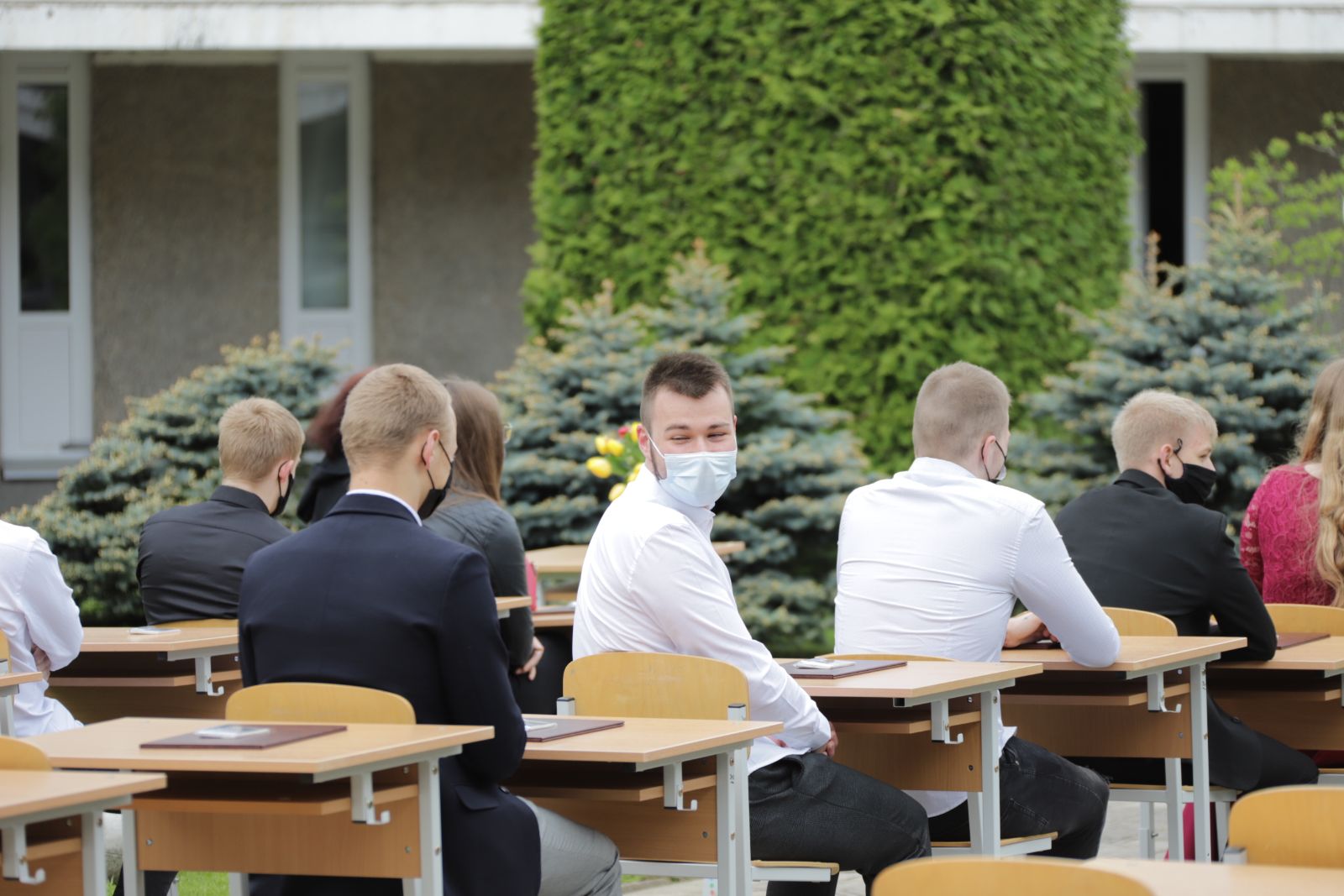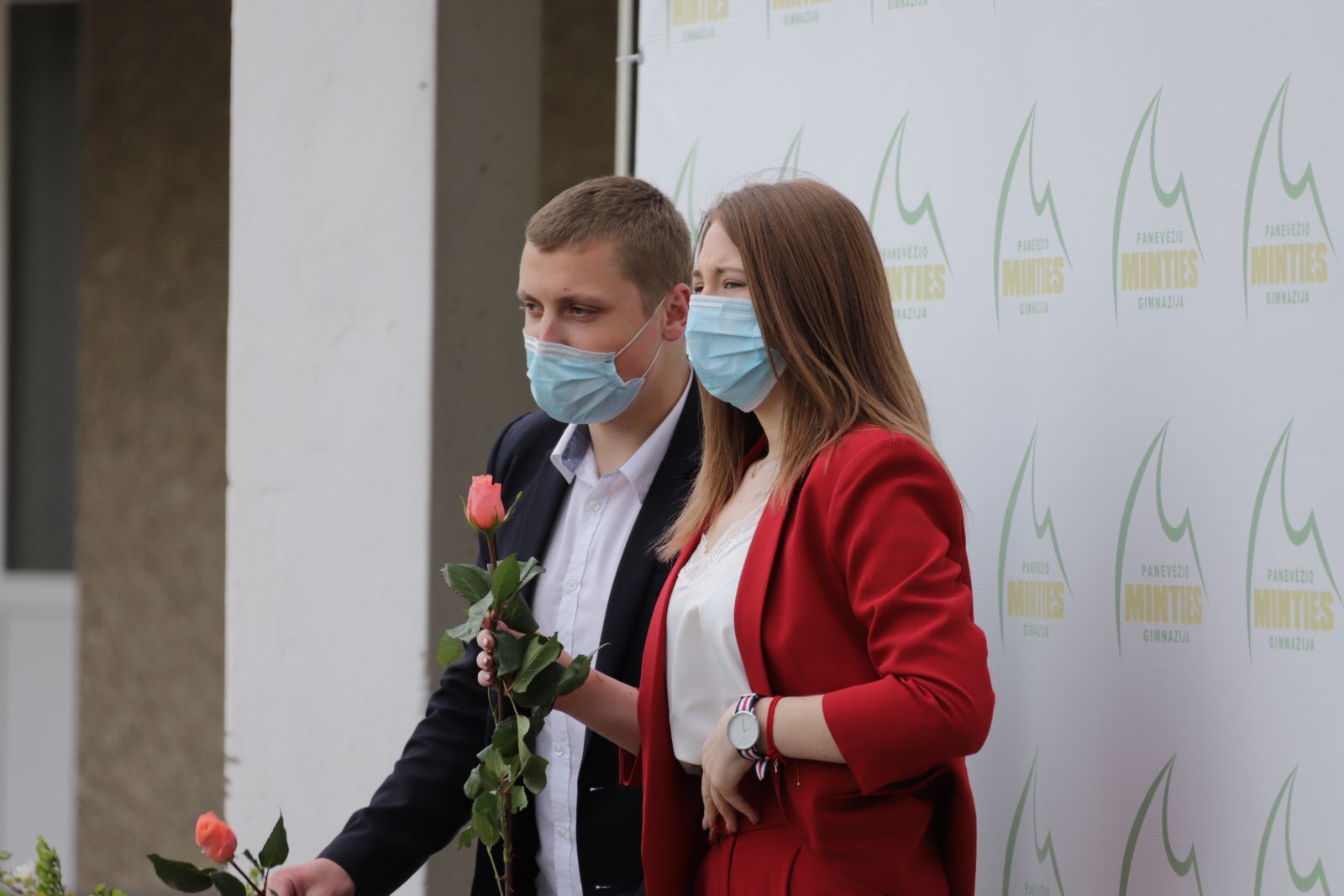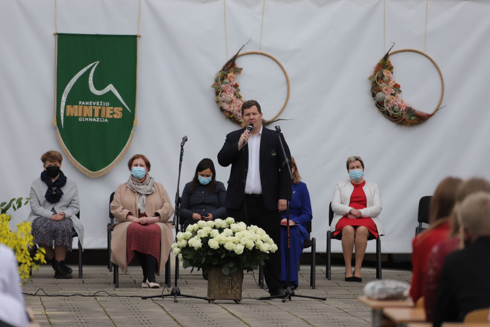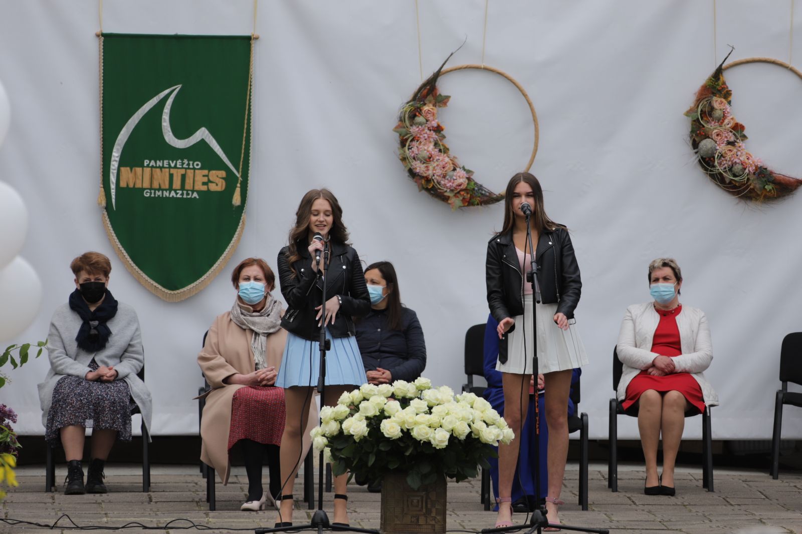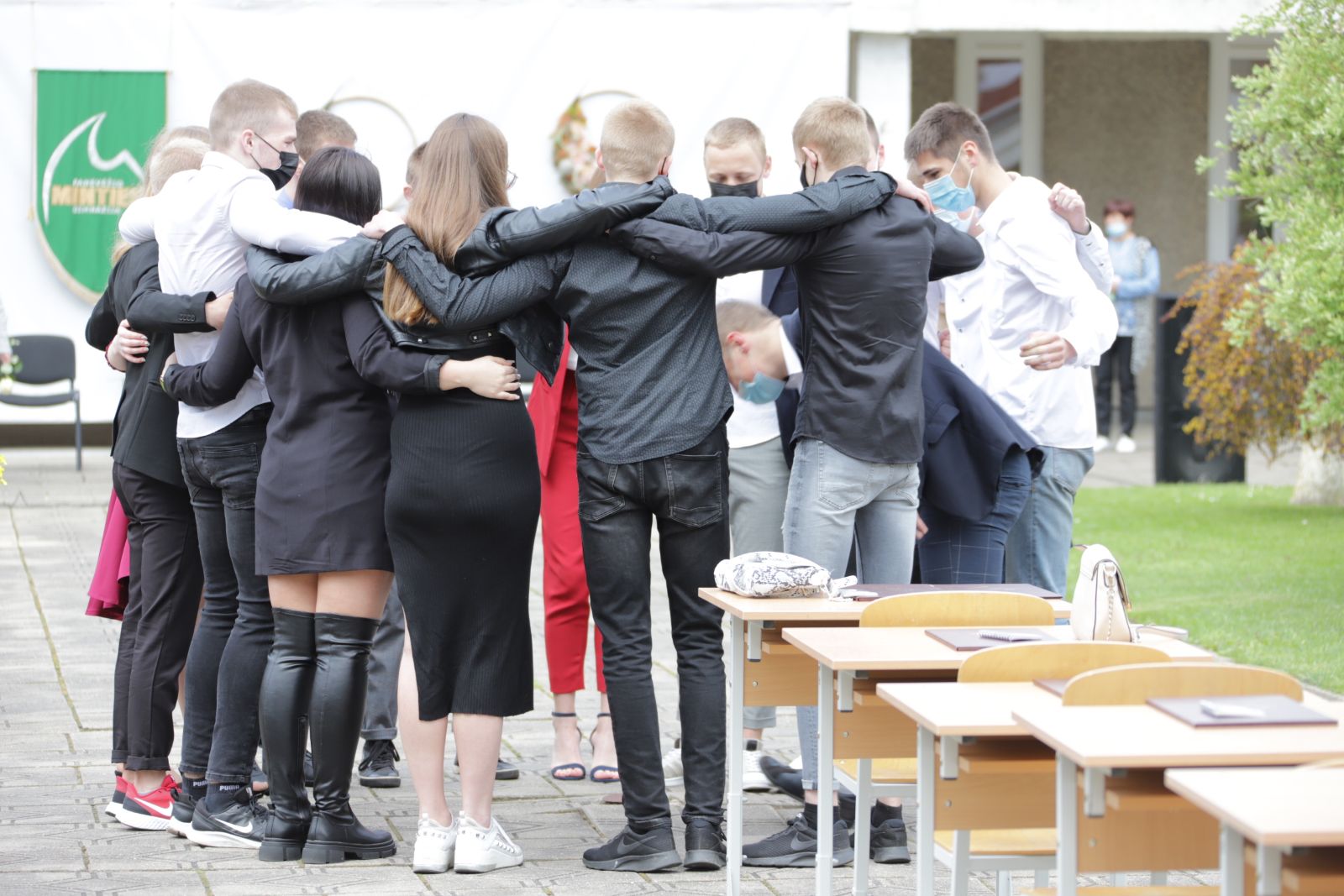 Panevėžio „Minties“ gimnazija šiemet išleidžia 80 abiturientų. Trys klasės kas valandą rinkosi į paskutinę pamoką. Ji, kaip ir pernai, vyko vidiniame gimnazijos kiemelyje ir abiturientai sėdėjo saugiais atstumais sustatytuose suoluose.