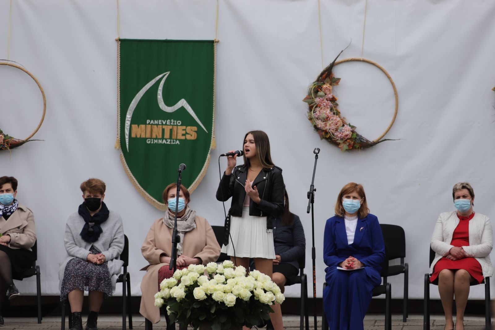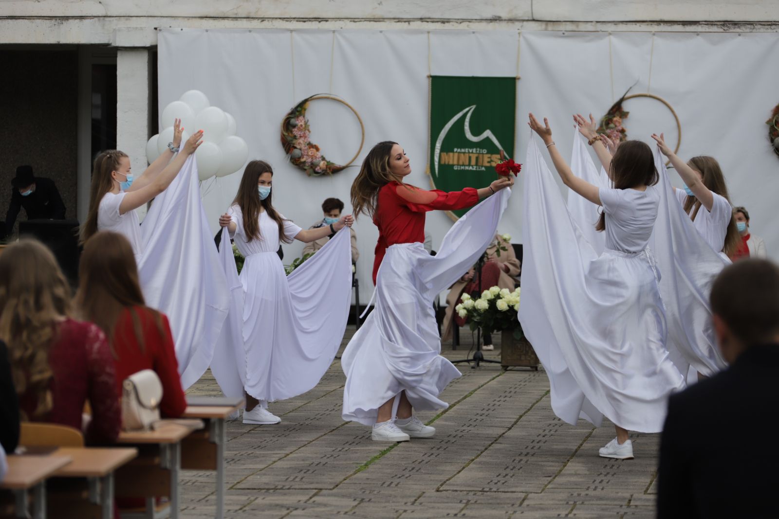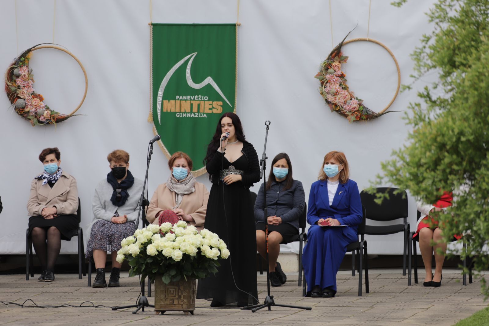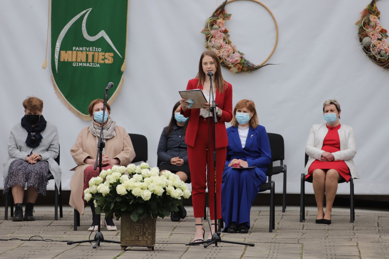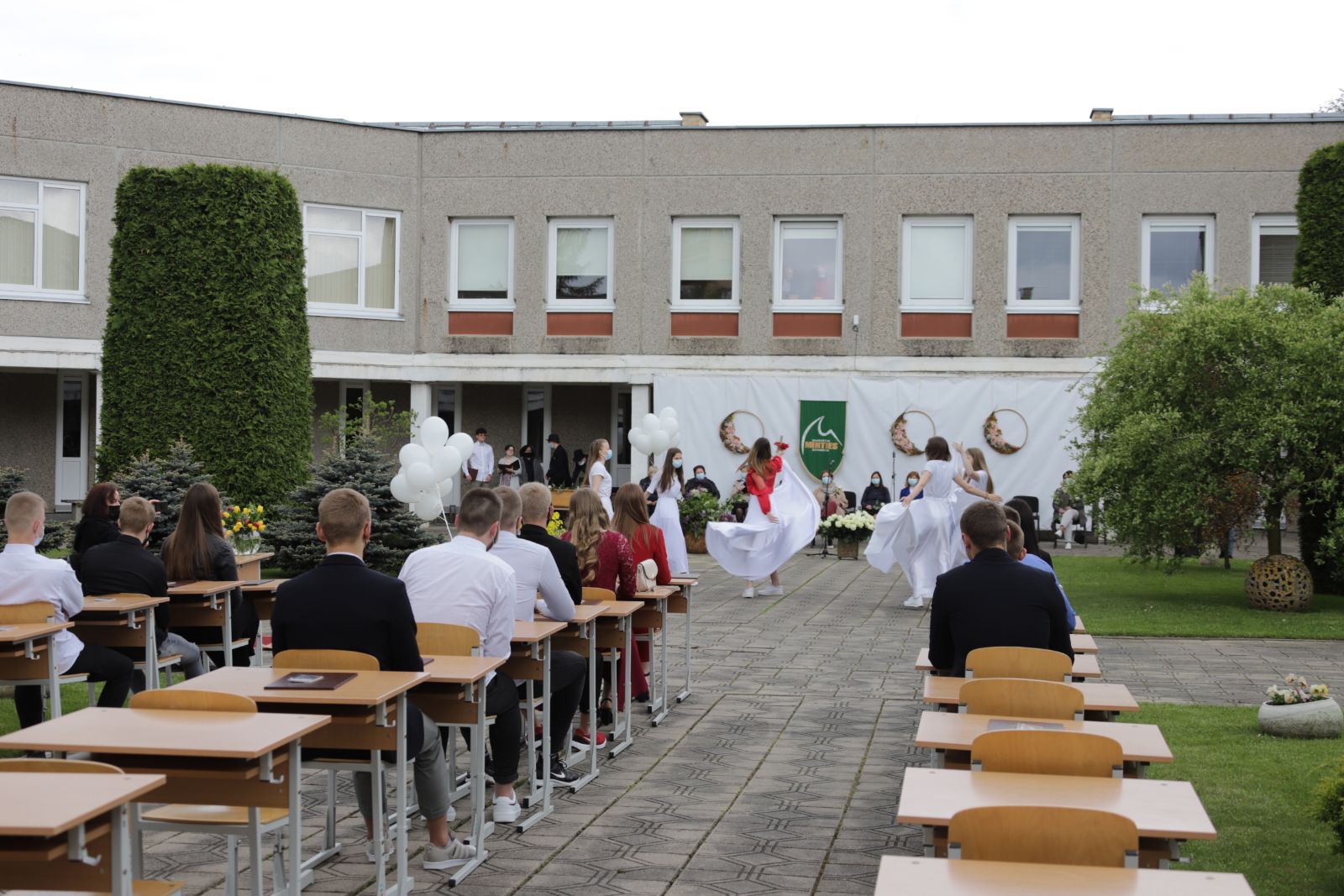 Panevėžio „Minties“ gimnazija šiemet išleidžia 80 abiturientų. Trys klasės kas valandą rinkosi į paskutinę pamoką. Ji, kaip ir pernai, vyko vidiniame gimnazijos kiemelyje ir abiturientai sėdėjo saugiais atstumais sustatytuose suoluose.