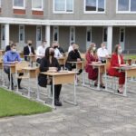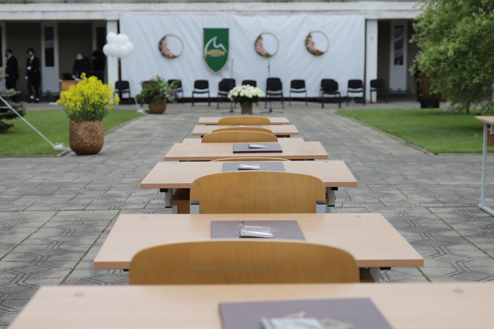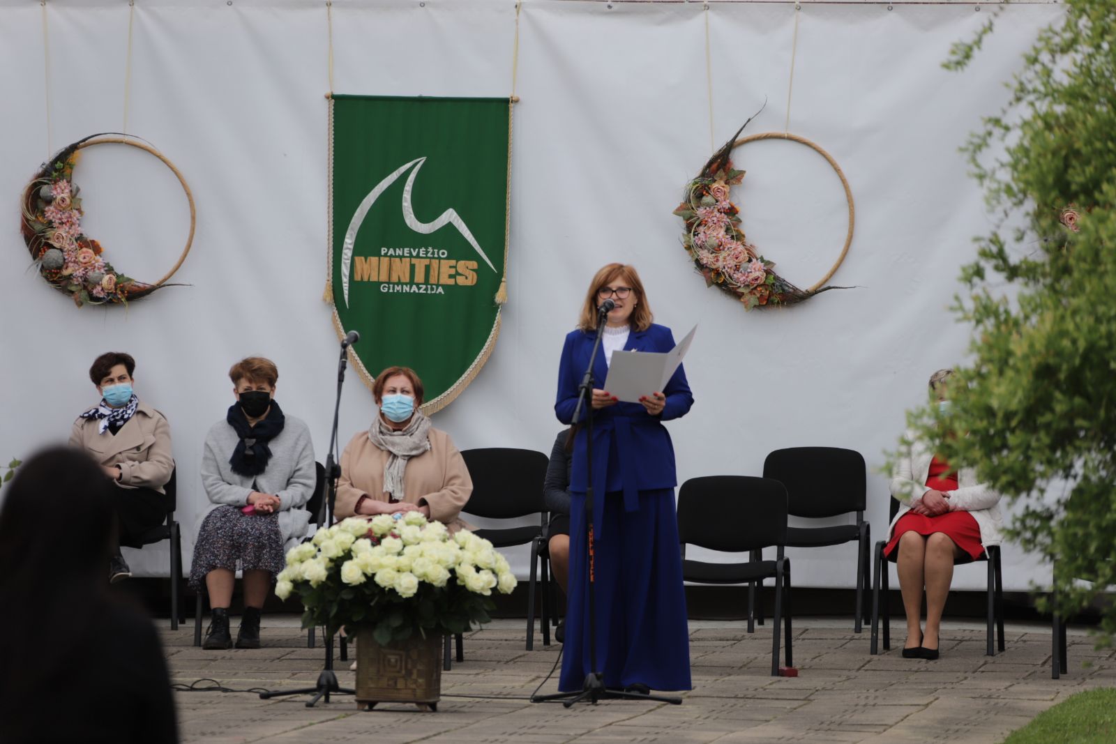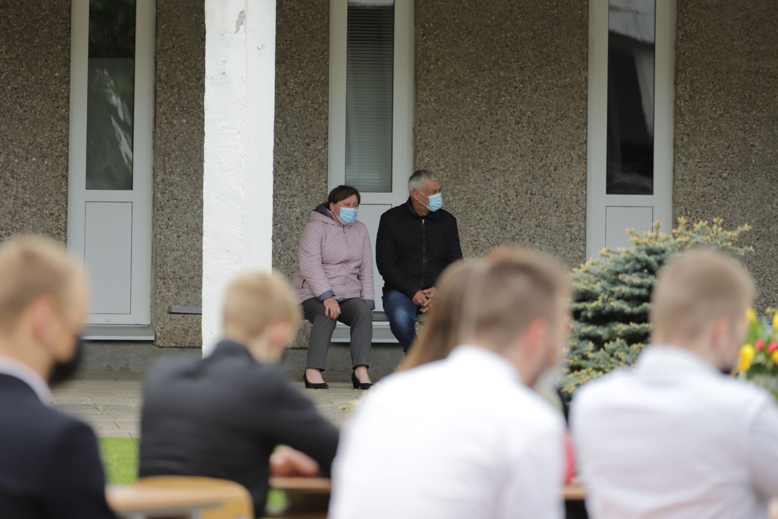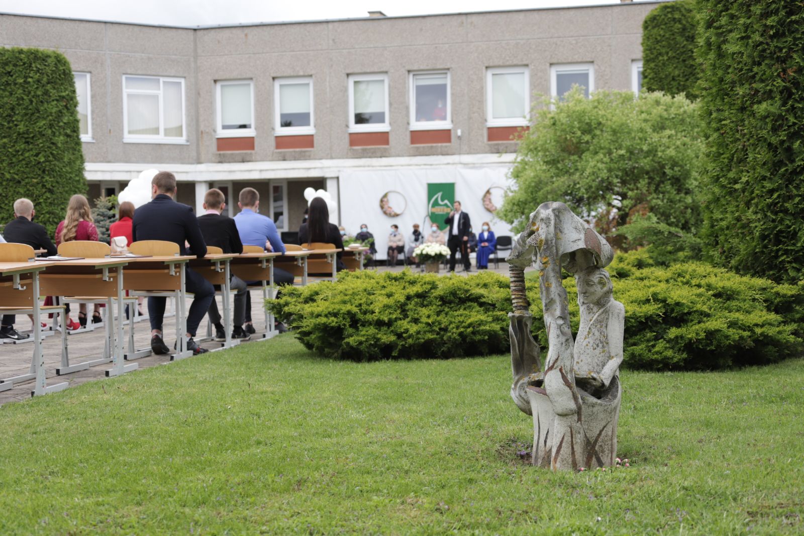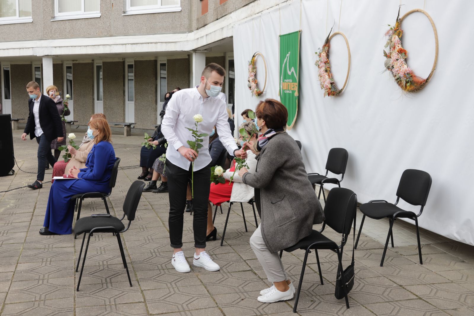 Panevėžio „Minties“ gimnazija šiemet išleidžia 80 abiturientų. Trys klasės kas valandą rinkosi į paskutinę pamoką. Ji, kaip ir pernai, vyko vidiniame gimnazijos kiemelyje ir abiturientai sėdėjo saugiais atstumais sustatytuose suoluose.