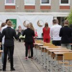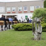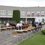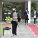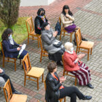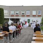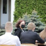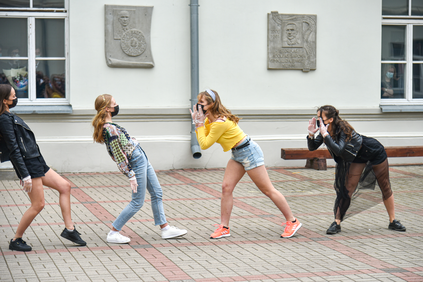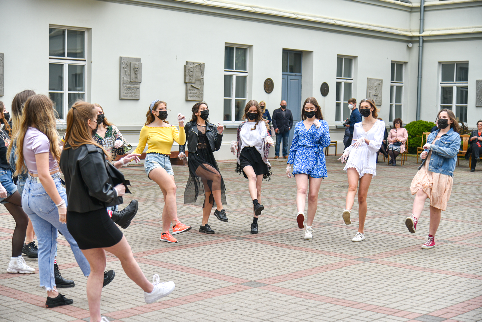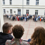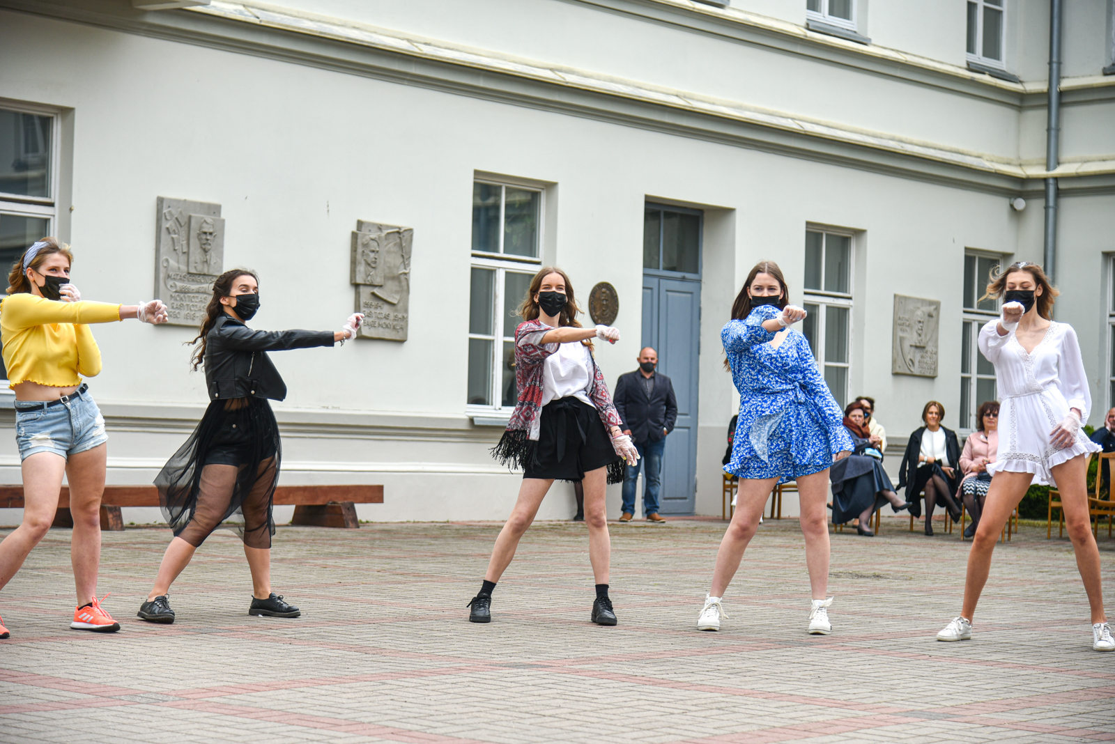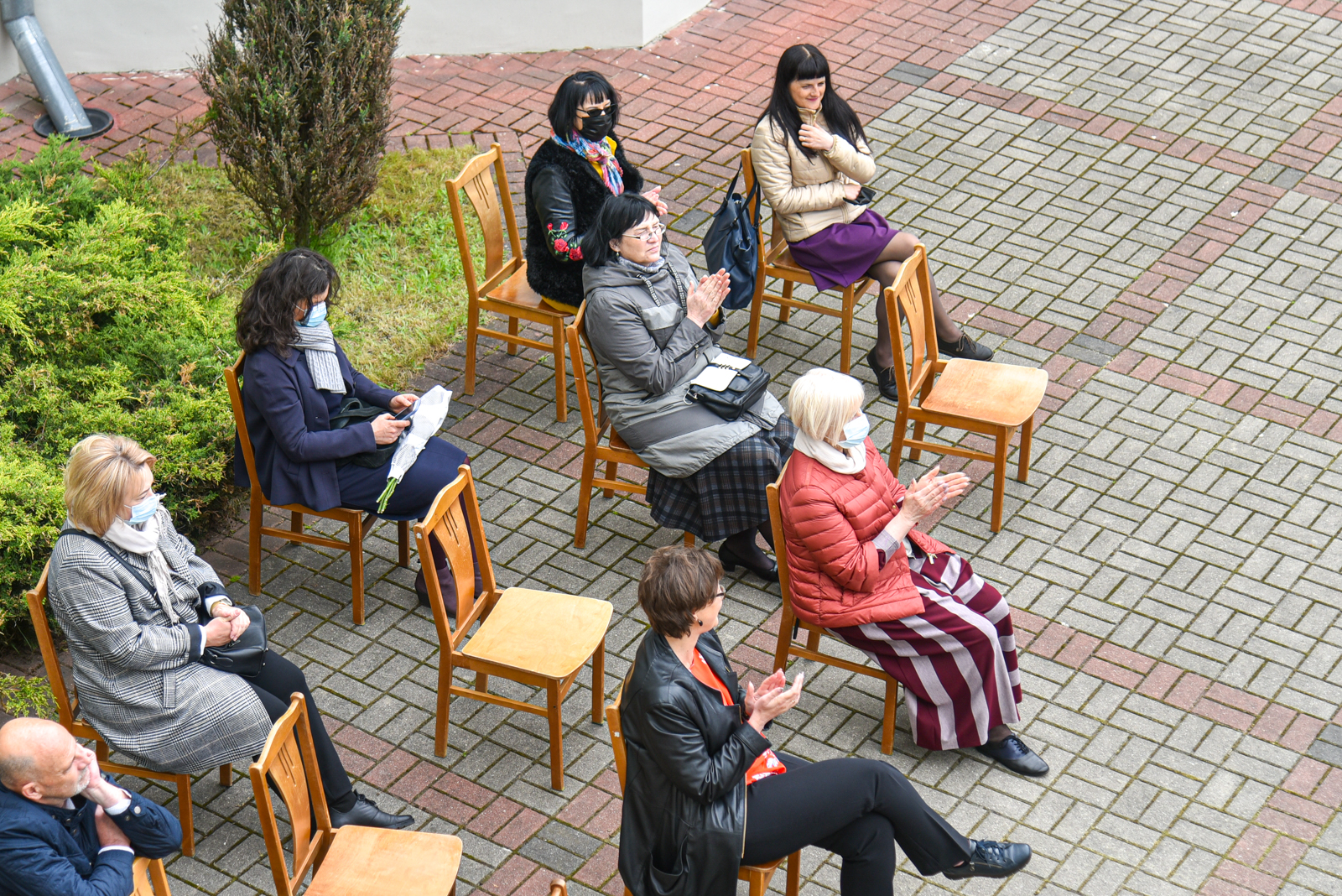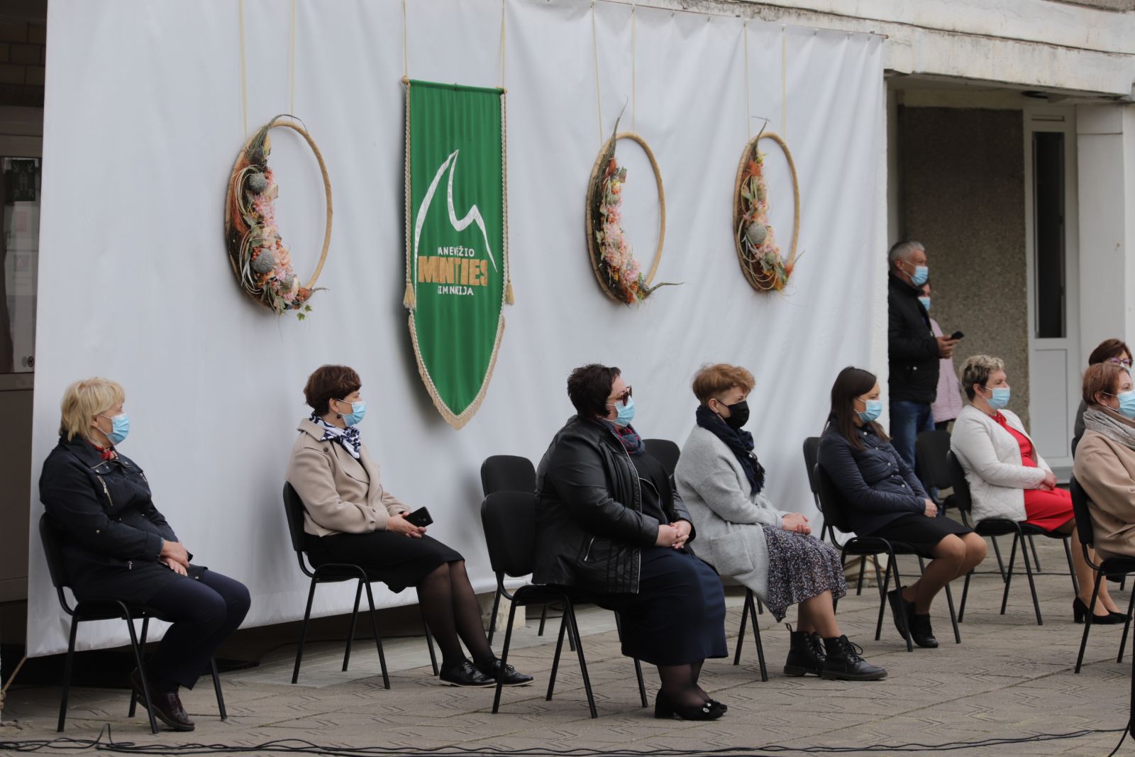 Panevėžio „Minties“ gimnazija šiemet išleidžia 80 abiturientų. Trys klasės kas valandą rinkosi į paskutinę pamoką. Ji, kaip ir pernai, vyko vidiniame gimnazijos kiemelyje ir abiturientai sėdėjo saugiais atstumais sustatytuose suoluose.