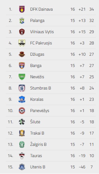 LFF Pirmos lygos turnyro lentelė: (vieta, komanda, įvarčių sanktykis, taškai):