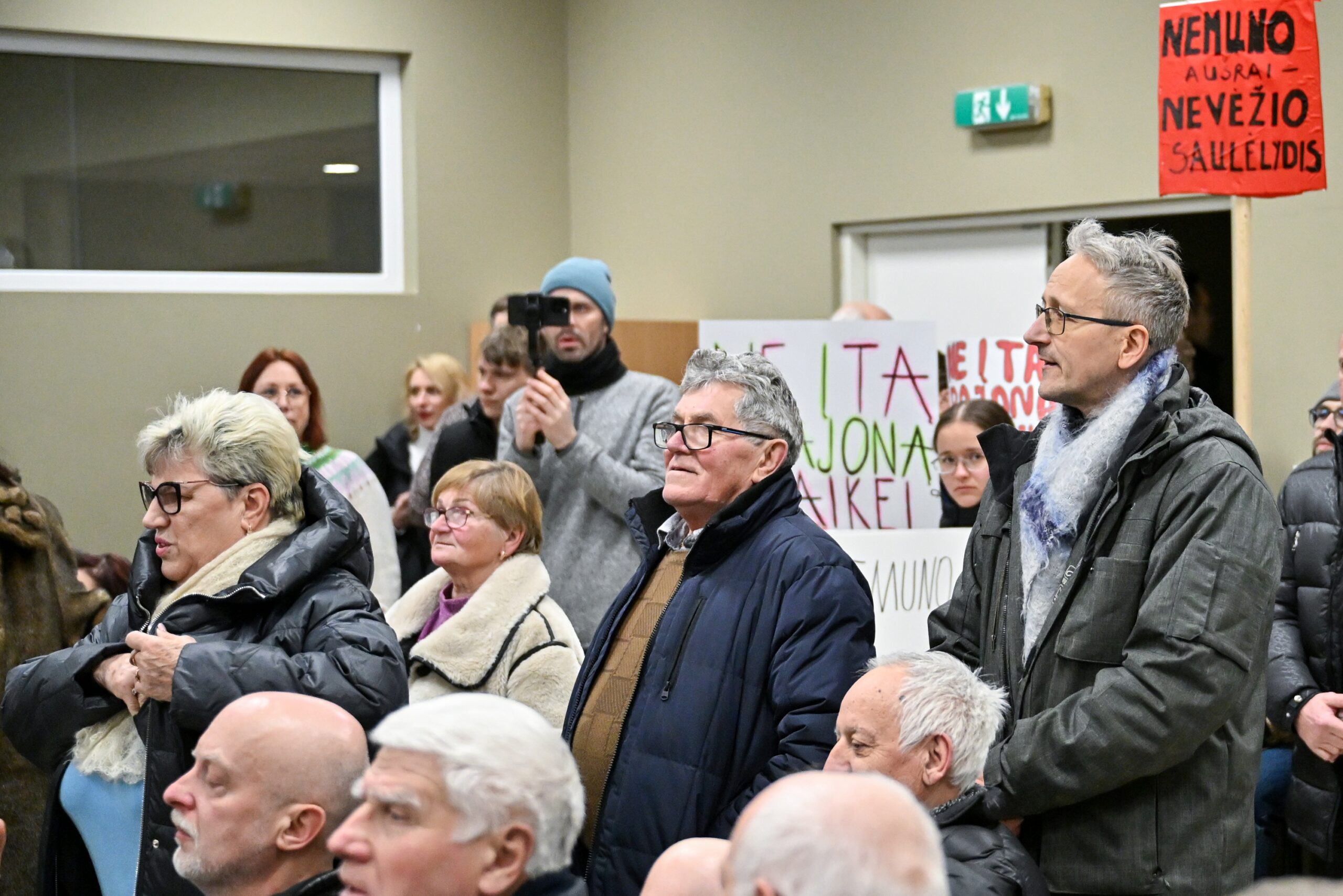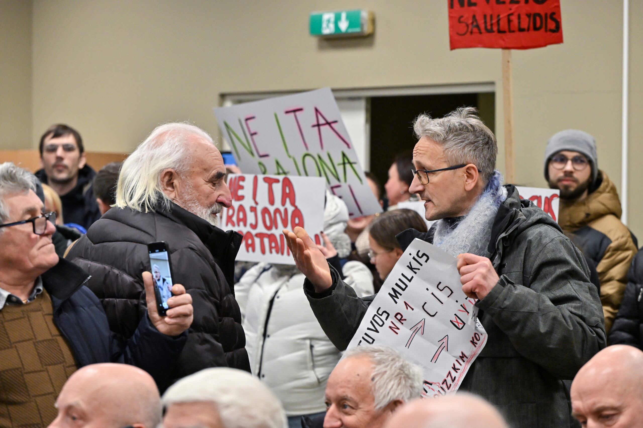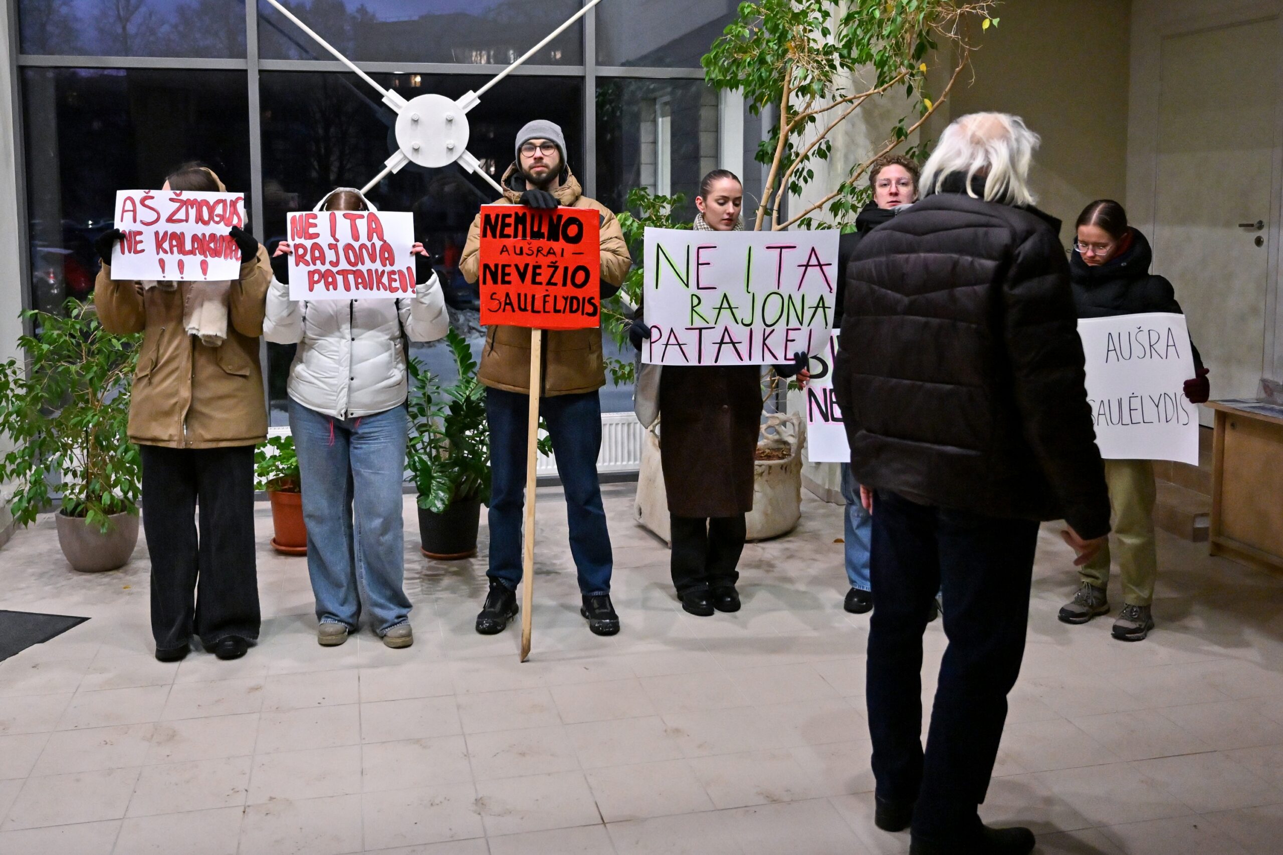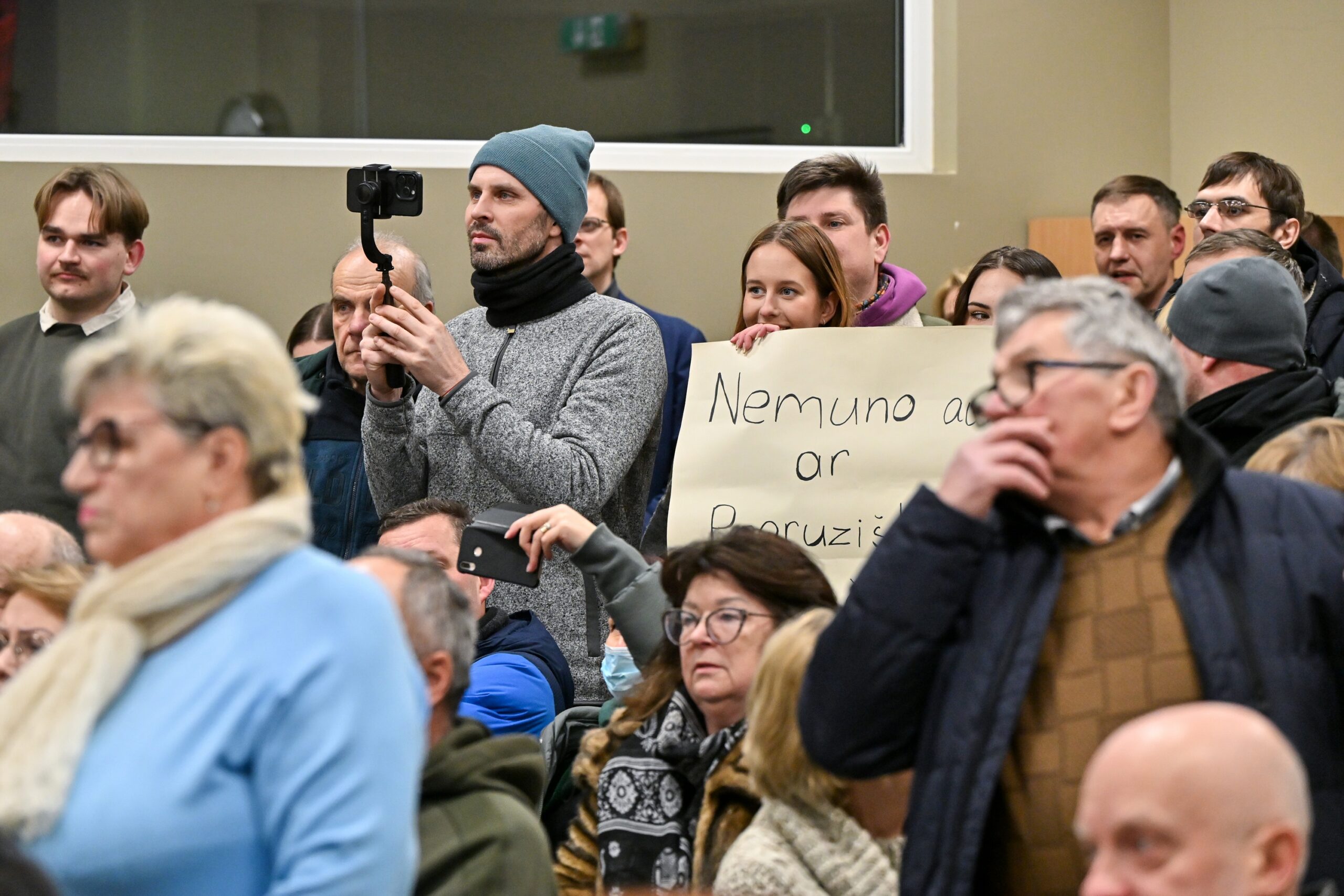 „Melo detektorius“ – šūktelėjo vienas iš protestuojančiųjų prieš „Nemuno aušrą“ ir jos vedlį. Nepaisant per garsiakalbį pasigirdusių raginimų evakuotis, niekas iš salės nespruko.