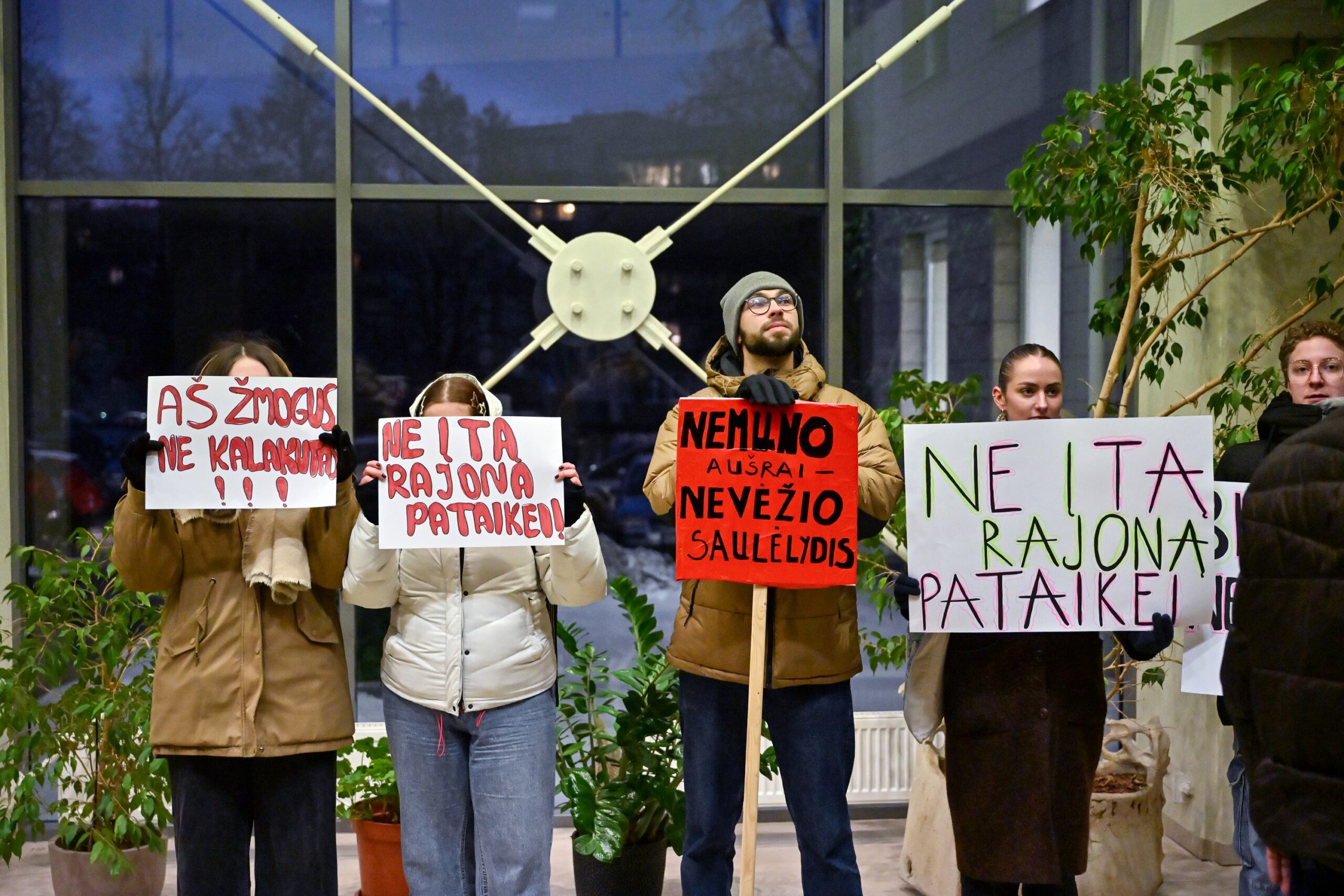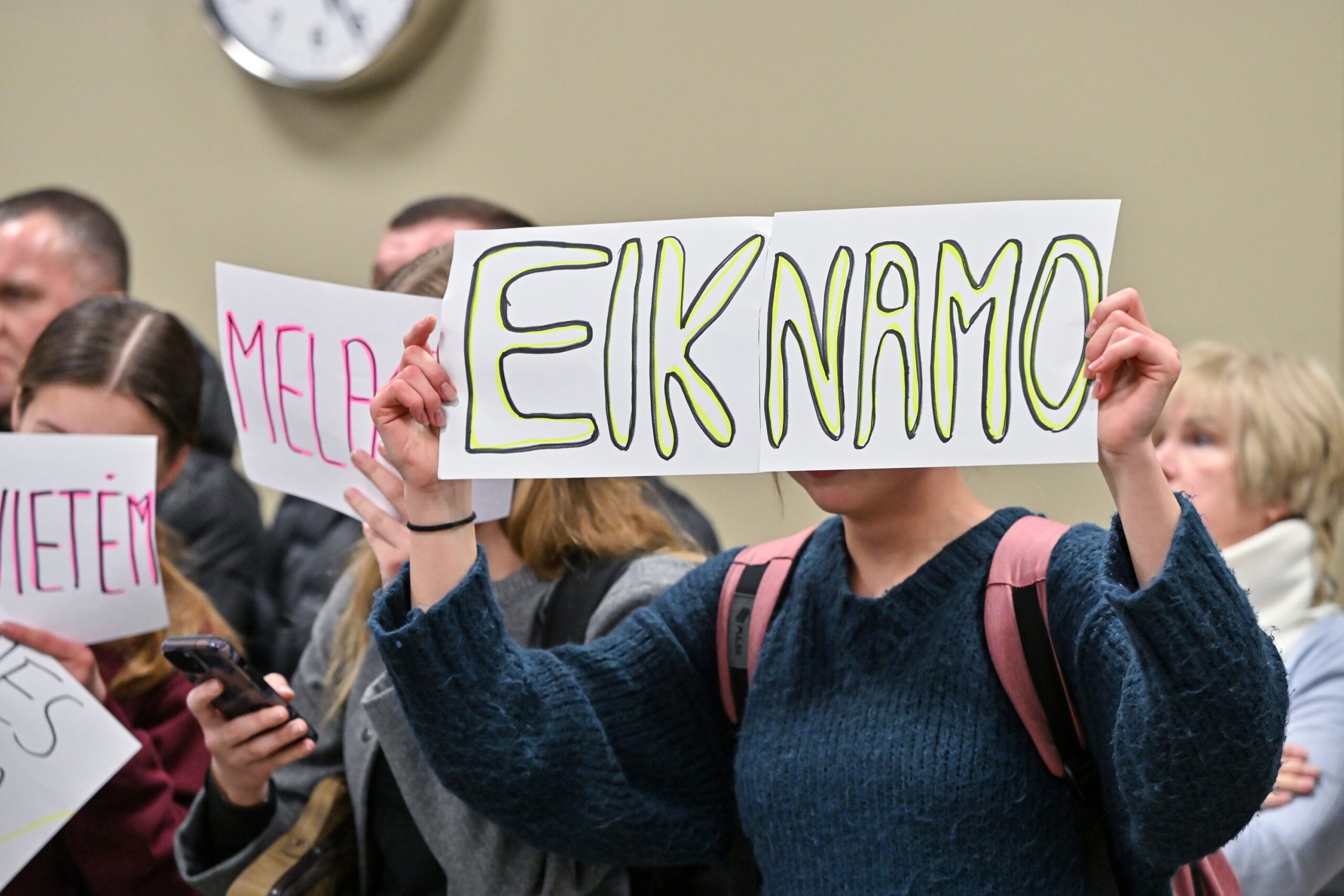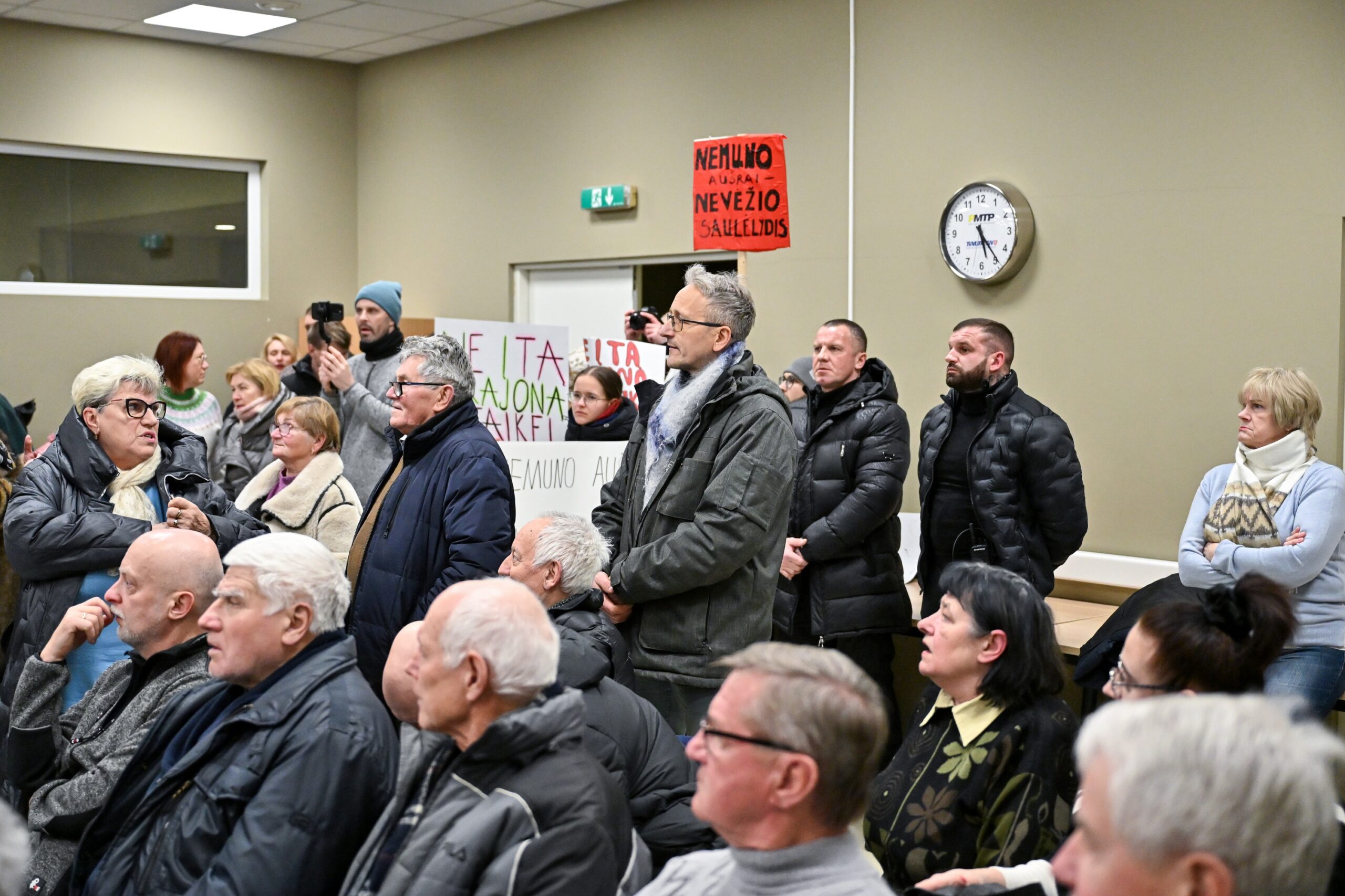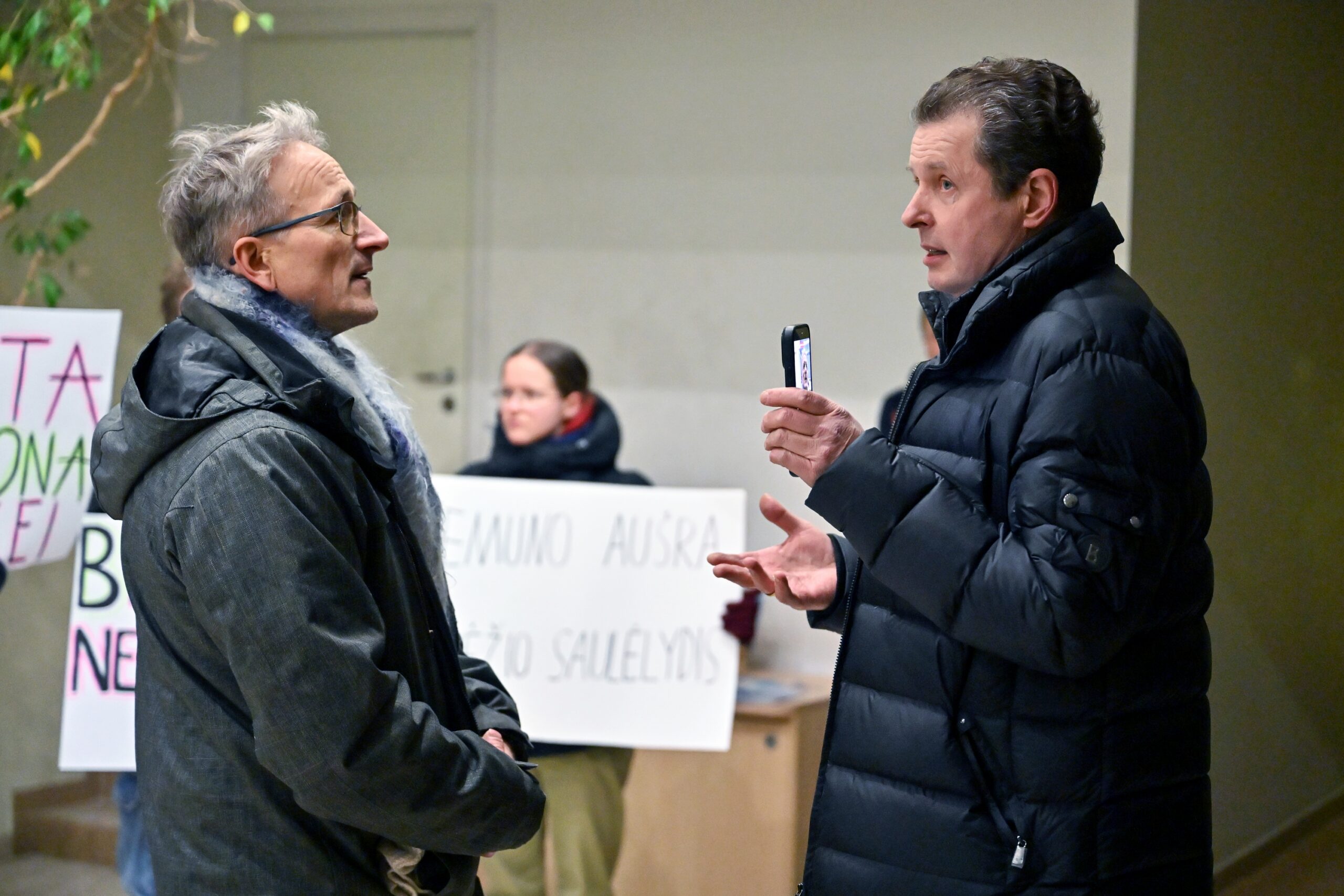 „Melo detektorius“ – šūktelėjo vienas iš protestuojančiųjų prieš „Nemuno aušrą“ ir jos vedlį. Nepaisant per garsiakalbį pasigirdusių raginimų evakuotis, niekas iš salės nespruko.
