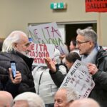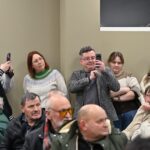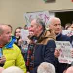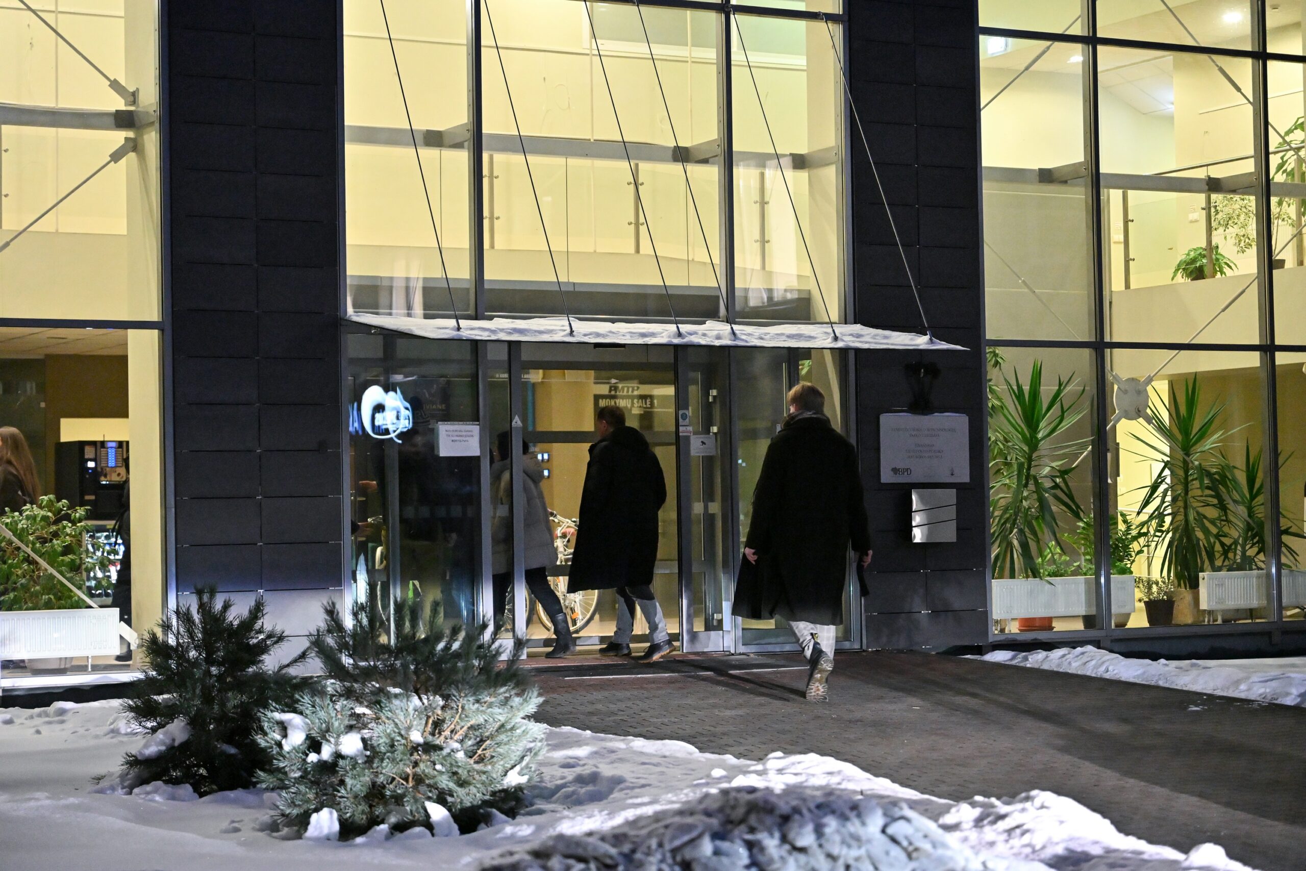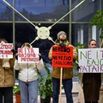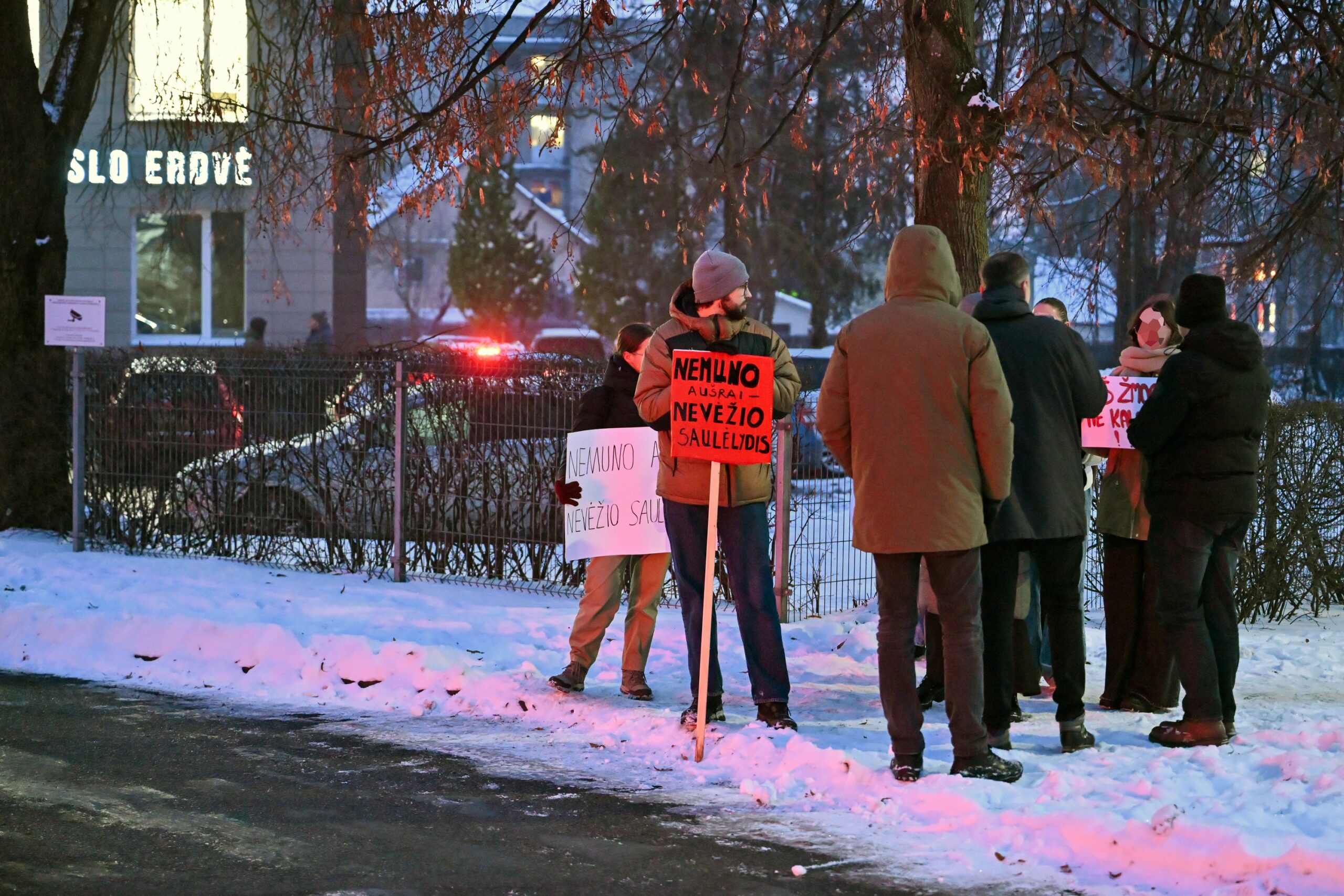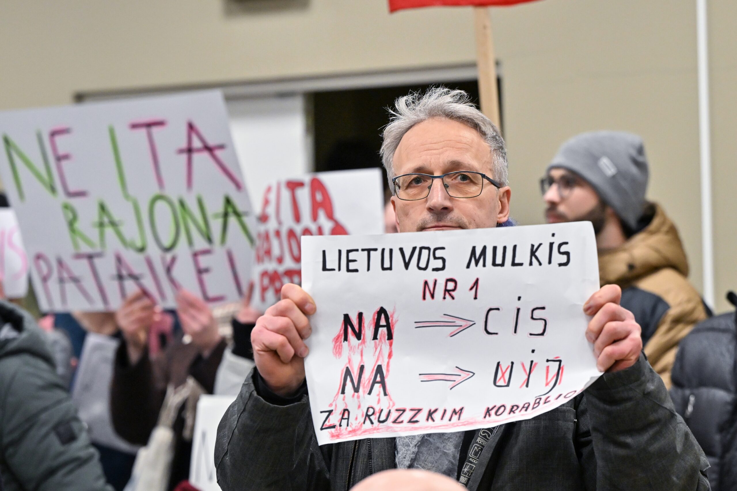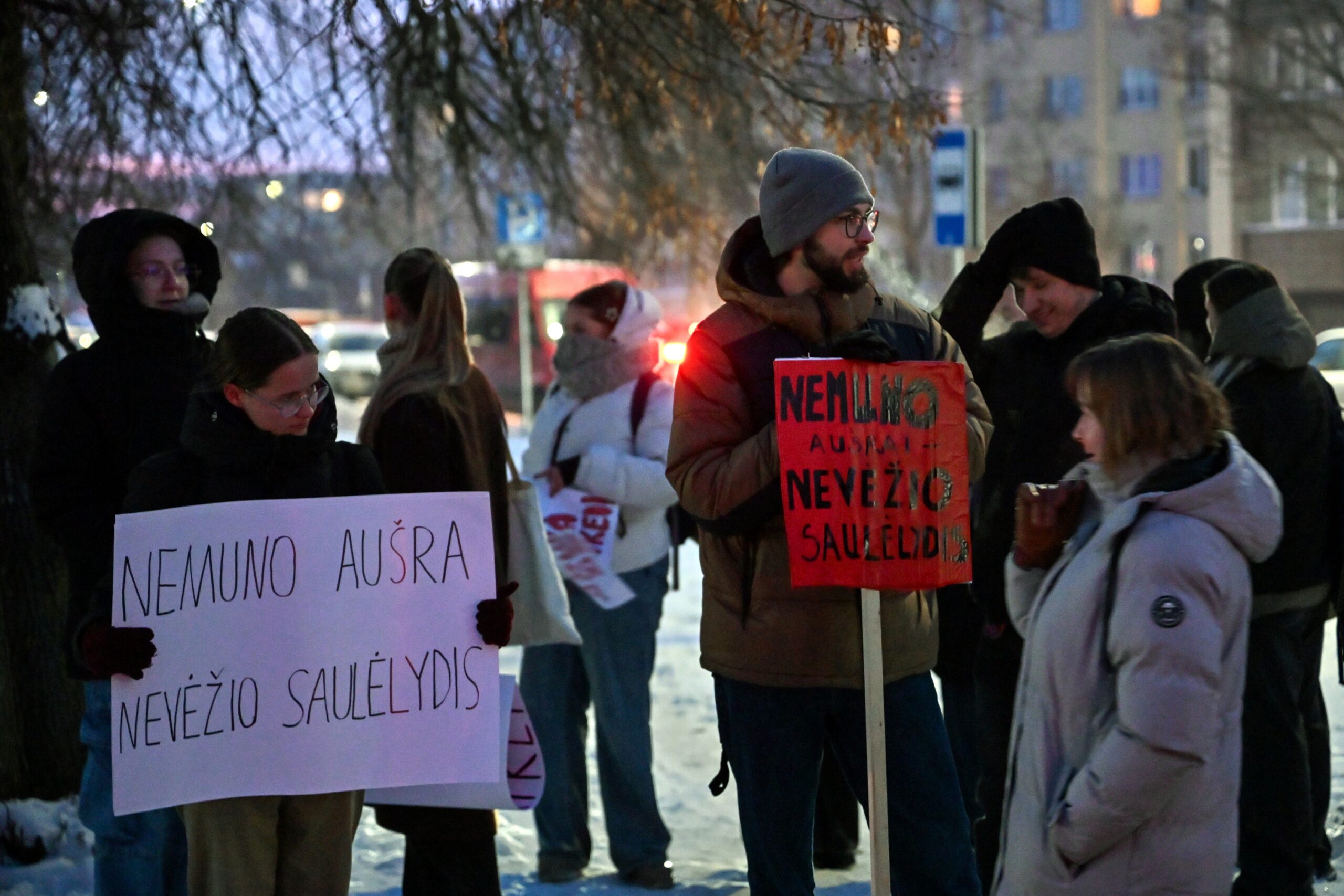 „Melo detektorius“ – šūktelėjo vienas iš protestuojančiųjų prieš „Nemuno aušrą“ ir jos vedlį. Nepaisant per garsiakalbį pasigirdusių raginimų evakuotis, niekas iš salės nespruko.