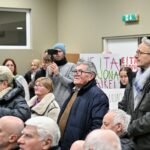 Būrys panevėžiečių į susitikimą su rinkėjais atvykusį R. Žemaitaitį pasitiko iškėlę plakatus: