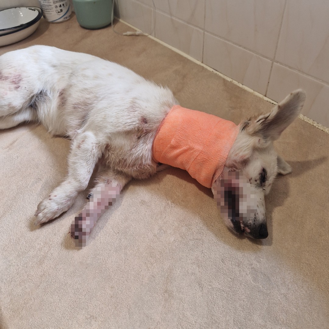 Šunelis, kuriam galbūt bandyta nupjauti galvą ar bent perpjauti gerklę, šiuo metu globojamas Panevėžyje gyvūnų prieglaudos „Mažas draugas“ savanorių.