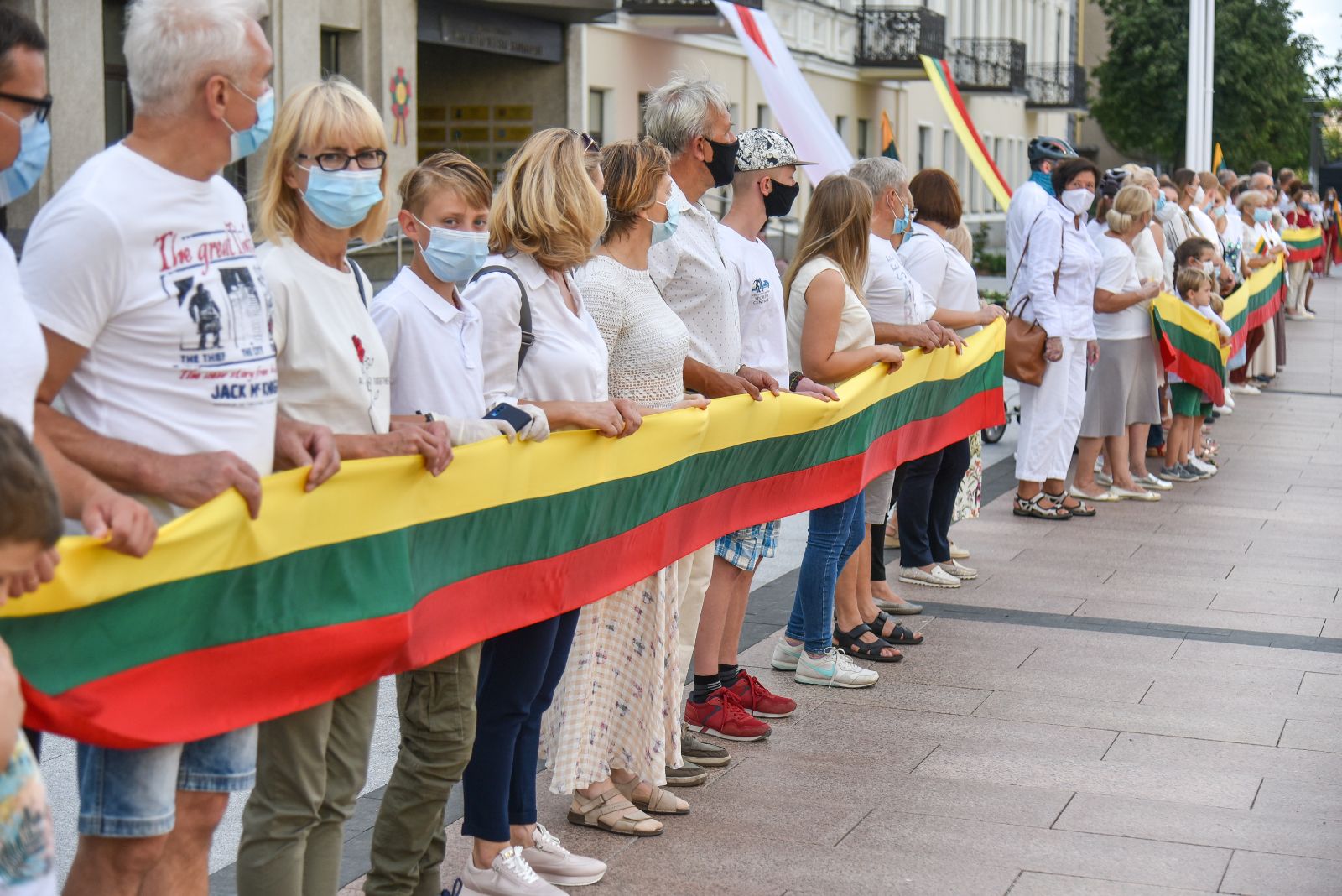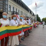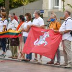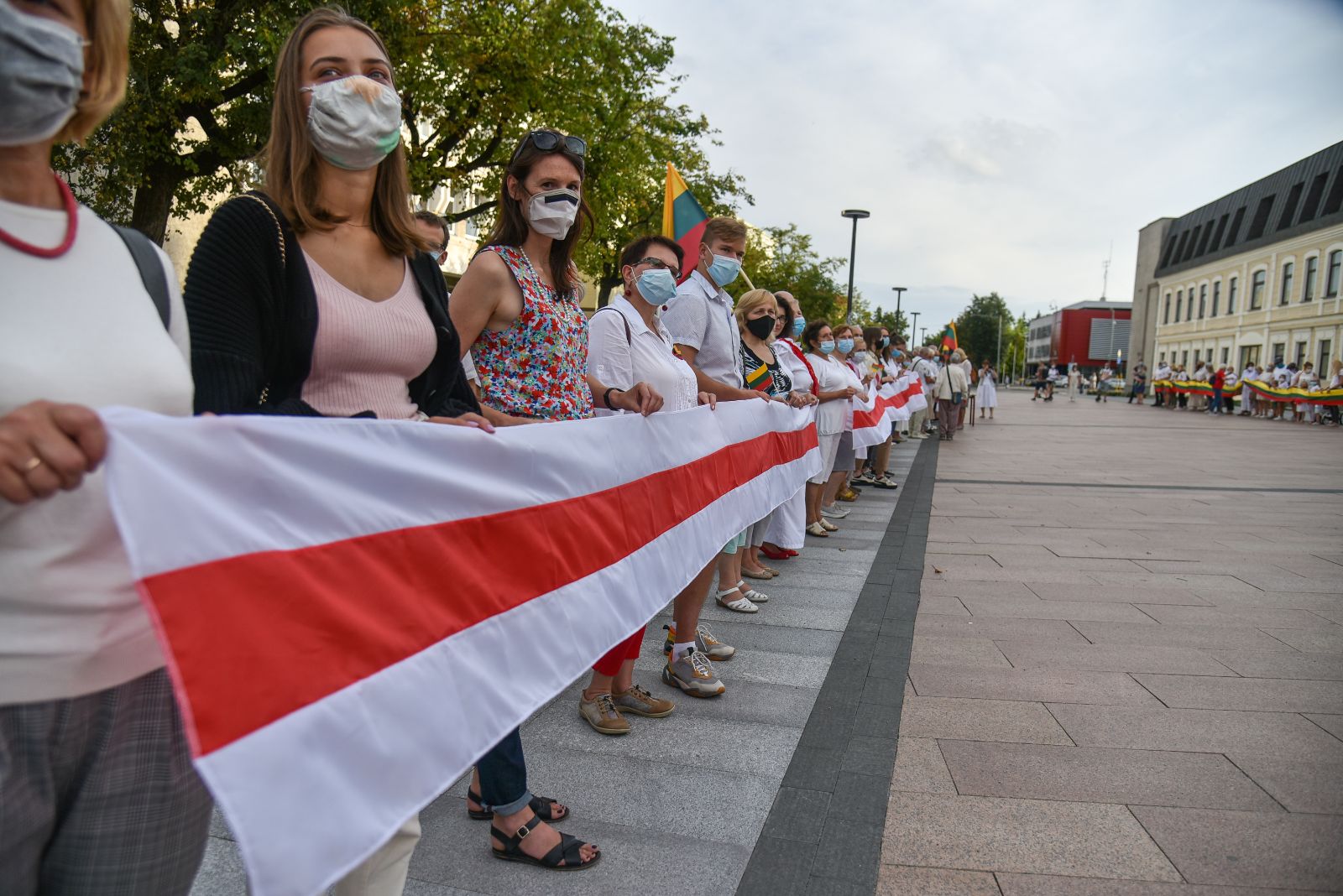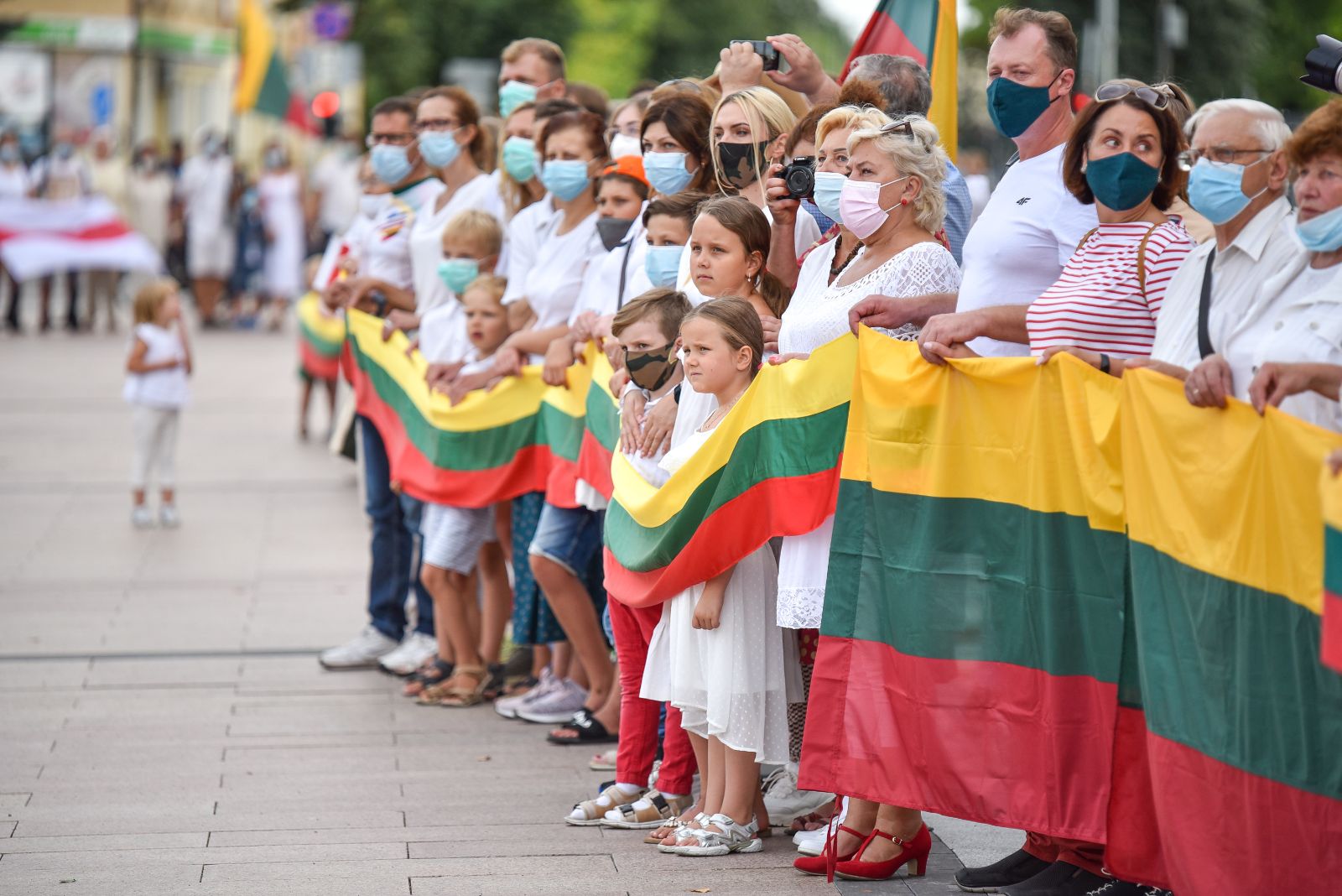 Daugelis apsirengę baltai, jie stojo į „Laisvės kelią“, kad pareikštų palaikymą už demokratines permainas savo šalyje kovojantiems baltarusiams.
