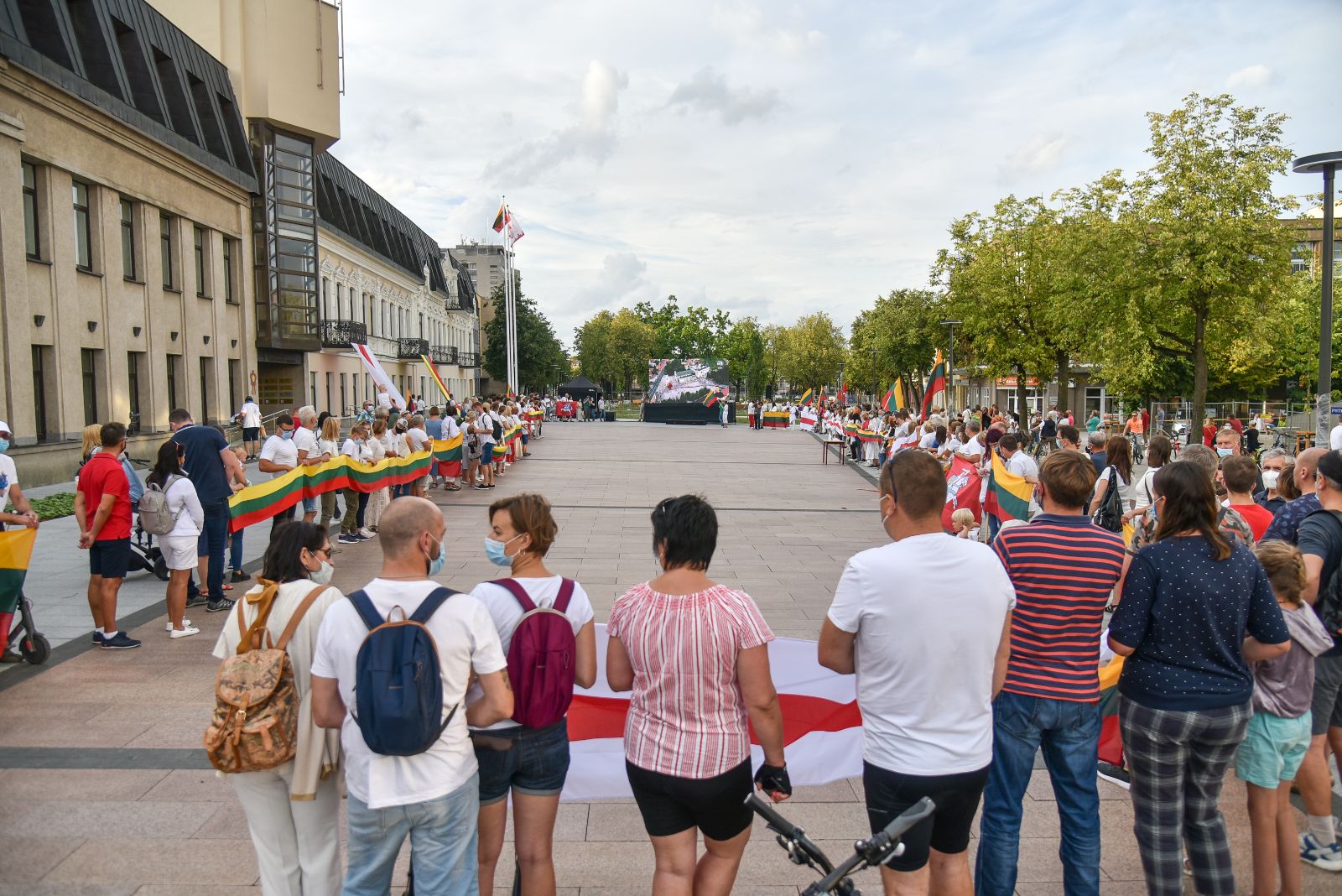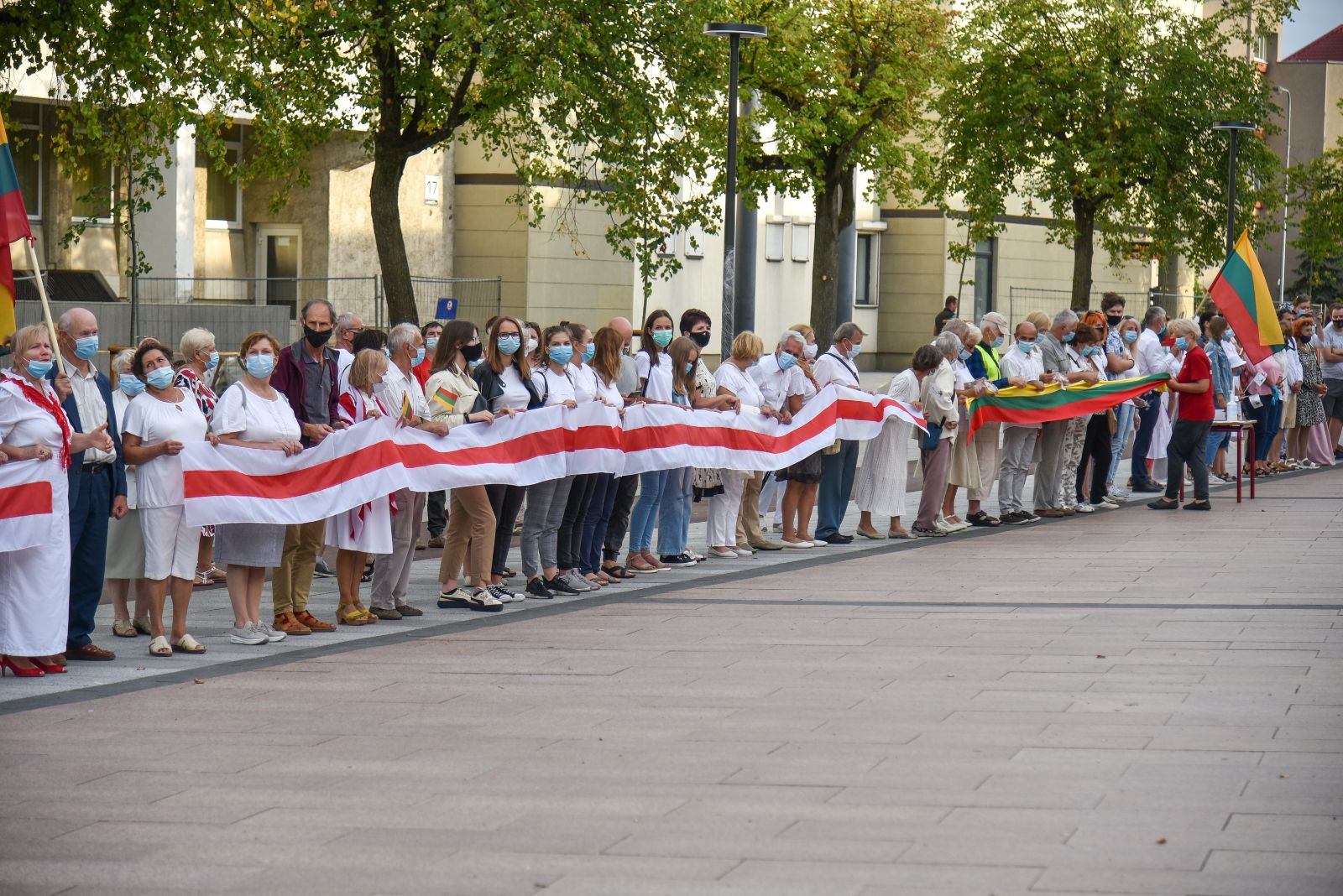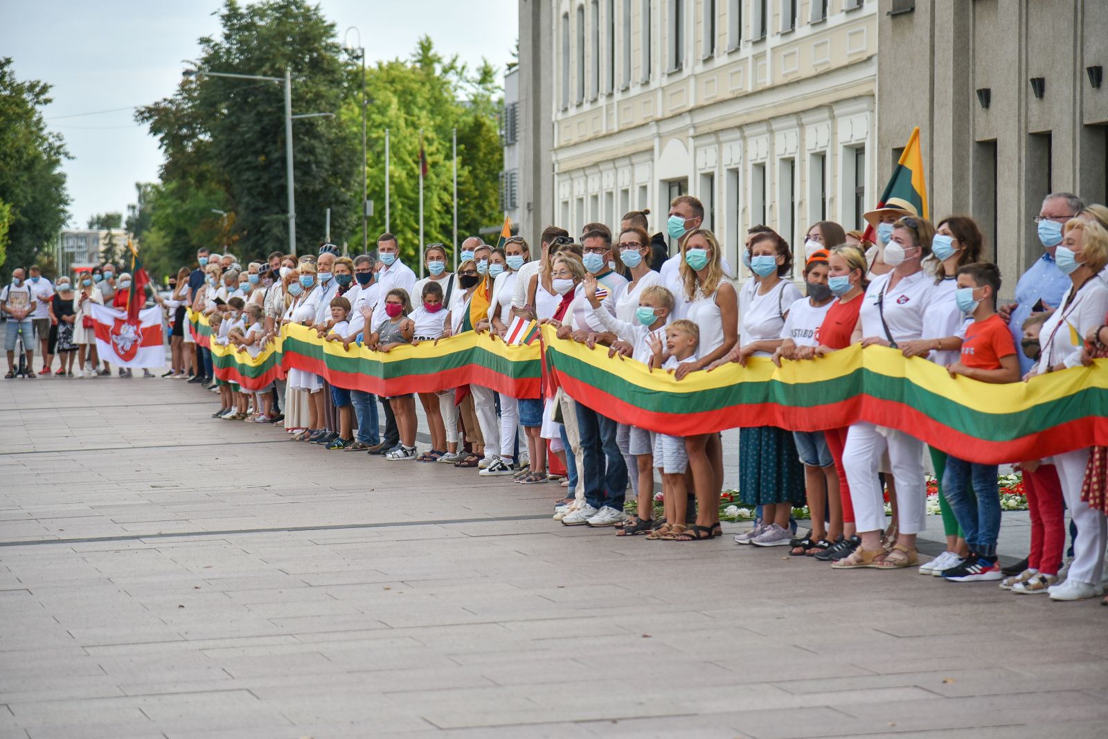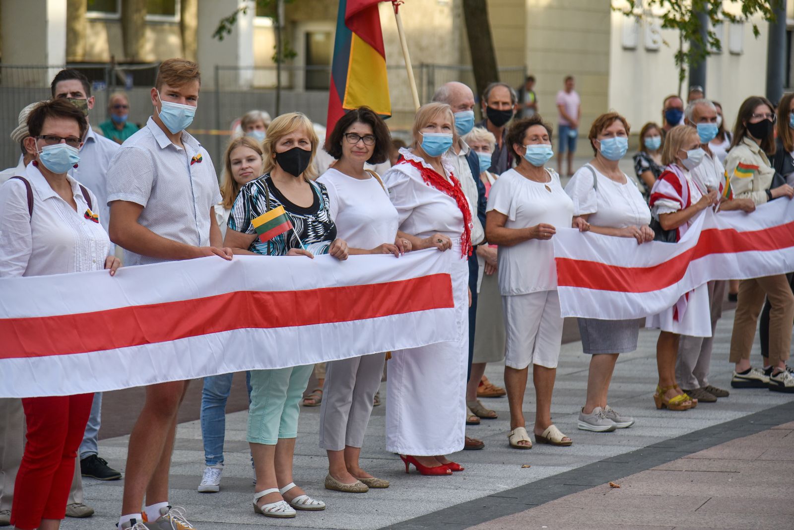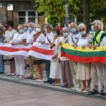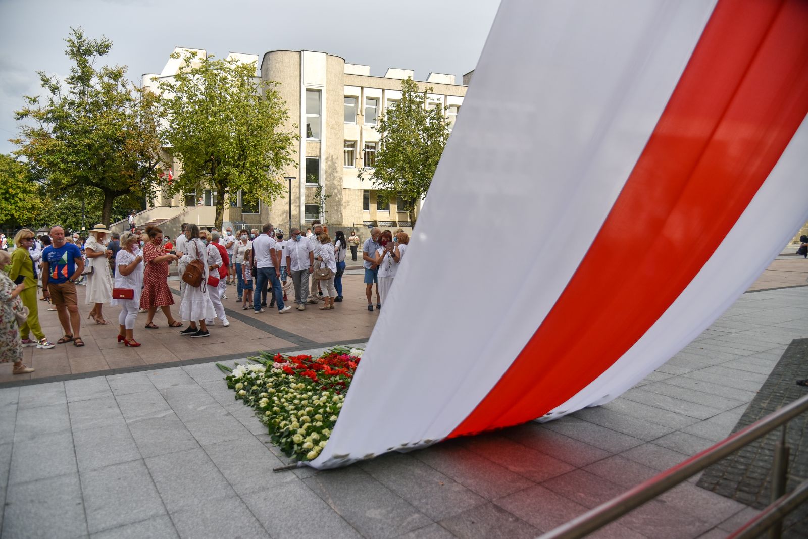 Centrinėje miesto Laisvės aikštėje žmonės rinkosi nešini lietuviškomis trispalvėmis ir tautinėmis Baltarusijos vėliavomis, baltomis ir raudonomis gėlėmis.