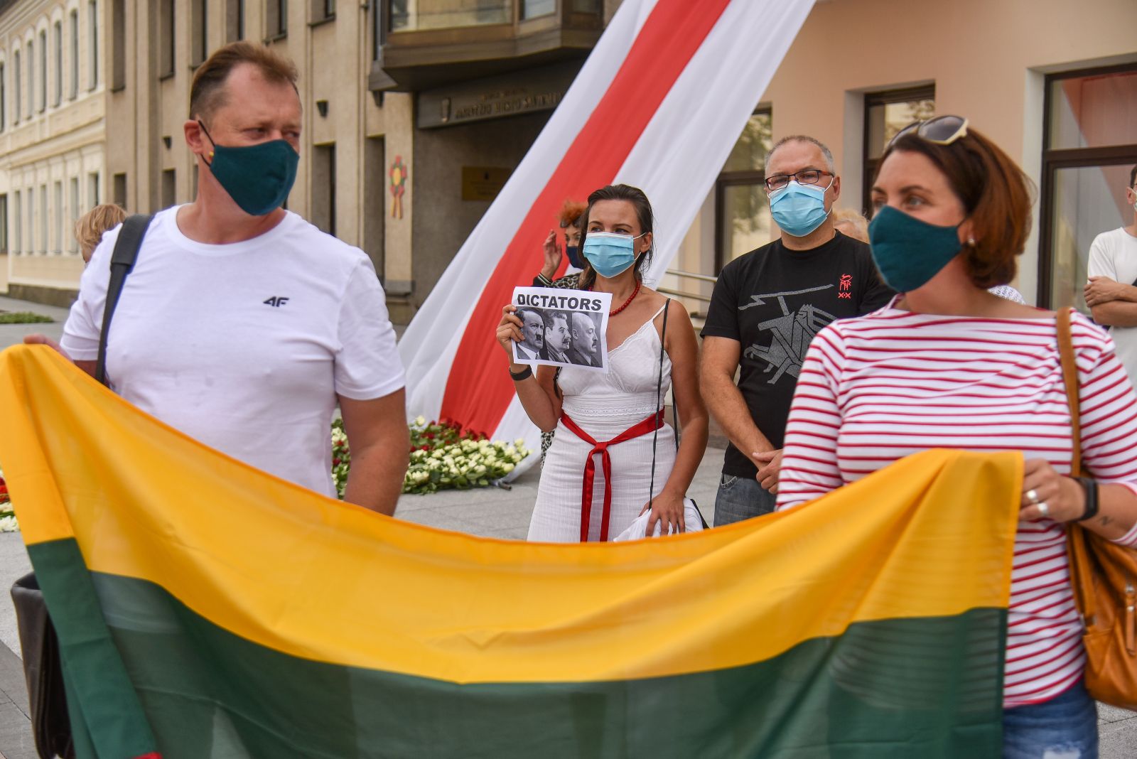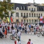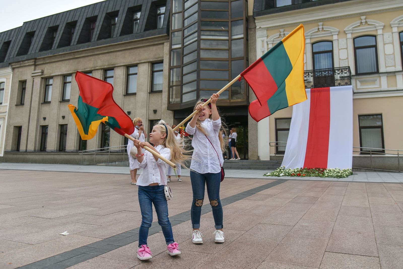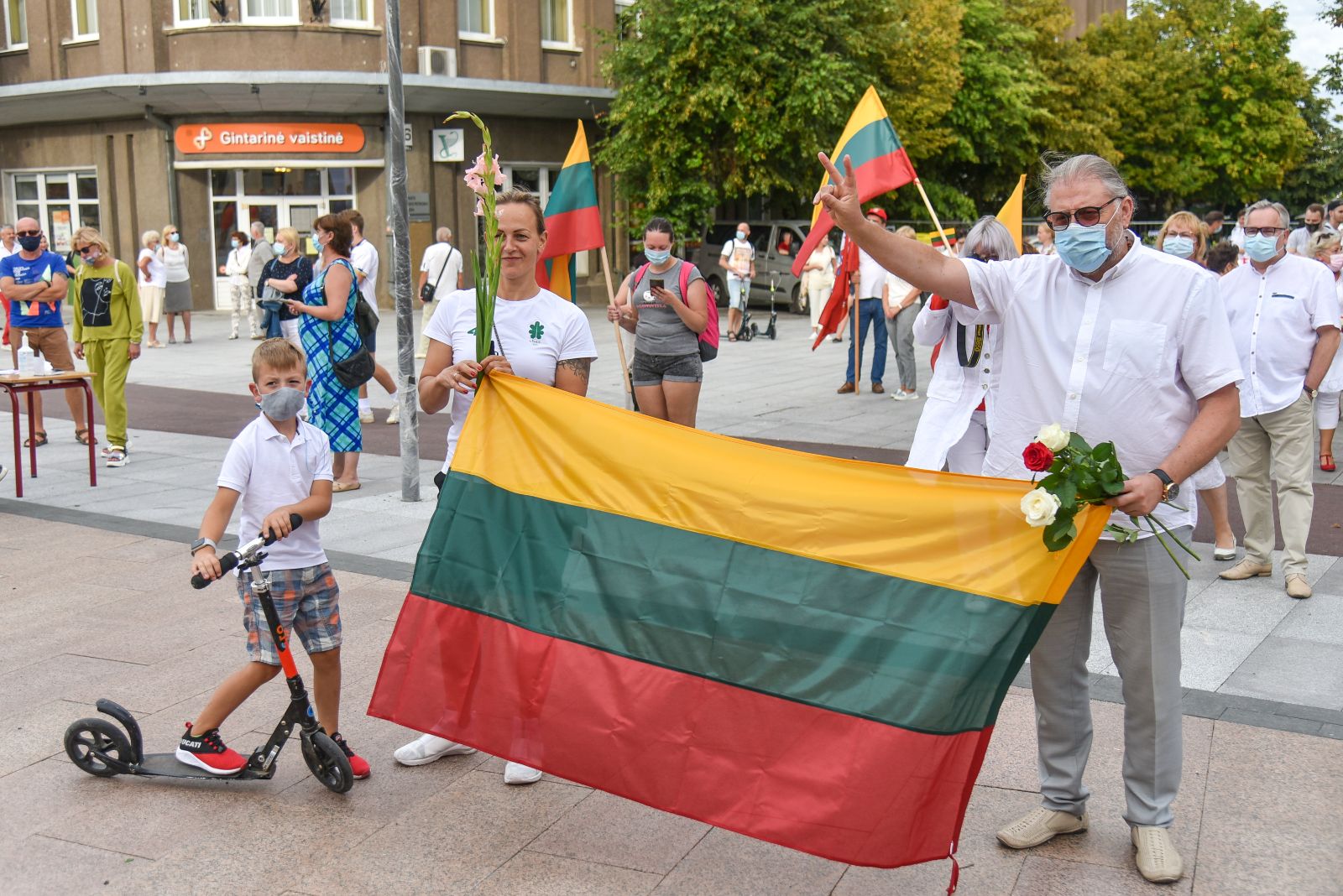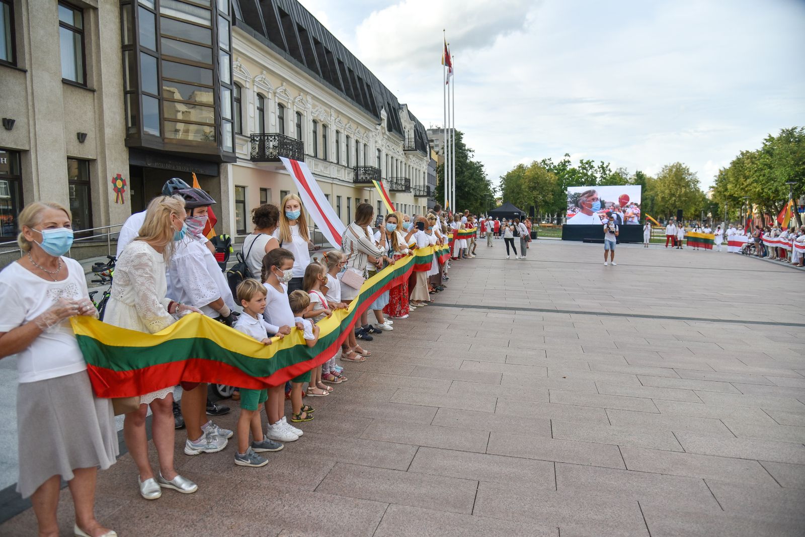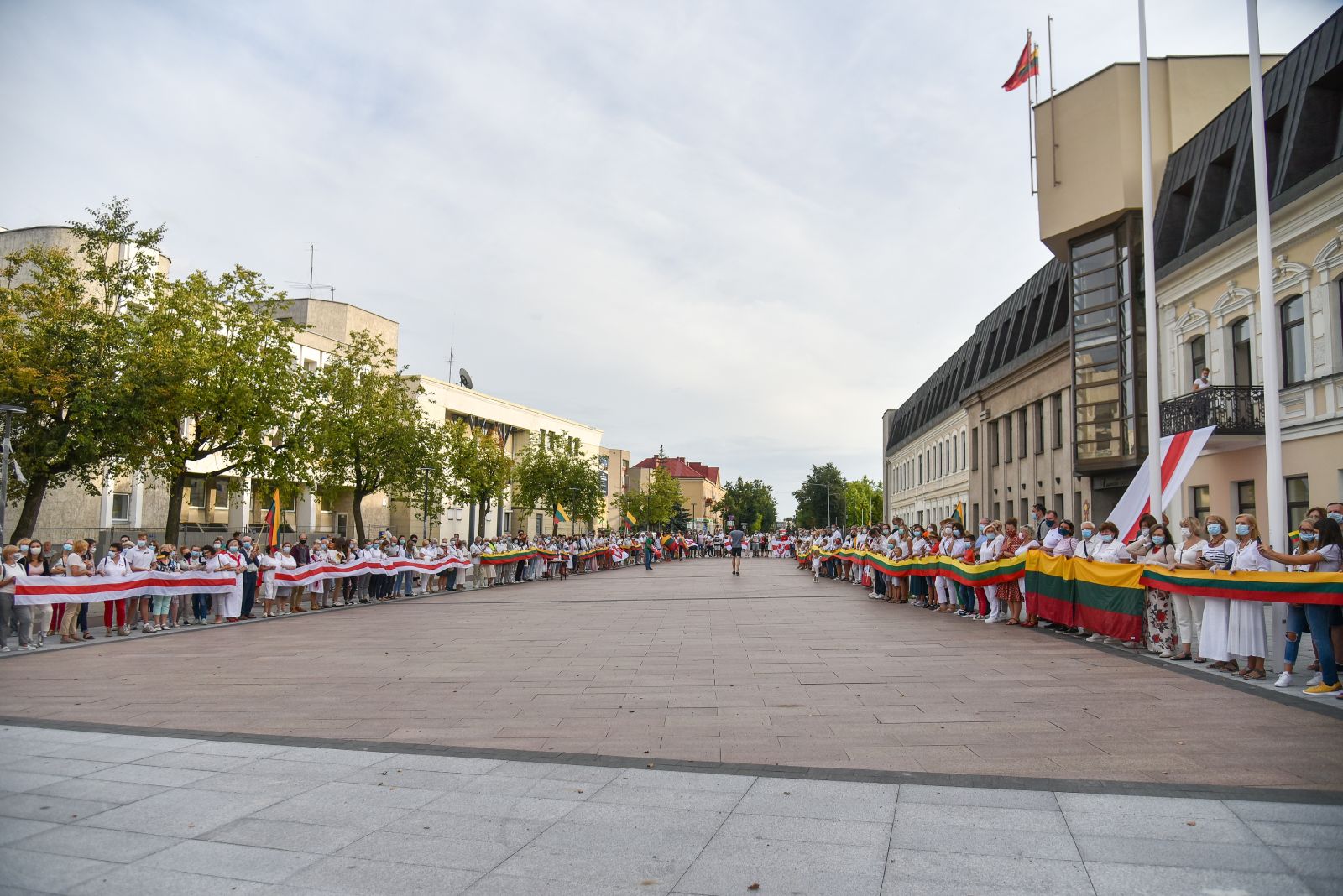 Centrinėje miesto Laisvės aikštėje žmonės rinkosi nešini lietuviškomis trispalvėmis ir tautinėmis Baltarusijos vėliavomis, baltomis ir raudonomis gėlėmis.