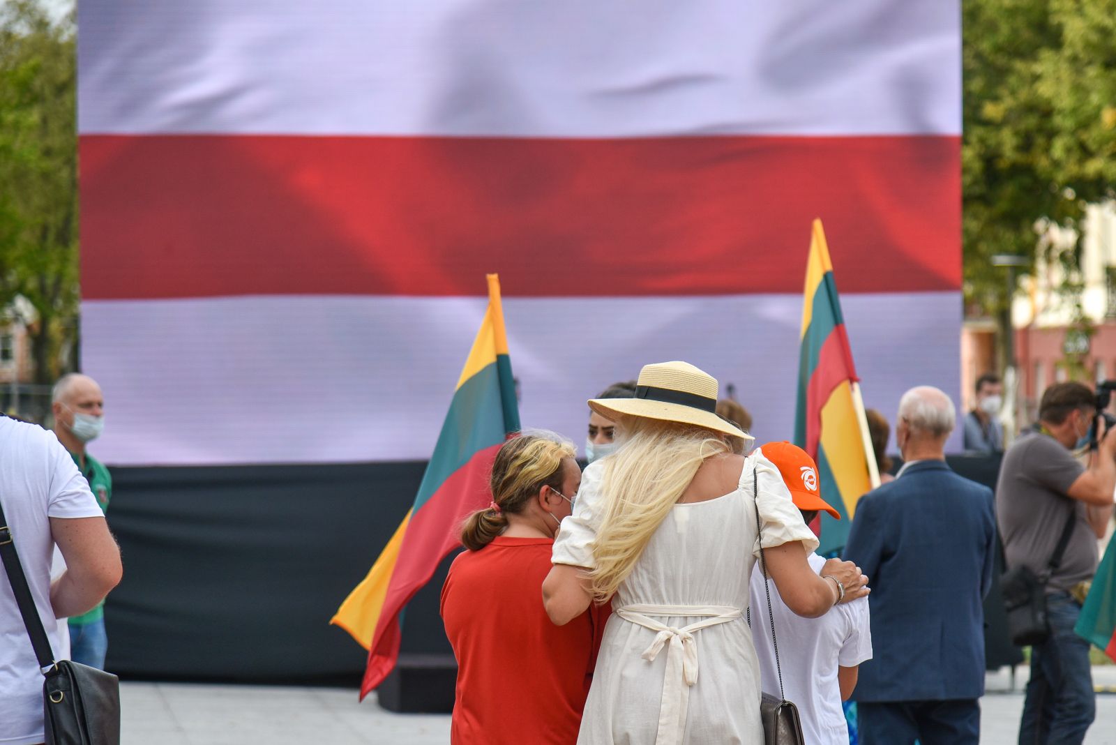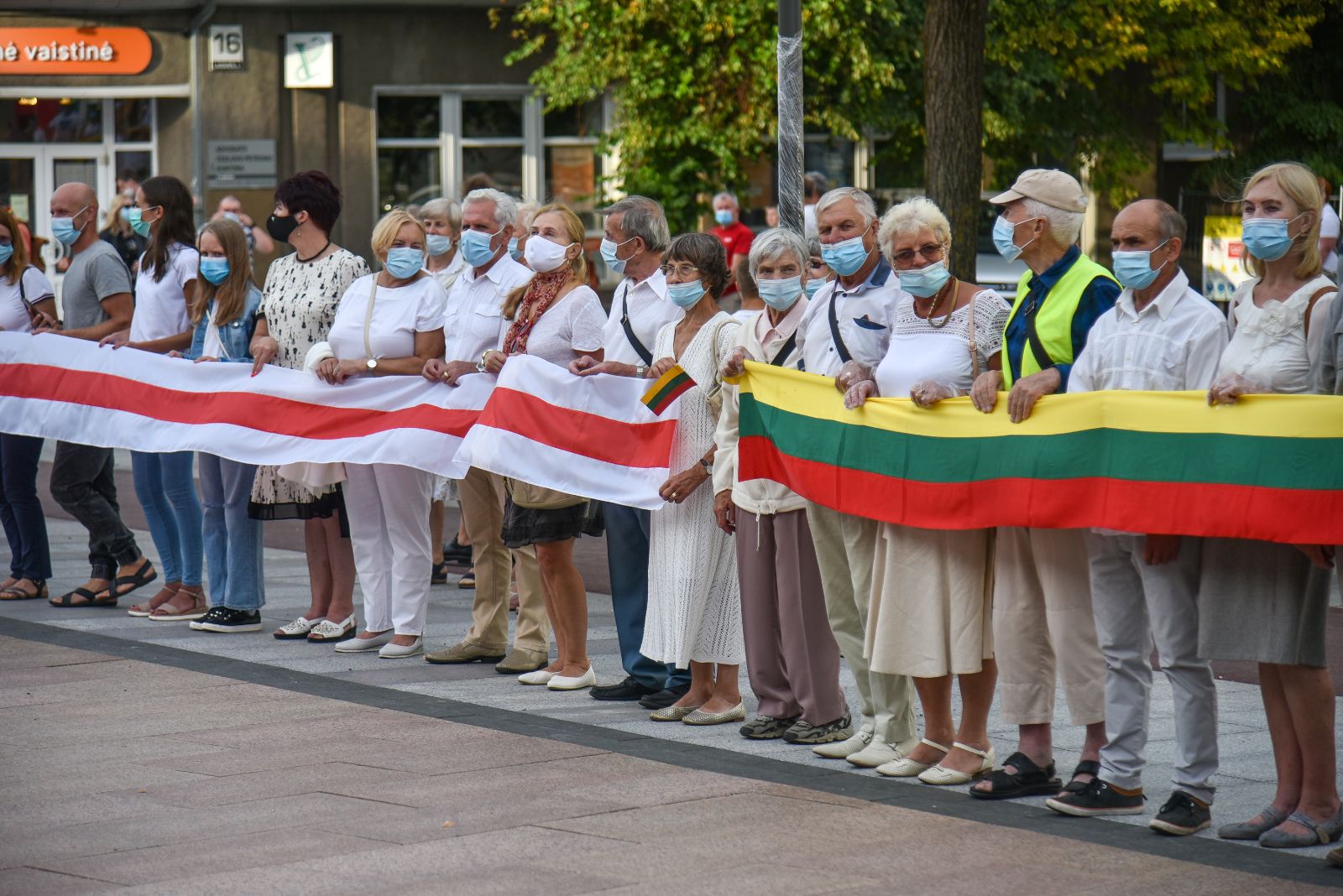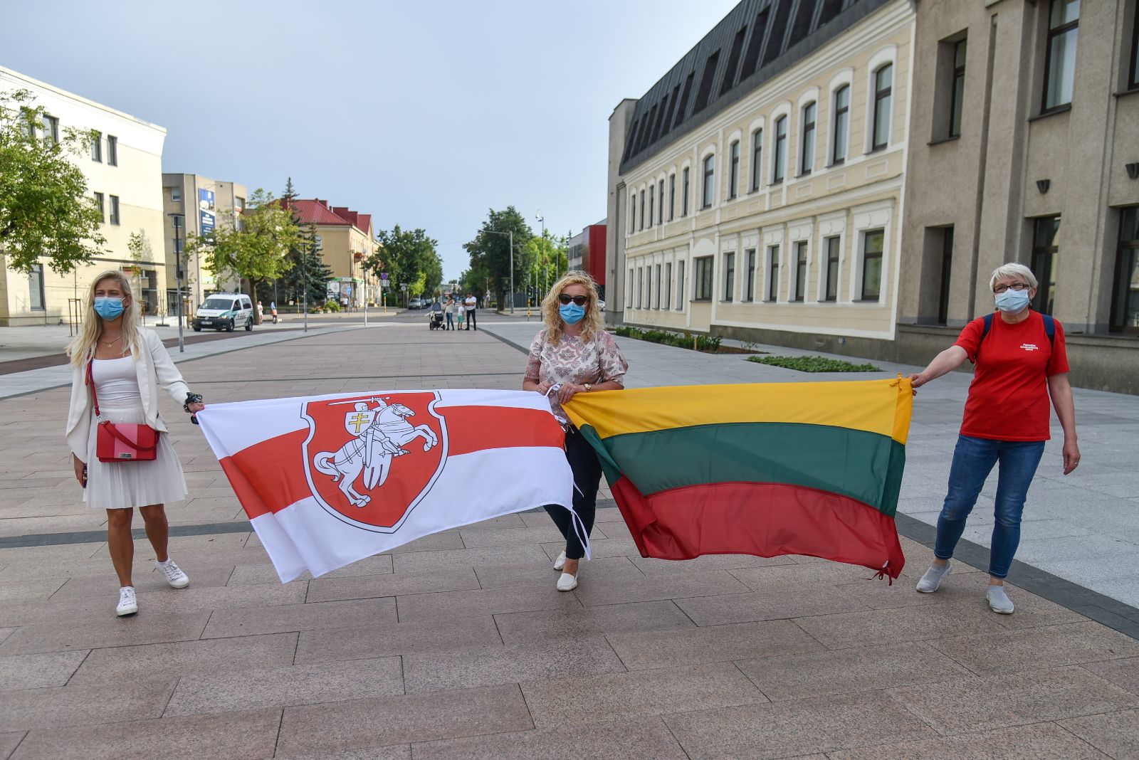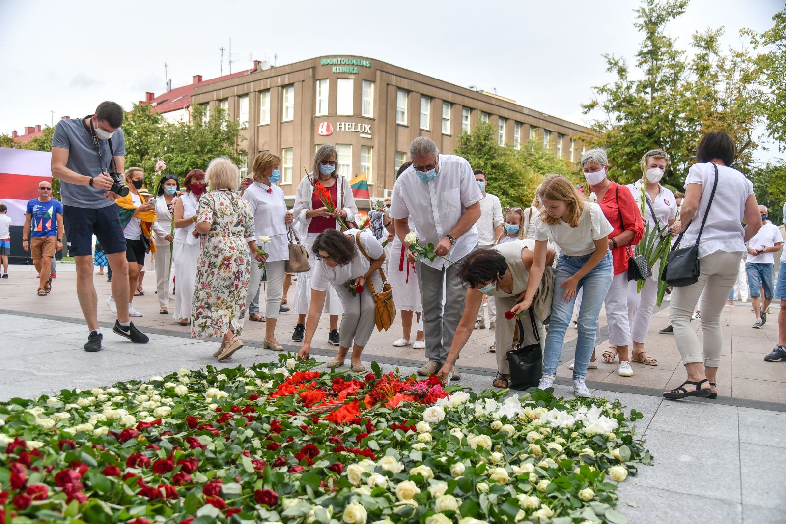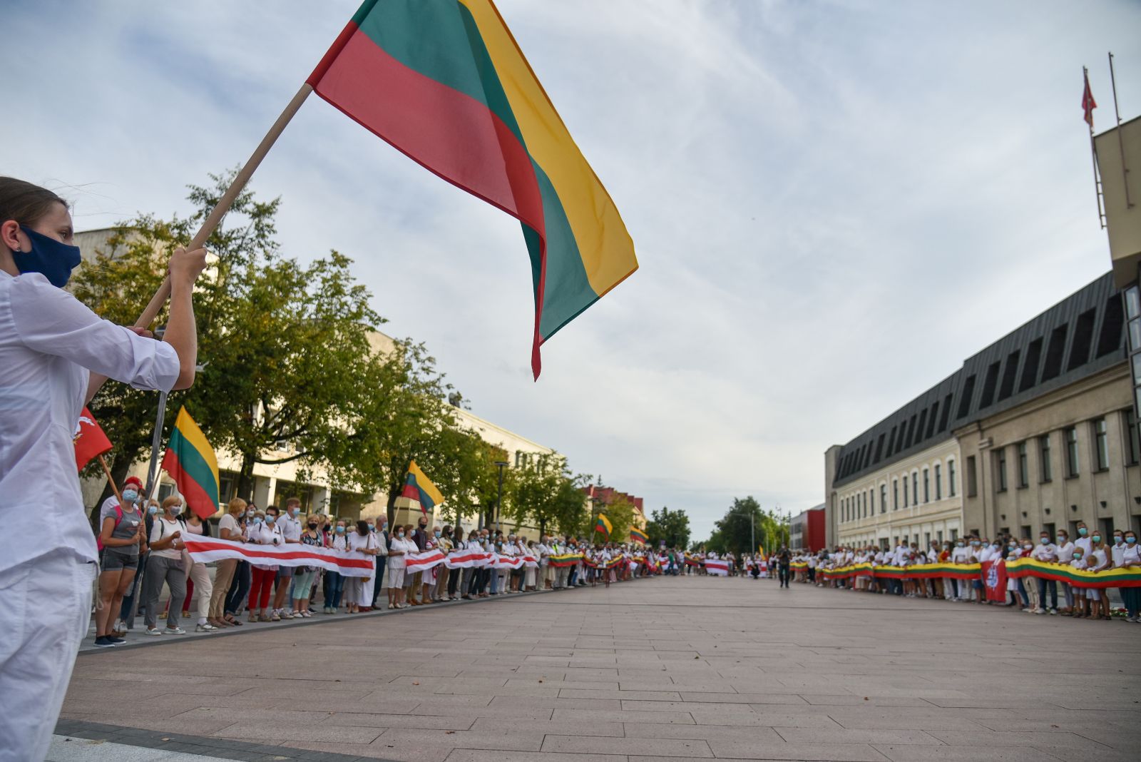 Centrinėje miesto Laisvės aikštėje žmonės rinkosi nešini lietuviškomis trispalvėmis ir tautinėmis Baltarusijos vėliavomis, baltomis ir raudonomis gėlėmis.