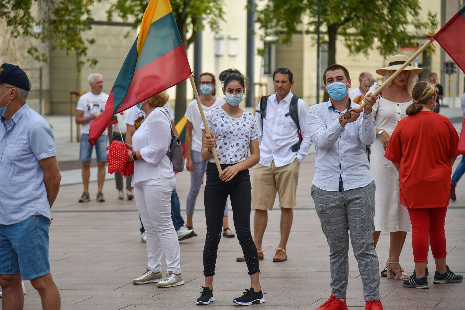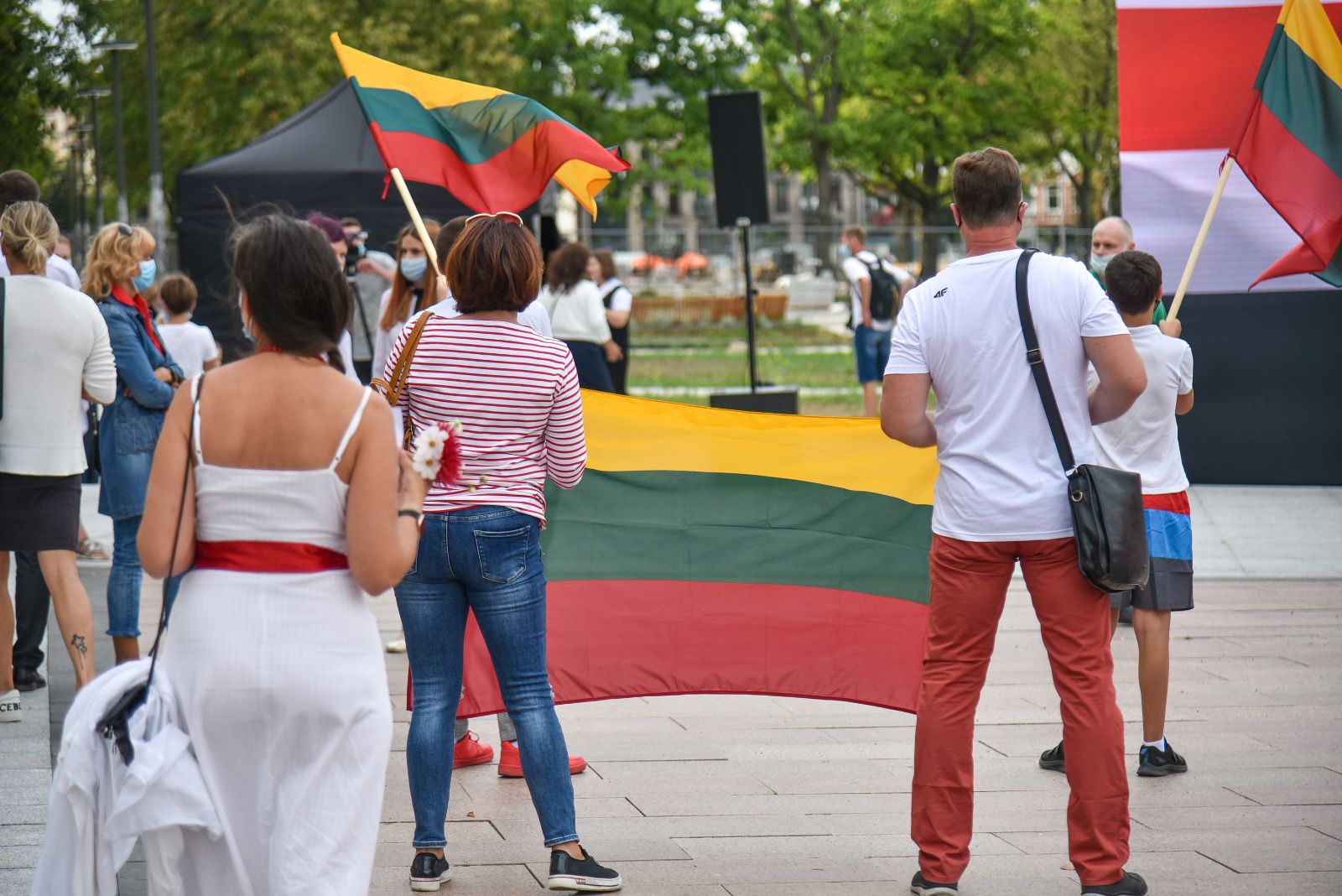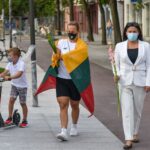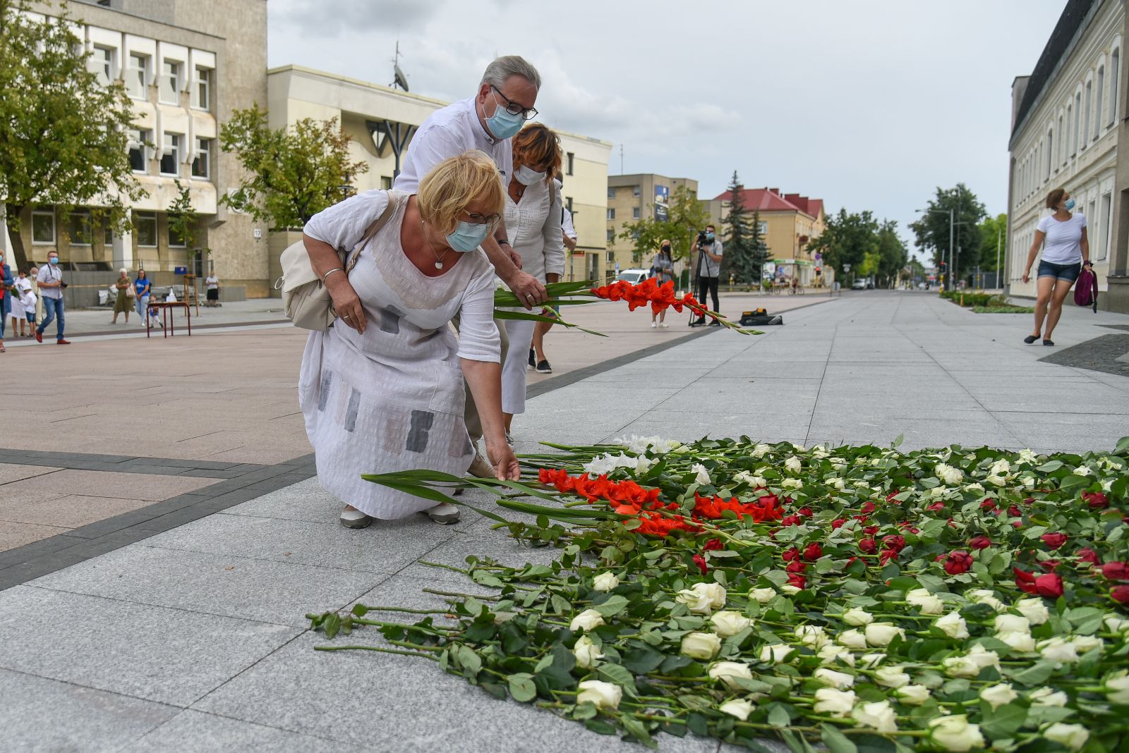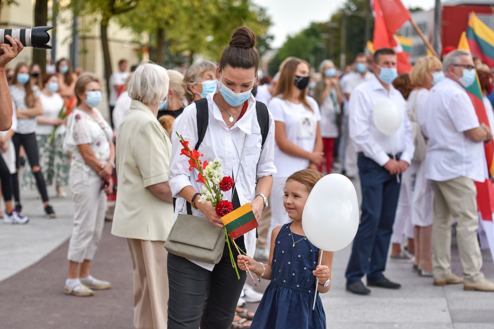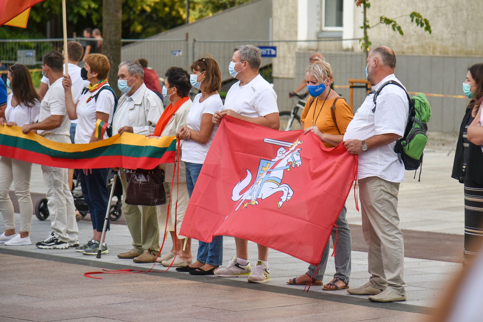 Centrinėje miesto Laisvės aikštėje žmonės rinkosi nešini lietuviškomis trispalvėmis ir tautinėmis Baltarusijos vėliavomis, baltomis ir raudonomis gėlėmis.