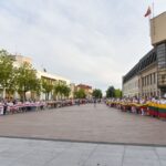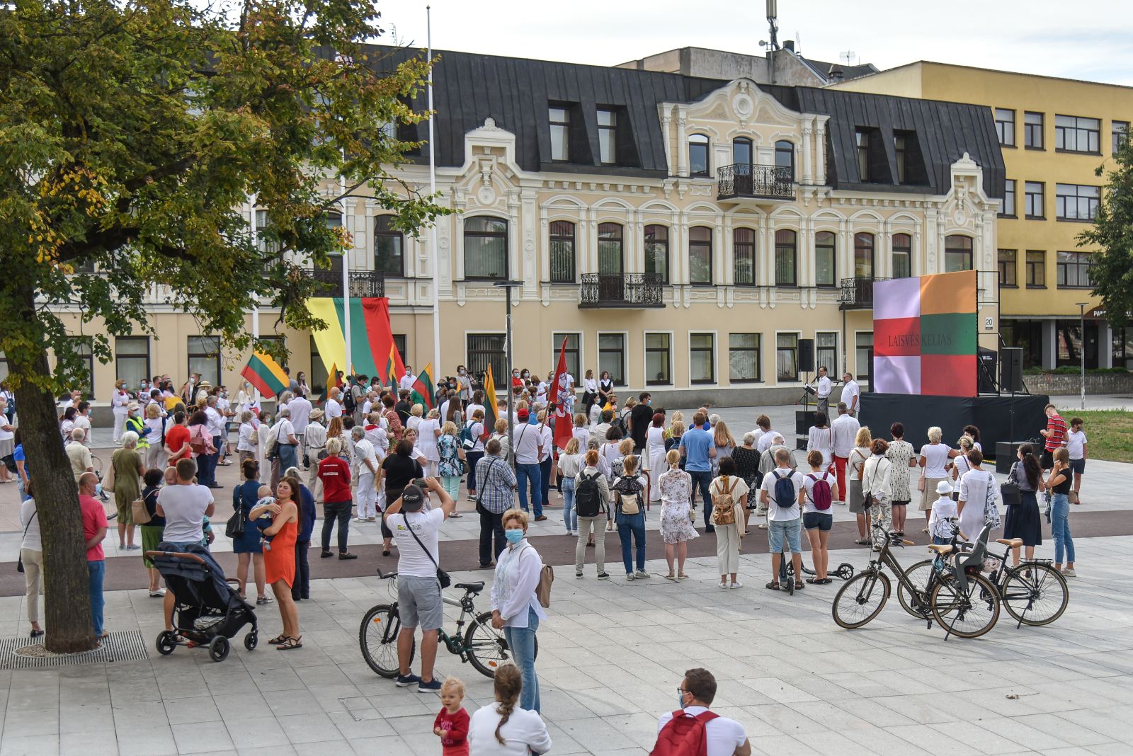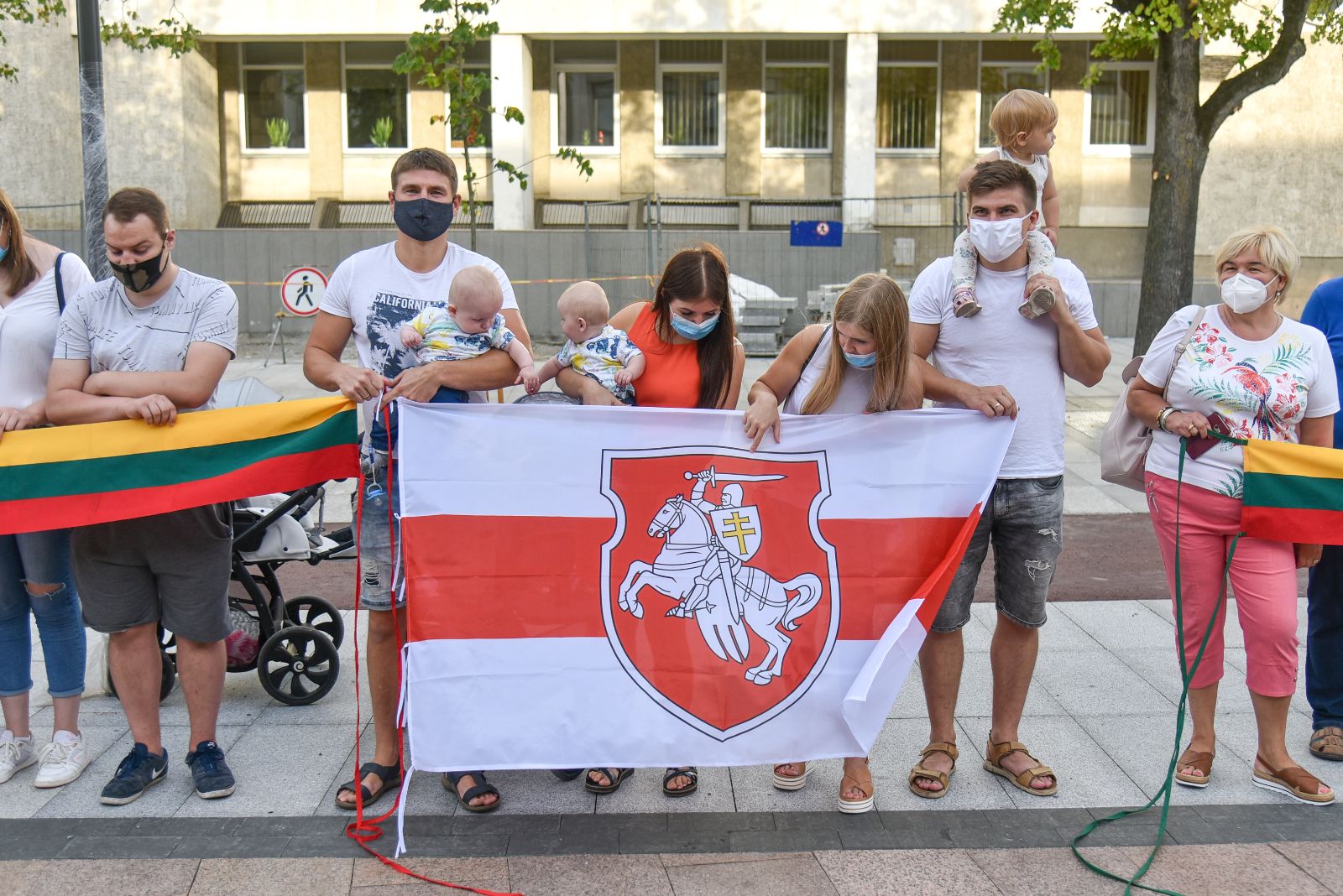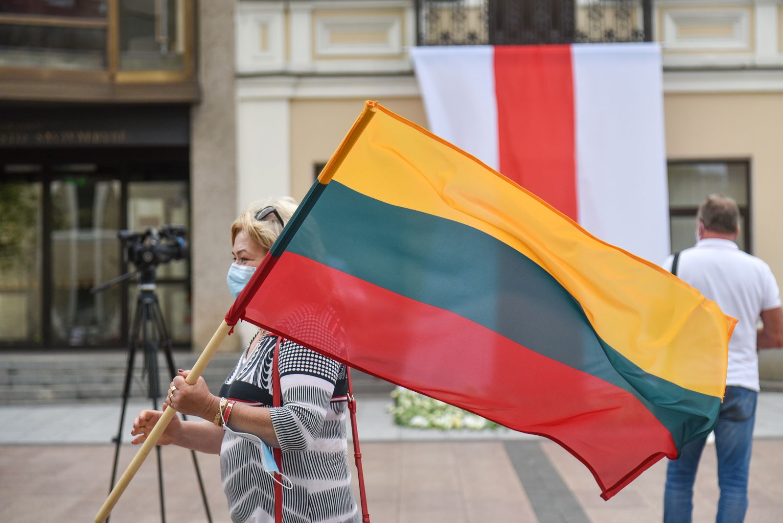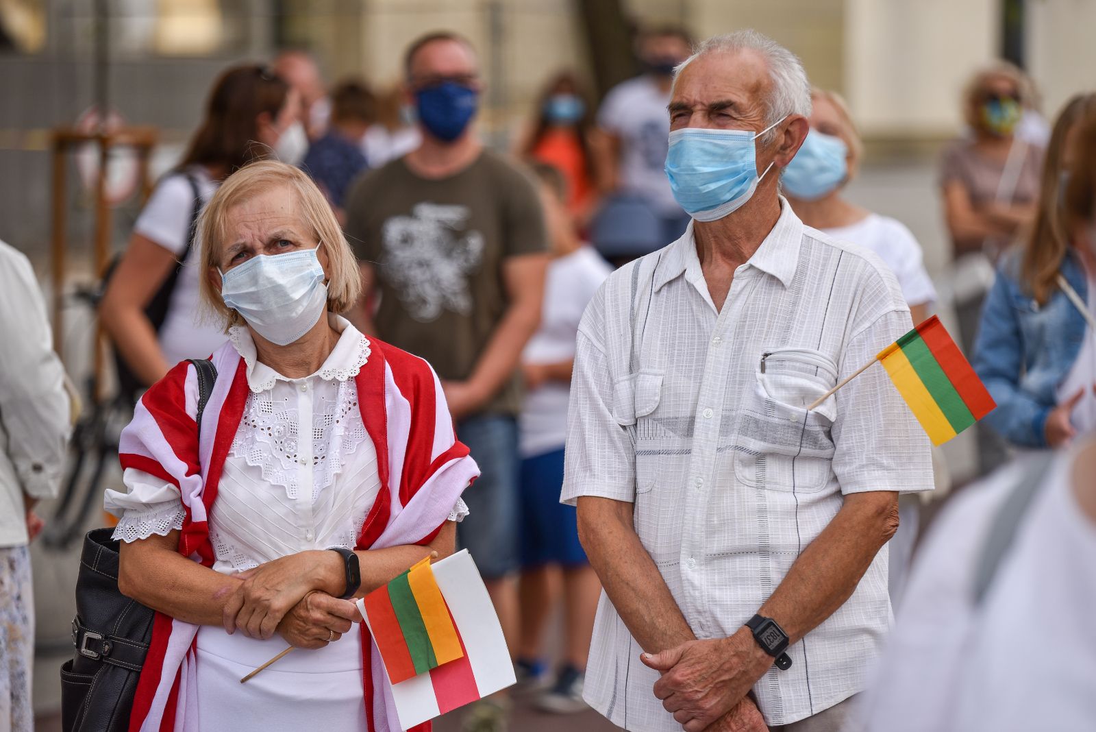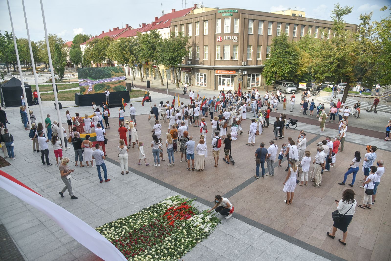 Centrinėje miesto Laisvės aikštėje žmonės rinkosi nešini lietuviškomis trispalvėmis ir tautinėmis Baltarusijos vėliavomis, baltomis ir raudonomis gėlėmis.