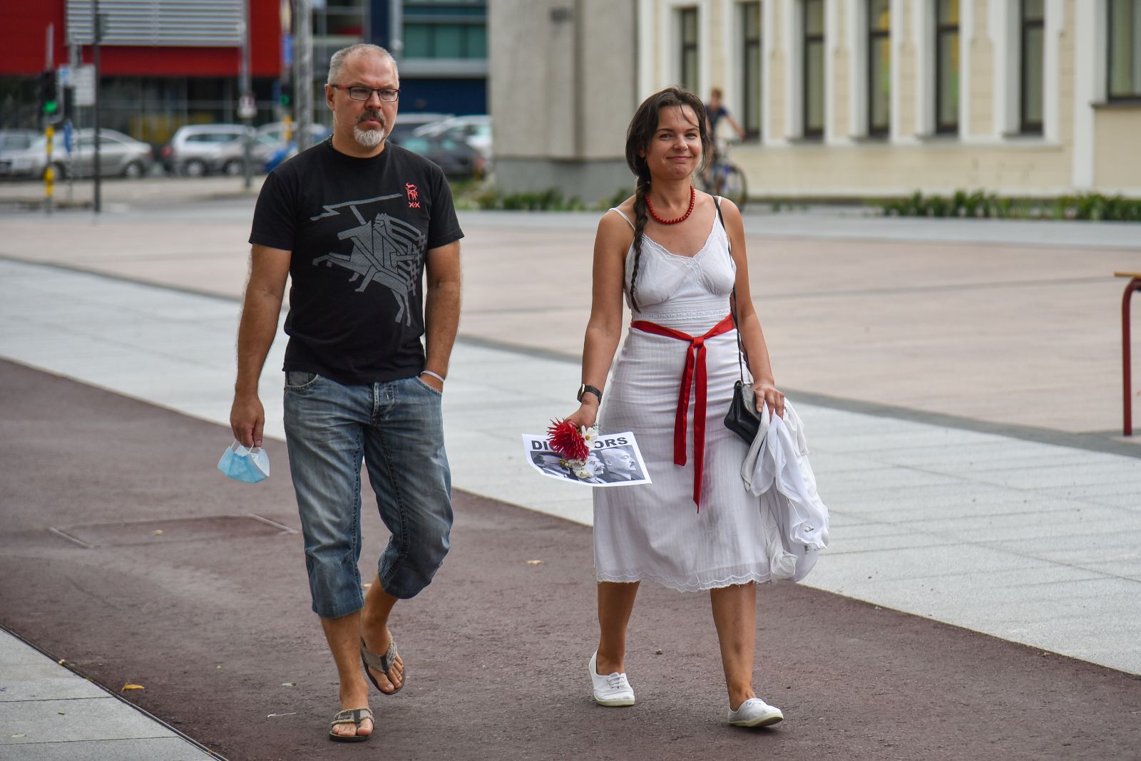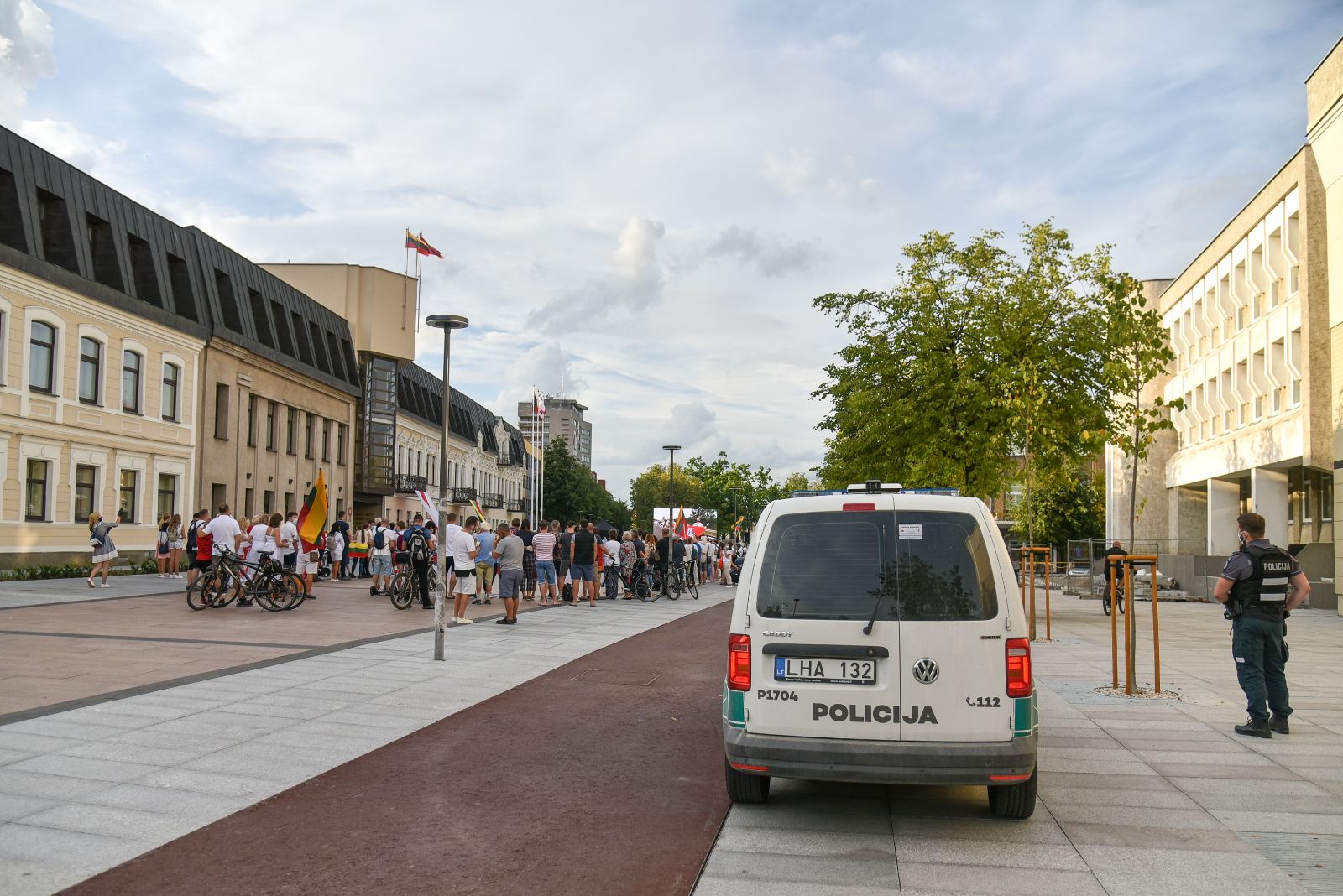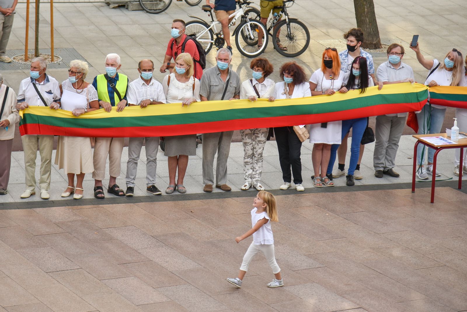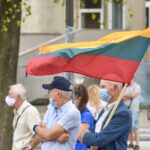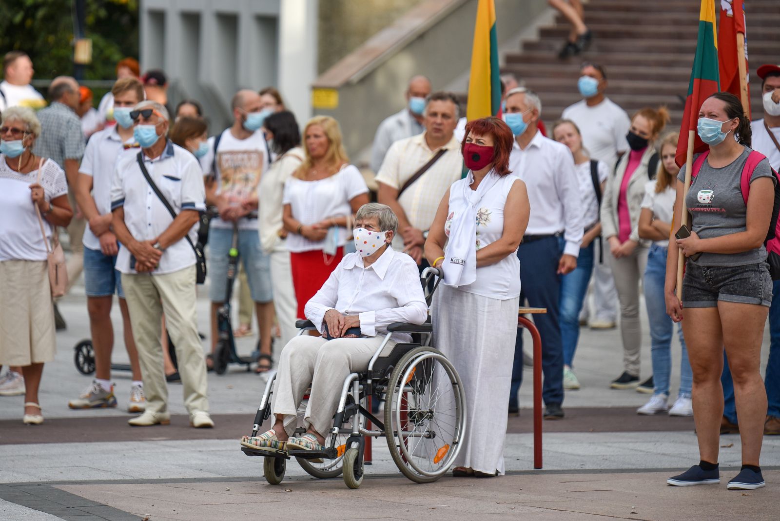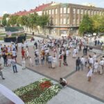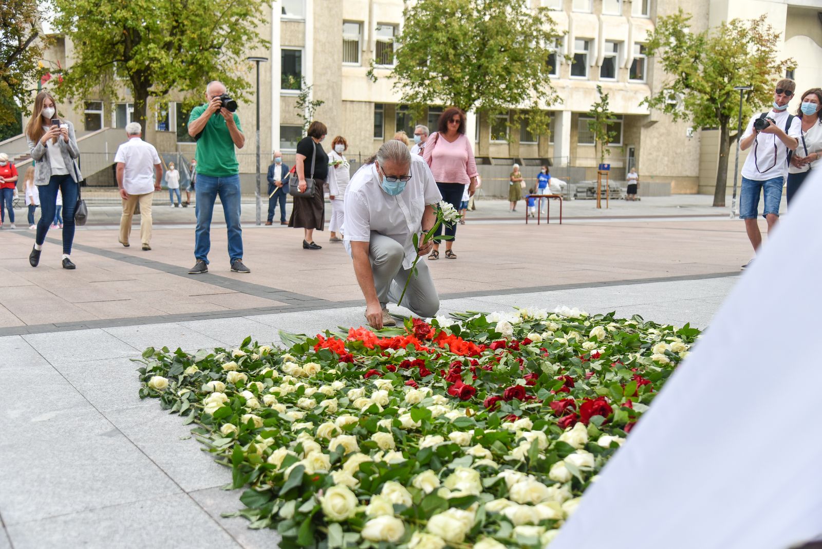 Centrinėje miesto Laisvės aikštėje žmonės rinkosi nešini lietuviškomis trispalvėmis ir tautinėmis Baltarusijos vėliavomis, baltomis ir raudonomis gėlėmis.