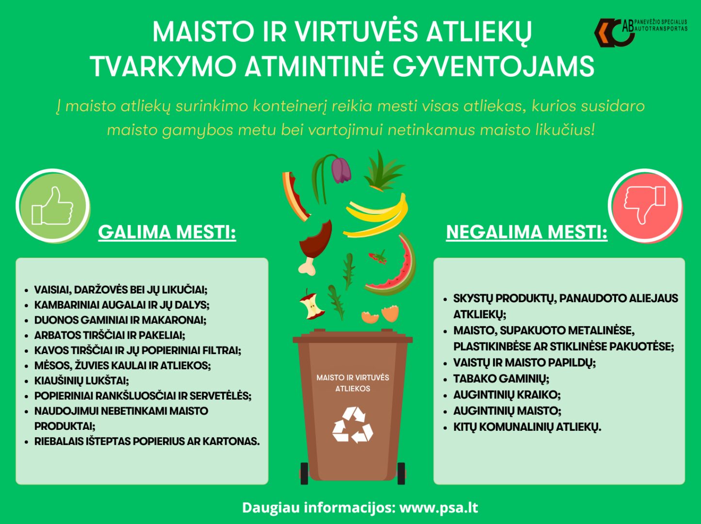 AB „Panevėžio specialus autotransportas“ informuoja, kad naujame maisto ir virtuvės atliekų rūšiavimo pilotiniame projekte dalyvaujantiems privačių valdų savininkams Sausio 4-8 dienomis bendrovės komanda planuoja į jų gyvenamąsias vietas pristatyti nemokamas maisto ir virtuvės atliekų rūšiavimo priemones: 7 litrų talpos rudus kibirėlius su lipduku, nurodančiu kokias atliekas galima mesti, bei 120 litrų talpos rudus konteinerius.