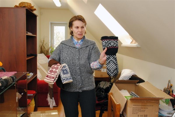 Į didžiules dėžes ji dėjo įvairiaspalves raštuotas pirštines, siuvinėtas prijuostes, dailias riešines, veltas šlepetes ir kitus darbštuolių gaminius. Jais kurį laiką galės grožėtis ir Radviliškio kultūros centro lankytojai.