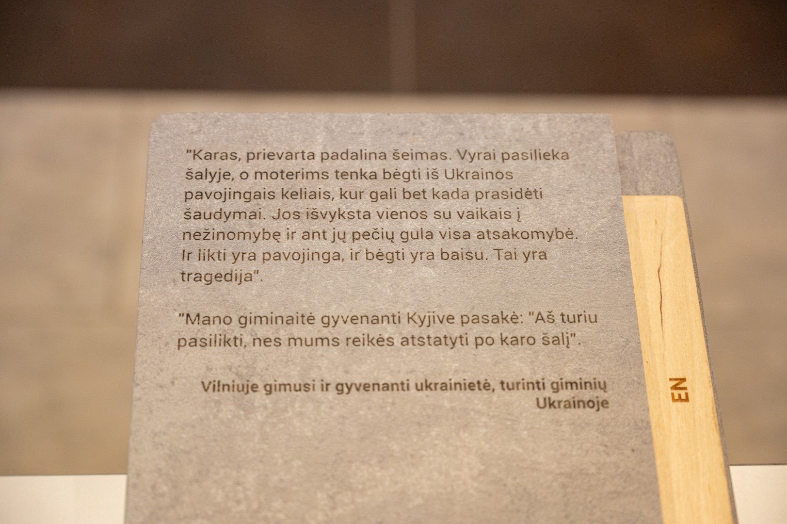 N. Latvytė įsitikinusi: paroda „Gydant sielos žaizdas“ – ne tik apie praeitį, bet ir apie dabartį. Moterims ir dabar tenka priimti sudėtingus sprendimus, patirti sunkius pasirinkimus. Tai grindžiantys faktai visai šalia – su Rusijos agresija besigrumiančioje Ukrainoje. Kad ir toje pačioje visame pasaulyje kruvinai išgarsėjusioje Bučoje. Neatsitiktinai parodoje atskiras skyrelis skirtas ukrainiečių moterų liudijimams.
