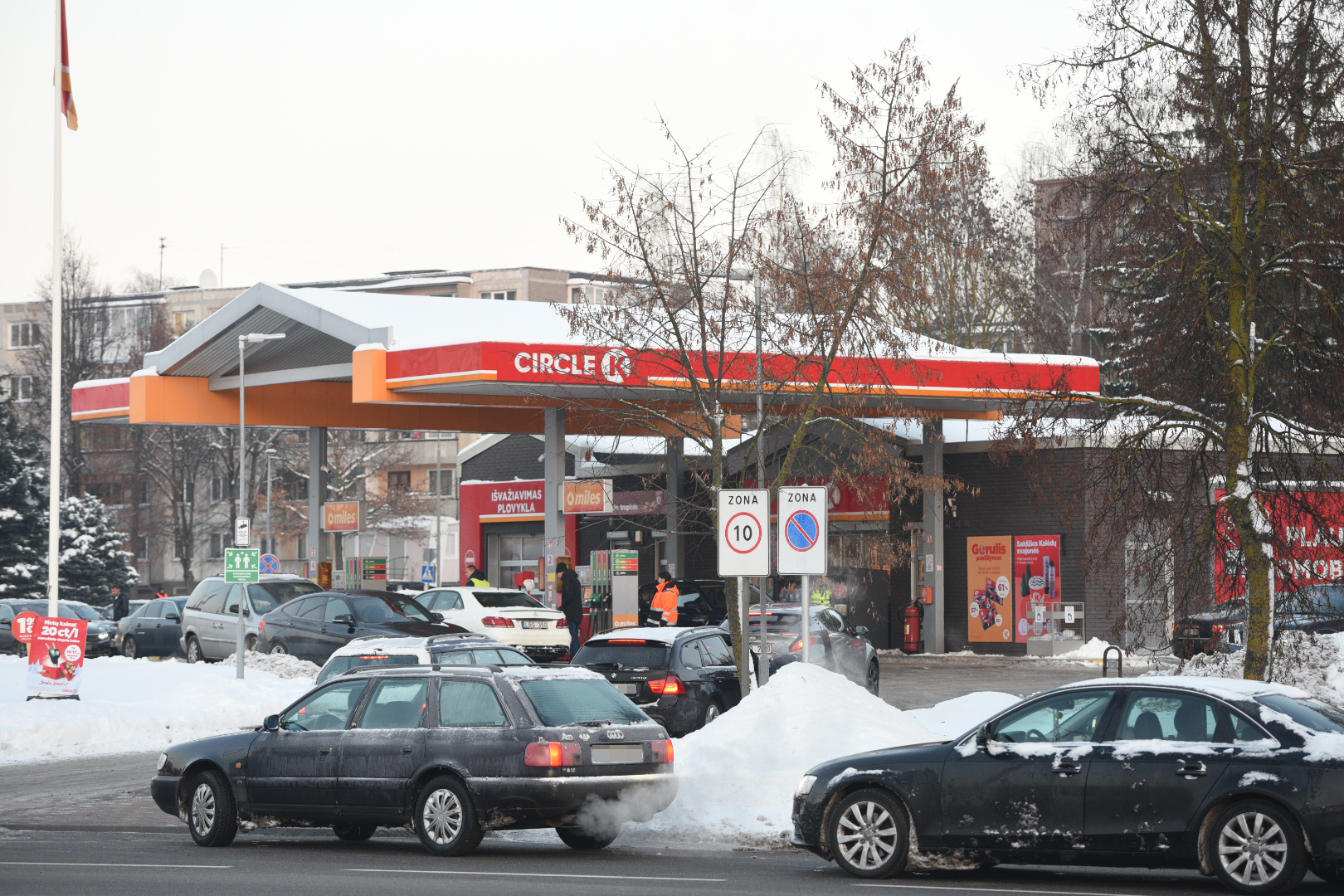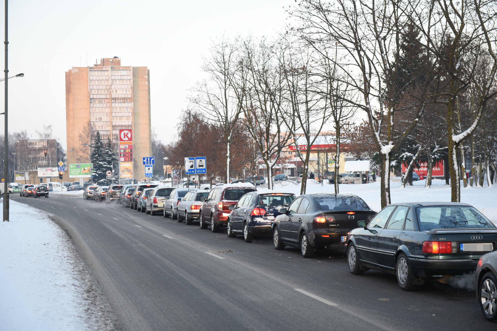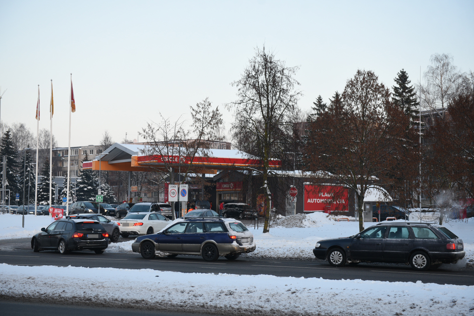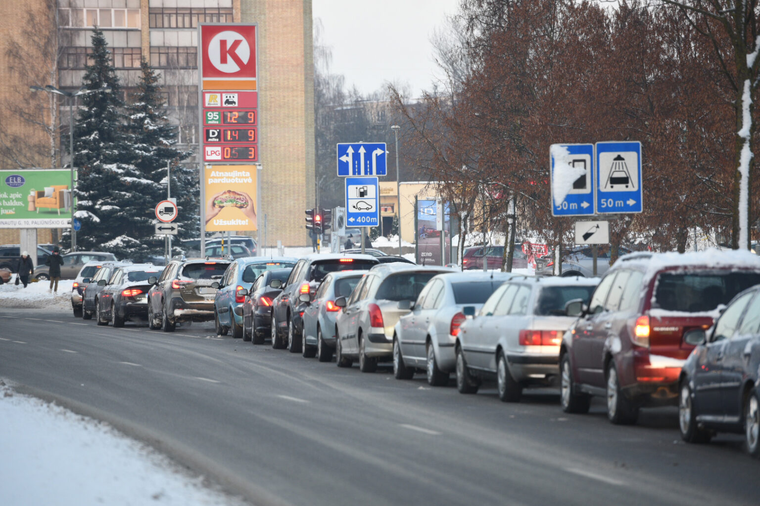 Panevėžyje ketvirtadienio popietę gatvėse nusidriekė kolonos automobilių, laukiančių eilės įsipilti pigesnių degalų.