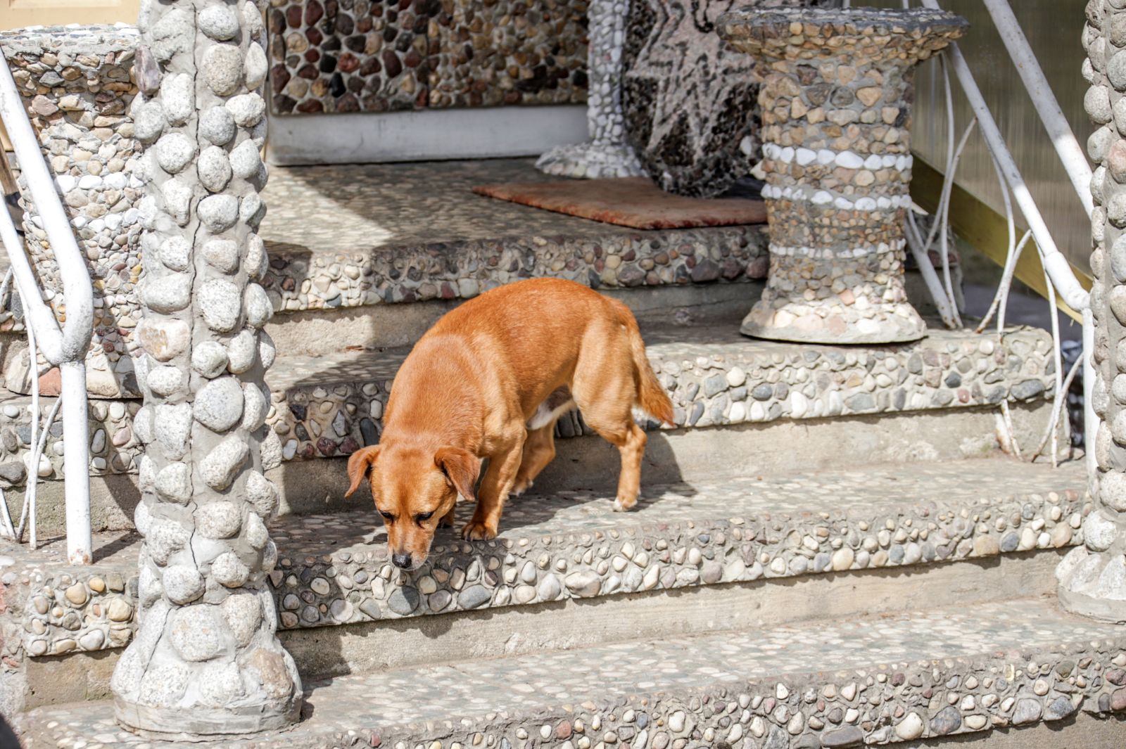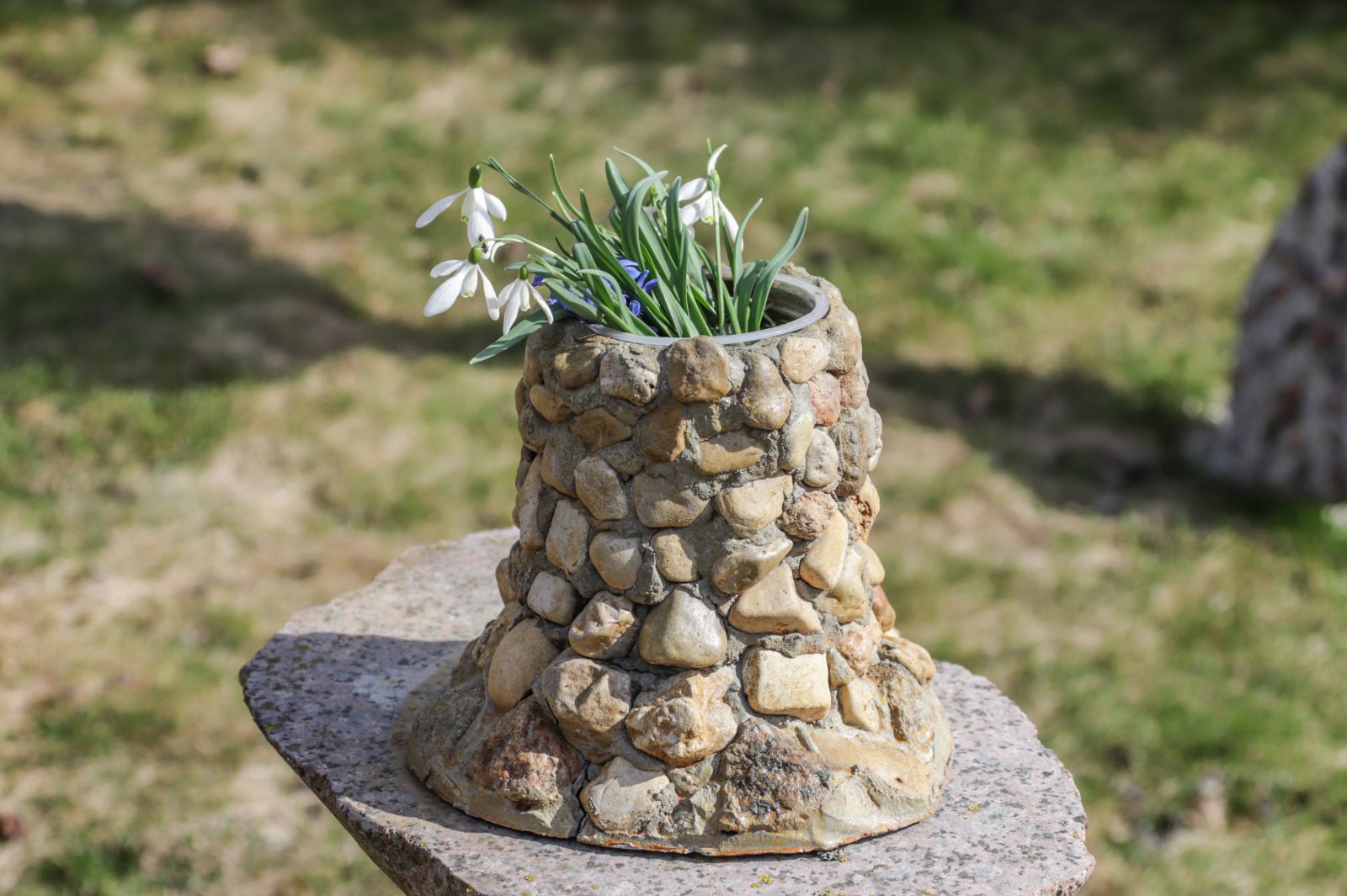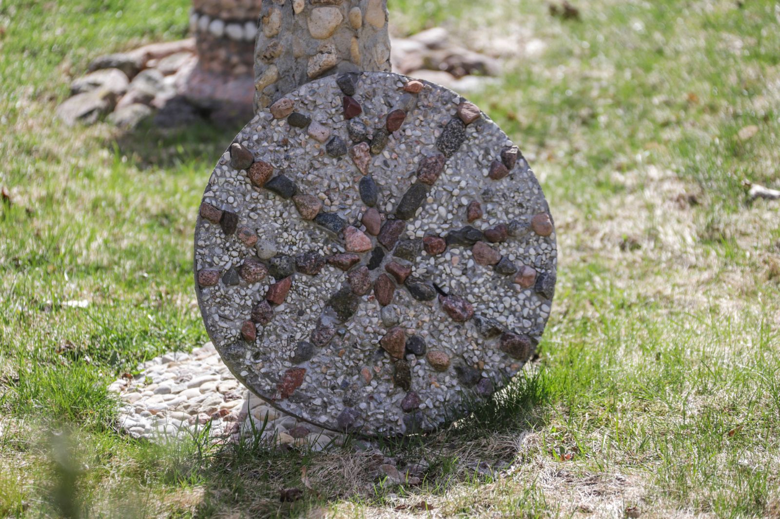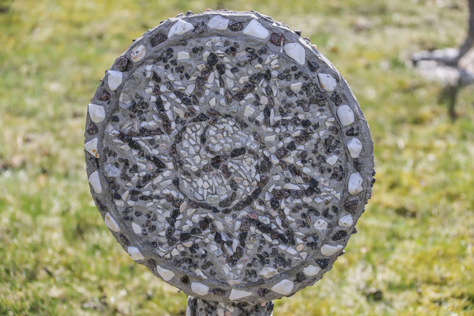 Čia pat akmeninė pavėsina, pilna akmeninių daiktų. Įvairių formų vazos, staliukai, nuotraukų rėmeliai ir kiti kūriniai ir namų viduje, žinoma, irgi iš akmens. Akmenukais dekoruoti baldai ir kiti daiktai.