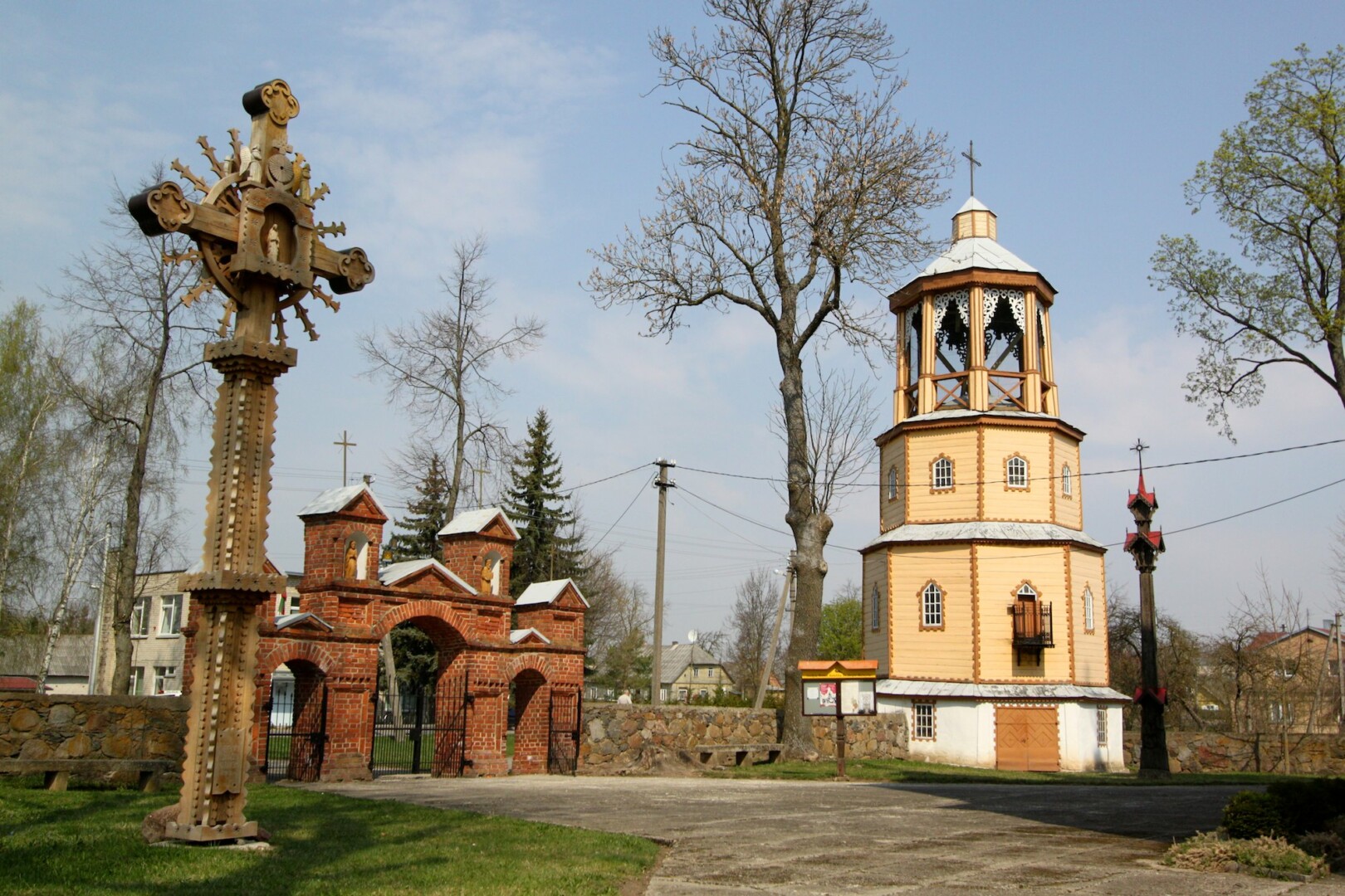 Bažnyčios šventoriuje stovinti varpinė, išsiskirianti medine ažūrine puošyba, žinoma kaip knygnešių vieta.