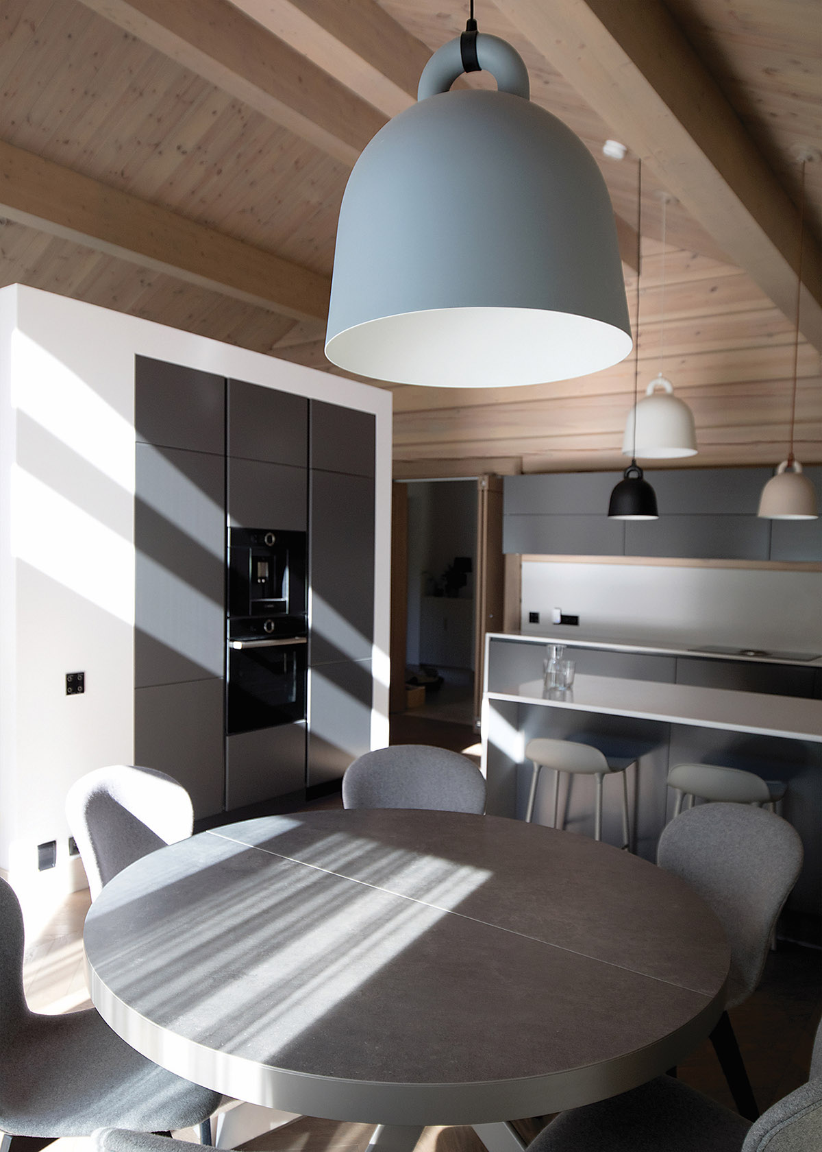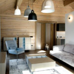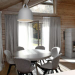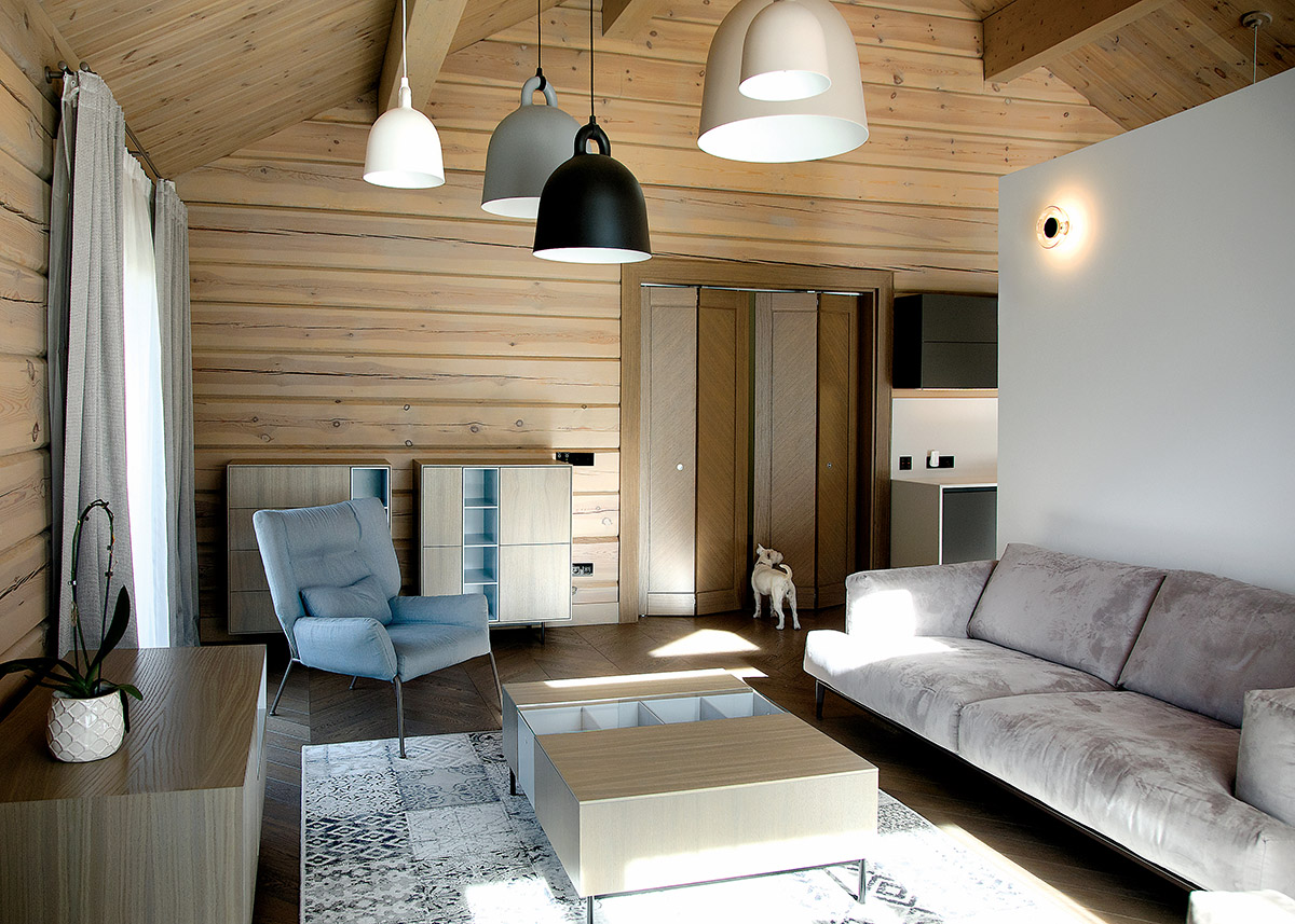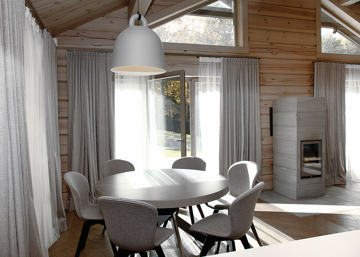 Ramias pastelines spalvas parinkusi architektė nusprendė šiek tiek prigesinti ir natūralius rąstus, juos tonuodama. Nuo grindų į viršų kylančių pastelinių spalvų visumą svetainėje darniai papildo įvairiaspalviai varpo formos šviestuvai.