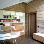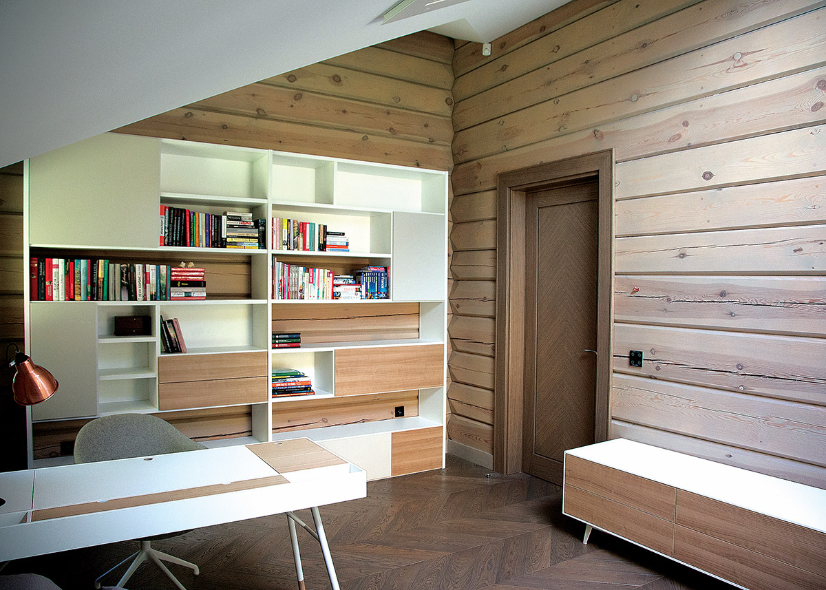 Kurdama interjerą architektė privalėjo numatyti, kad rąstai kelerius metus „vaikščios“. Tai apsunkino durų, baldų gamybą bei montavimą. „Virtuvėje tarp stalviršio ir viršutinės sienelės paliktas tarpelis, kad rąstai turėtų kur sėsti. Viskas vaikšto, todėl negali baldo tiesiog prikalti prie sienos ir palikti. Reikia ieškoti kitų išeičių, tačiau viską daryti taip, kad palikti tarpeliai nekristų į akis“, – rąstinio namo interjero įrengimo subtilumus aiškina architektė.
