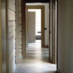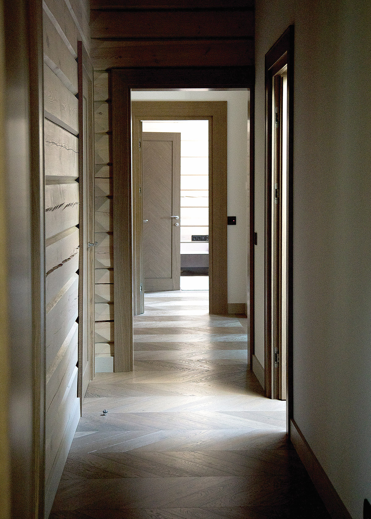 Namo grindims D. Jovaišienė parinko miesto interjerams būdingą stilistiką – prancūzišką eglutės raštą. Stambių parketlenčių klojimo būdas papildo ir kartu supriešina horizontalias sienas.