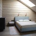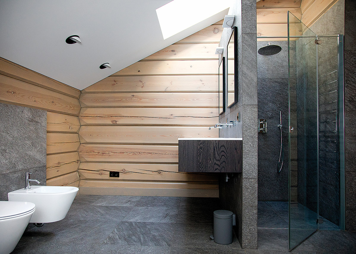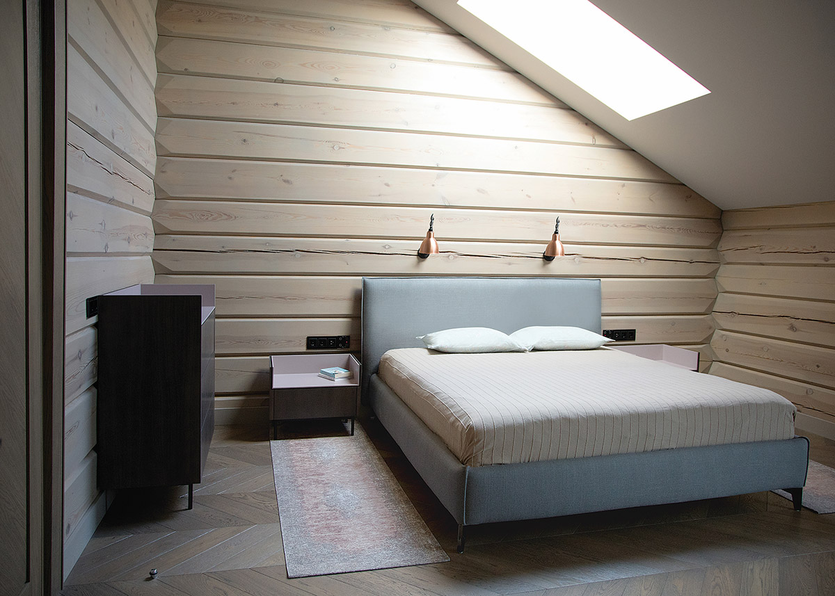 Prieškambario tambūre prasidedantys mediniai laiptai veda į antrą aukštą – privačią šeimos zoną. Šalia šeimininkų miegamojo yra modernus vonios kambarys. Jo apdailai specialistė teigia tikslingai parinkusi skirtingo piešinio akmens masės plyteles. „Ši medžiaga ir konkuruoja su rąstais, ir juos papildo“, – atkreipia dėmesį pašnekovė.