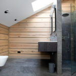 Pirmame aukšte, vadinamojoje ūkinėje zonoje, įrengtas solidus vonios kambarys svečiams. Architektė sako, kad buvo svarbu šią patalpą susieti su visomis kitomis ir šitaip parodyti pagarbą ir svečiams, ir namams.