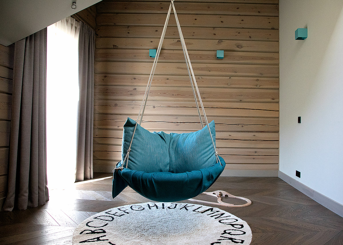 „Pradėjus kurti interjerą, šeimoje augo tik vienas vaikas. Jis dar miegojo su mama, todėl iš vieno miegamojo padarėme žaidimų kambarį. Pakabinome sūpuokles, pritvirtinome kablių laipioti, priderinome šviestuvus – kambarys vaikams augant galės keistis“, – kalba D. Jovaišienė.