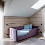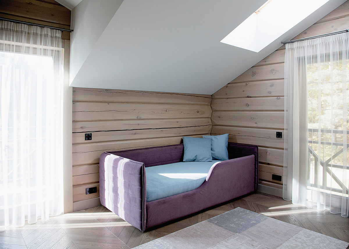 Šis miegamasis kol kas taip pat apstatytas minimaliai. Architektės nuomone, tokio amžiaus vaikams dar nereikia daug baldų. Kaip ir rąstinis namas, šios erdvės keisis natūraliai.