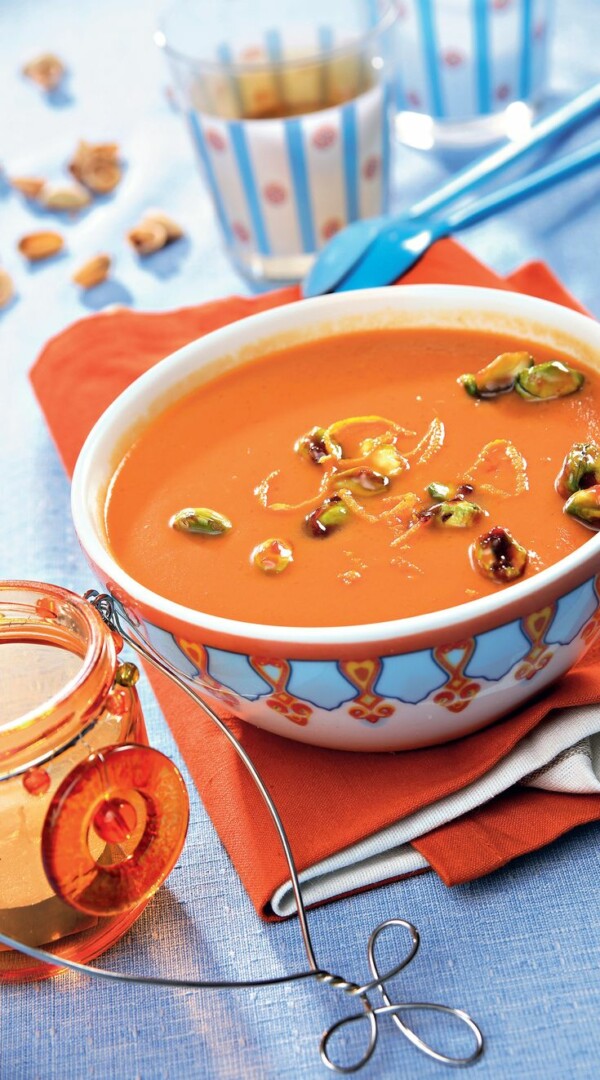 Sutrinkite puodo turinį į tyrę, jei reikia, dar pasūdykite ir iškart patiekite papuošę karamelizuotomis pistacijomis ir apelsino žievelėmis.