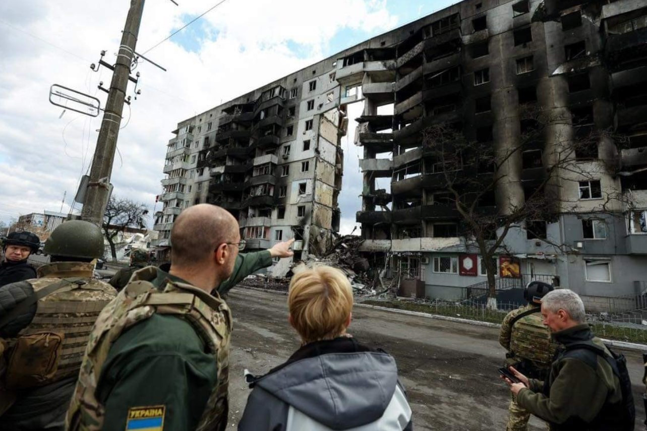 Vaikščiodama po nusiaubtą miestą premjerė teigė pamačiusi „rusiškojo pasaulio“ pergalės simbolius – artilerija bei raketomis apšaudytus gyvenamuosius daugiabučius namus.