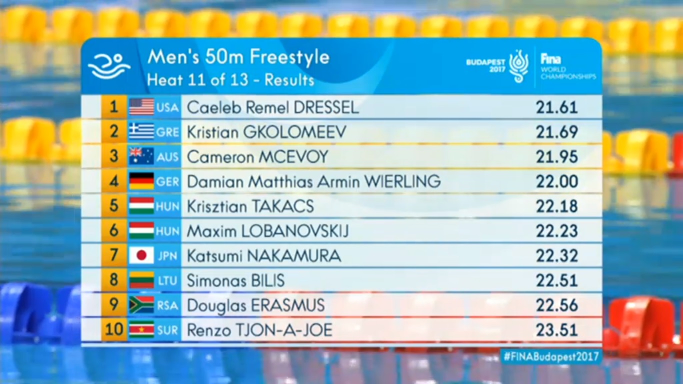 Atrankos nugalėtoju tapo amerikietis Caebelis Dresselis, finišavęs per 50,08 sek.