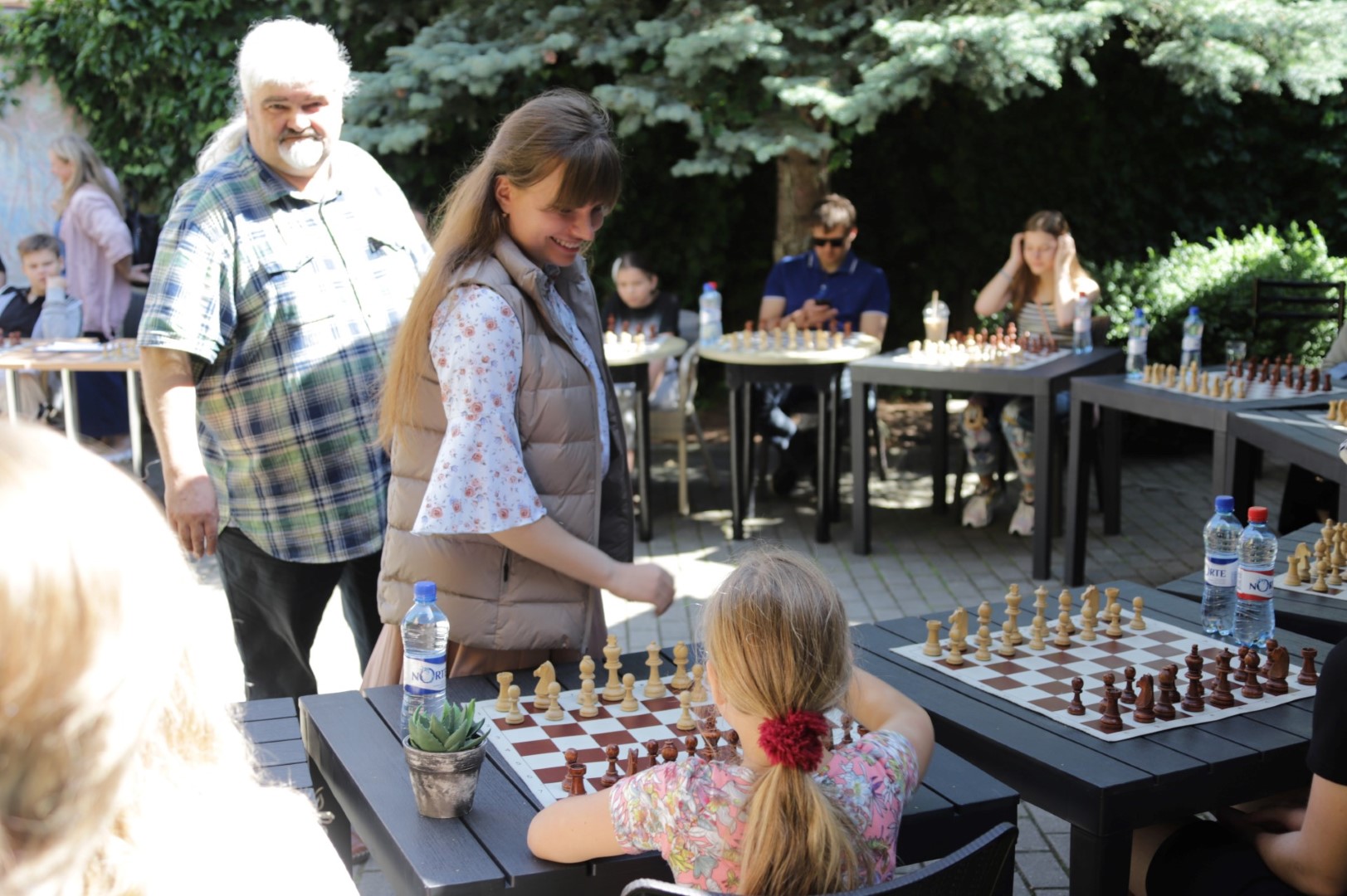 „Sūnus nuo mažumės labai mėgo žaisti šachmatais, net darželyje mokė kitus vaikus. Jam septyneri. Pagal savo amžiaus grupę jis jauniausias žaidėjas, o tarptautiniame turnyre Panevėžyje užėmė antrą vietą. Pradėjo žaisti šachmatais telefone, o šiandien varžysis ir su Olena“, – pasakojo A. Liobikienės mokinio mama, žiūrėdama, kaip žaidžia sūnus.
