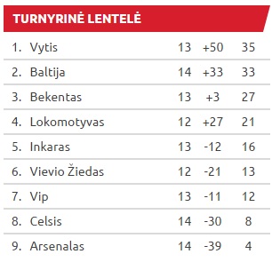 „Vytis“ iškovojo pergalę 3:1 ir dabar turi surinkę 35 taškus. „Baltija“ atsilieka dviem taškais. Šis panevėžiečių pralaimėjimas leido jų artimiausiems persekiotojams Vilniaus „Bekentui“ apkirpti atsilikimą iki šešių taškų – sostinės klubas įspūdingai atsitiesė ir nugalėjo Mažeikių VIP 5:4.