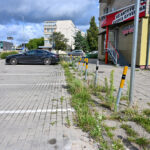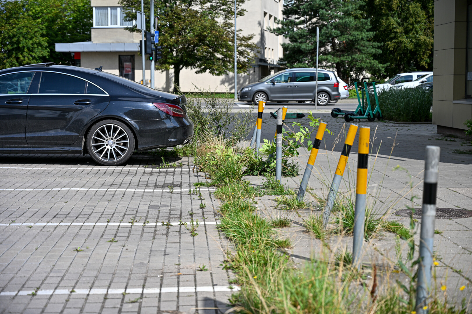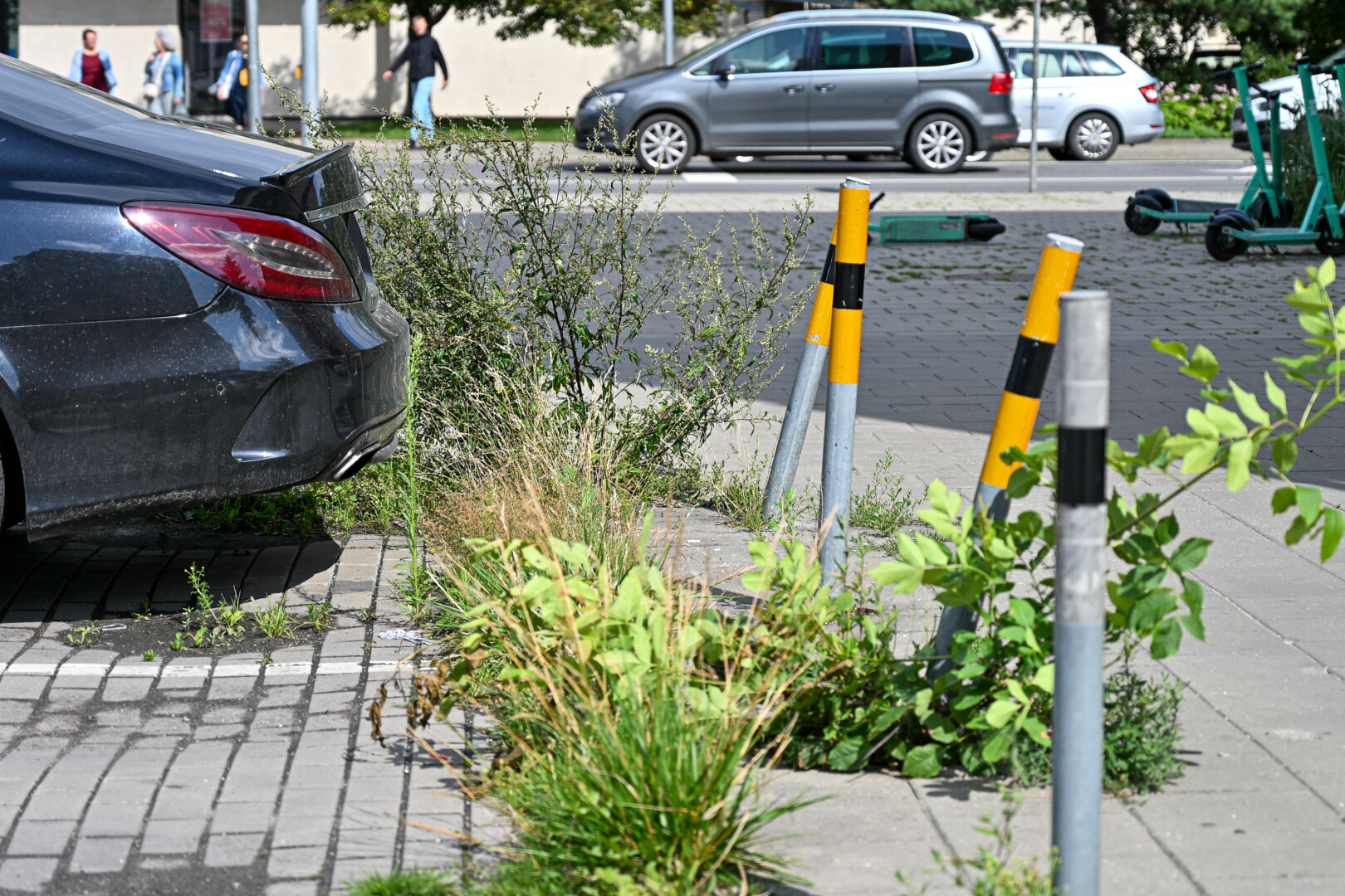 Pėsčiųjų takas ilgą laiką buvo smagiai apžėlęs netgi pačiame miesto centre, šalia J. Basanavičiaus ir Vilniaus gatvių sankryžos. Čia greta prekybos centro esančios pernai apmokestintos automobilių aikštelės žolė tarp plytelių siekė kone iki kelių. Tarp plytelių kerojo netgi kiečiai.