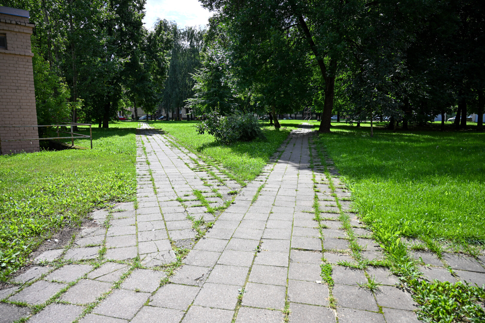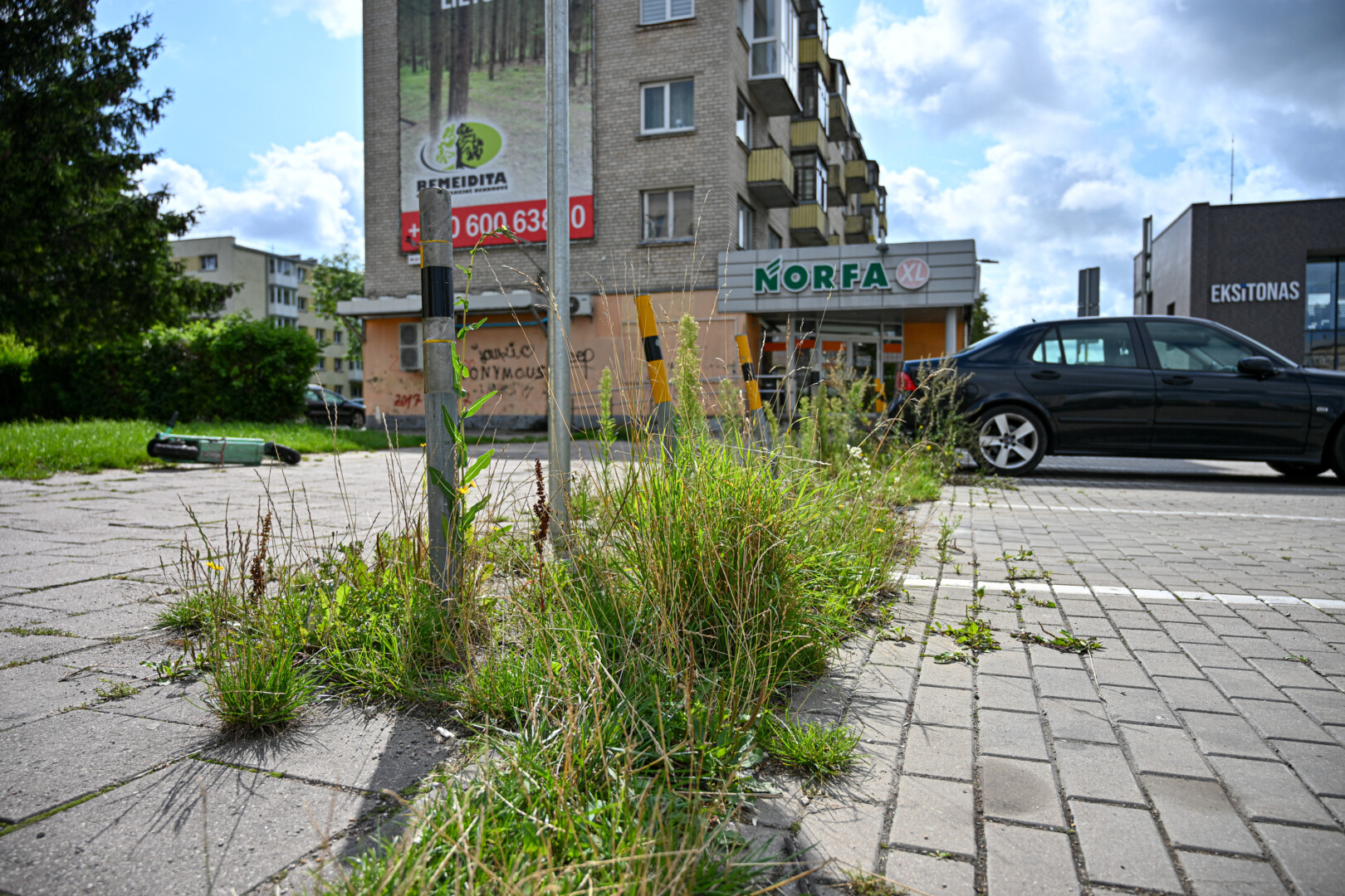 Tarp plytelių prižėlusi žolė aukščiu vietomis jau lenkia šienaujamą augmeniją.