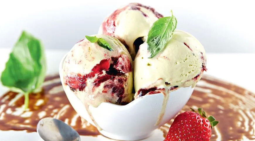Bazilikų ledai su braškių ir balzaminio acto padažu