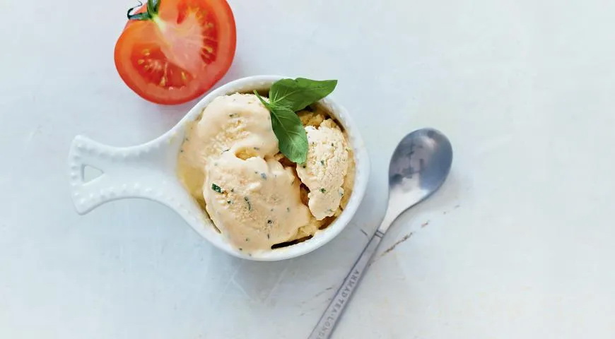 Suplakite trynius su milteliniu cukrumi. Nepaliaudami plakti, sudėkite maskarponę, pomidorų masę. Įmaišykite bazilikus. Paruoškite ledus ledų gamybos aparatu arba šaldiklyje.