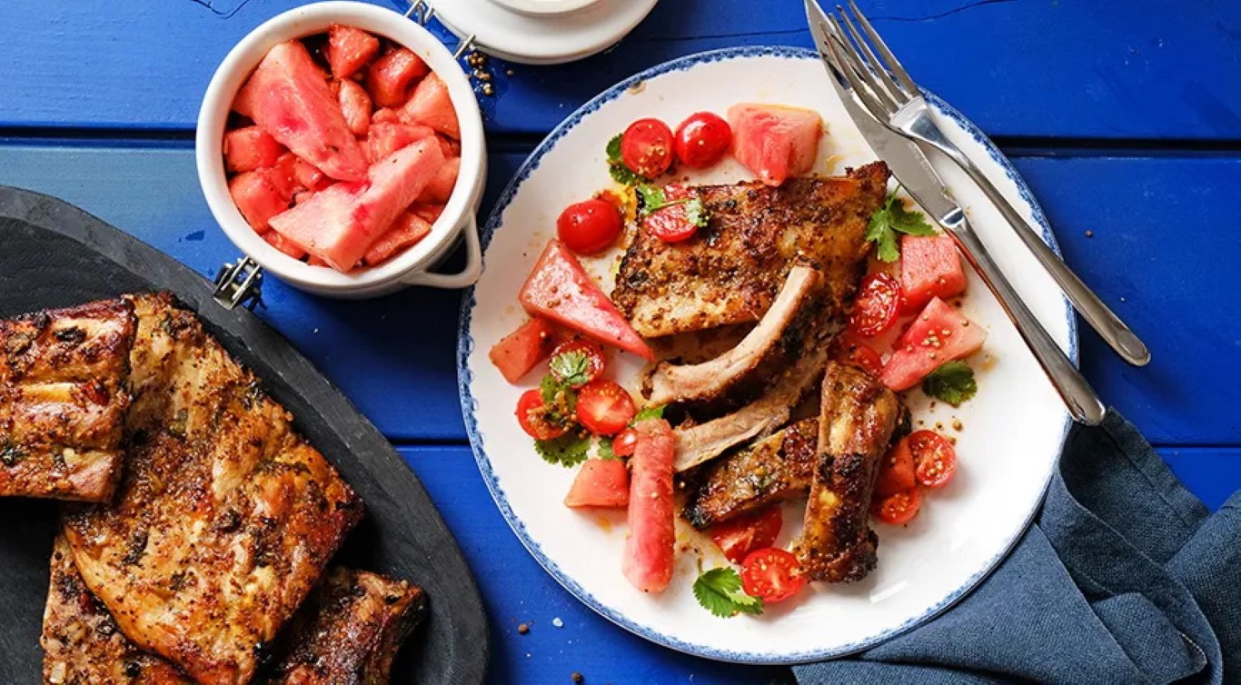 Šonkauliukai grilyje su greitai marinuotu arbūzu