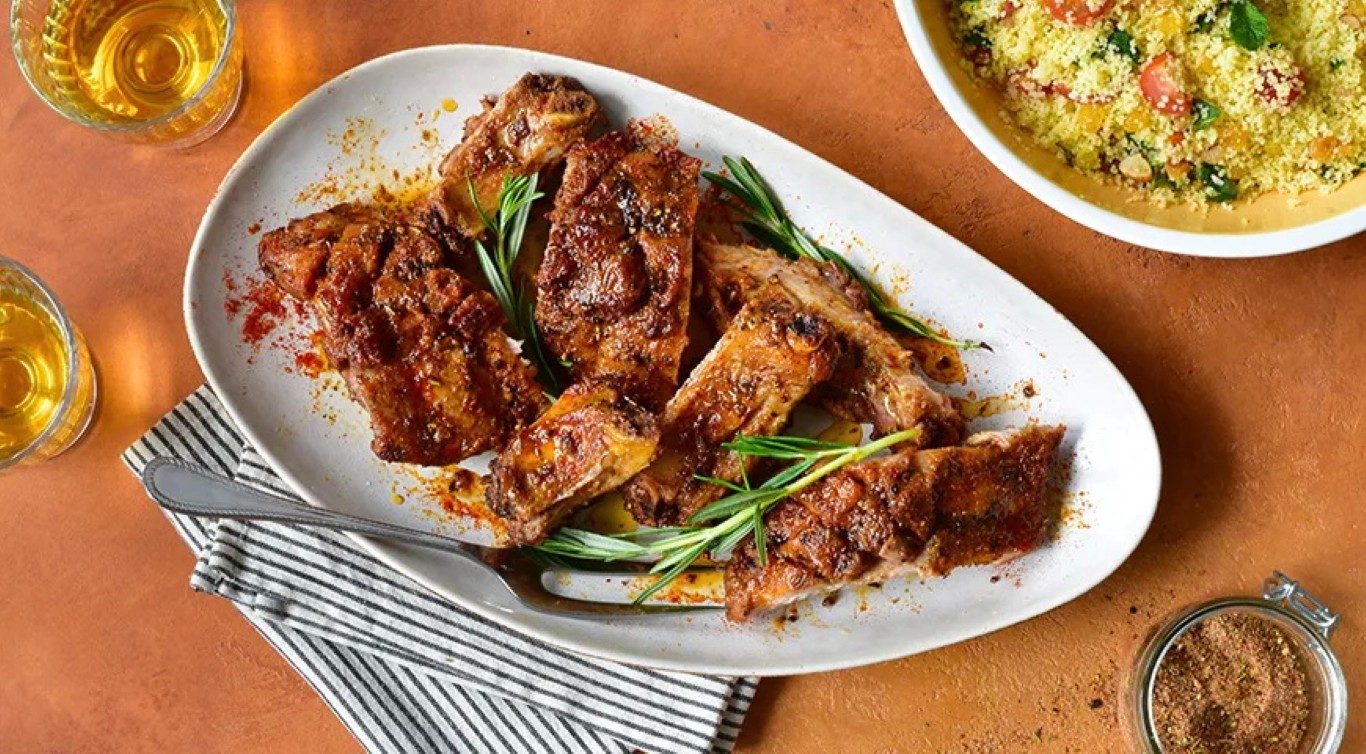 Reikės (4 porcijoms): 1,5 kg nepjaustytų kiaulių šonkaulių, alyvuogių aliejaus; padažui: 1 šaukšto rupios jūros druskos, 1 šaukšto maltų paprikų, 1 šaukštelio kalendrų, 1 šaukštelio kuminų, 1 šaukštelio juodųjų pipirų žirnelių, 1 šaukštelio kvapiųjų pipirų žirnelių, 1 šaukštelio svogūnų miltelių, 1 šaukštelio česnakų miltelių, 0,5 šaukštelio Kajeno paprikų, 0,5 šaukštelio džiovintų raudonėlių, 0,5 šaukštelio džiovintų čiobrelių; patiekti: rozmarino šakelių.